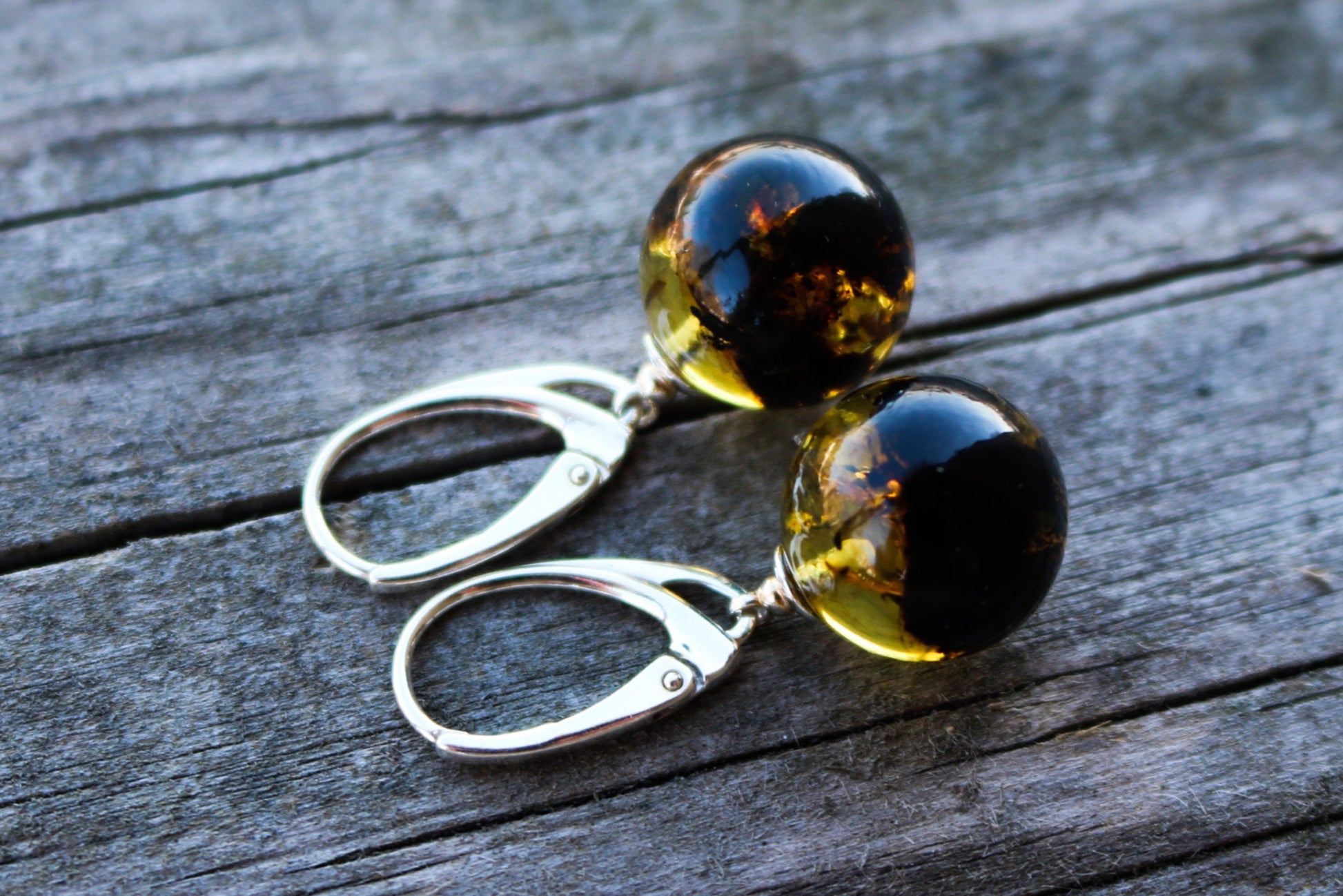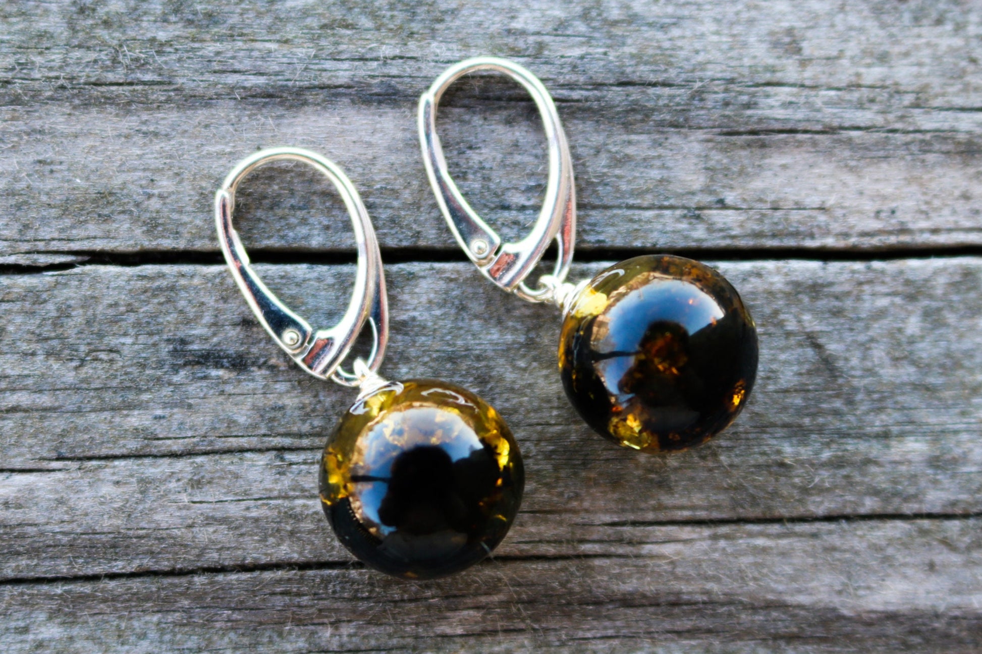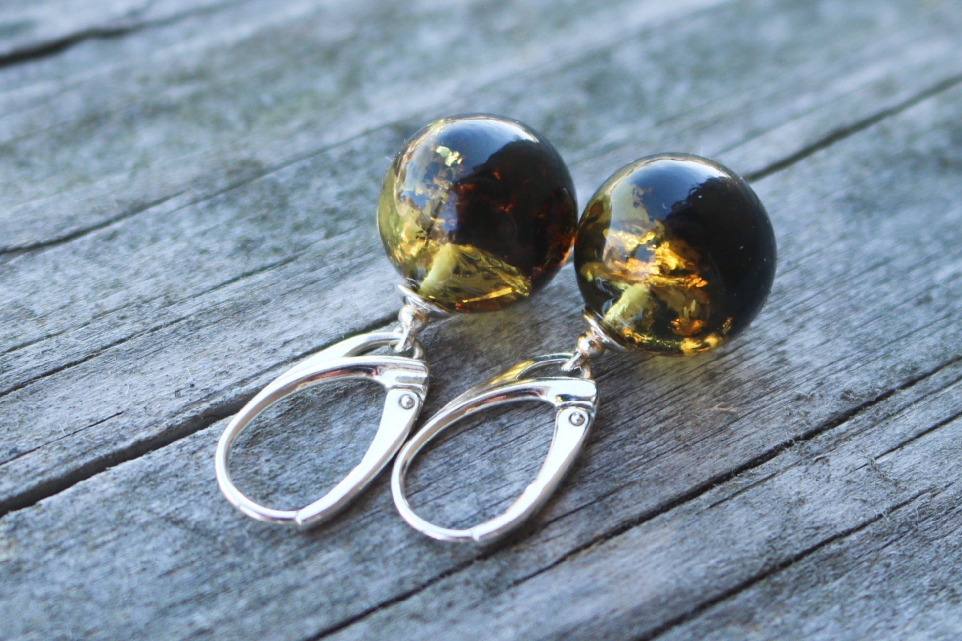 Ball earrings carved out of Baltic Amber sparkling green color.