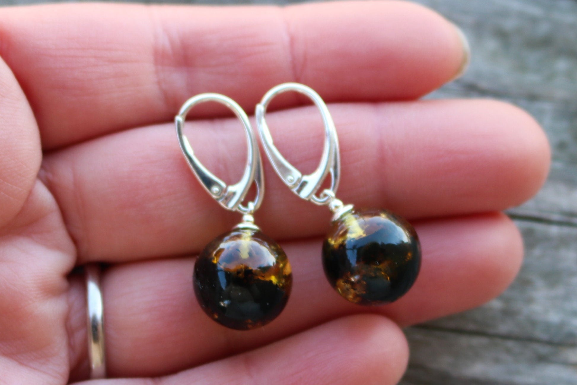 Baltic Amber Earrings Green Ball Natural Dangle 1.34" 4.4 gram 925 silver