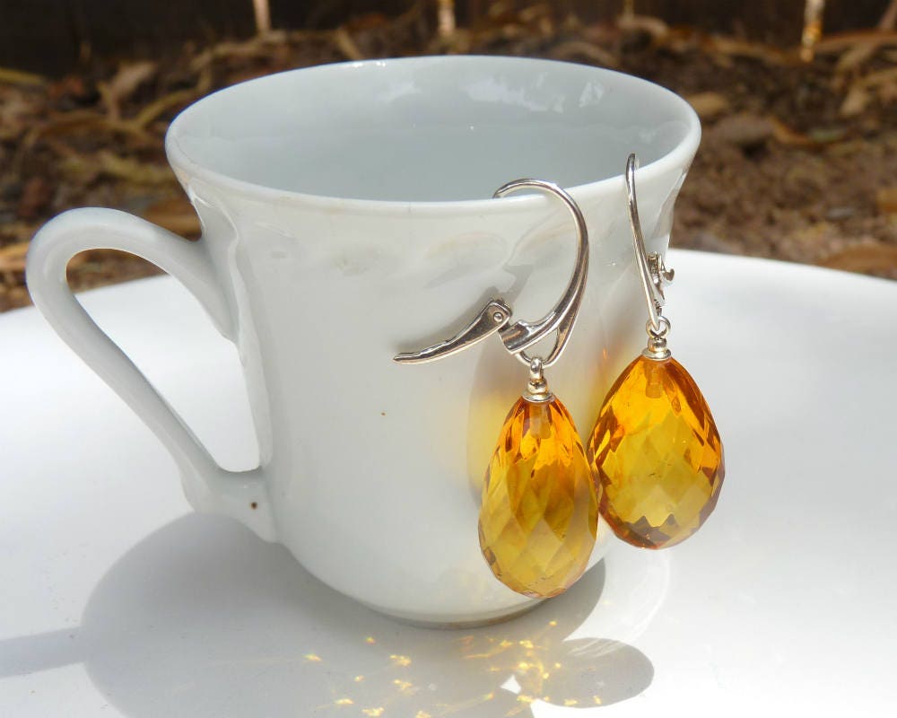 Baltic amber earrings in natural untreated honey color. Hand carved as drops, faceted and set in 925 sterling silver.