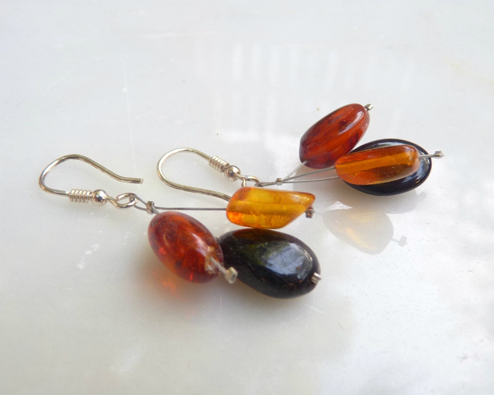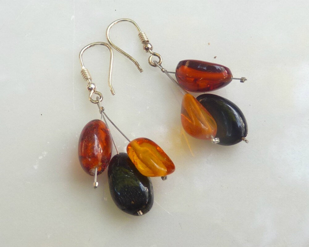 Baltic Amber Earrings Multicolor Dangle Three Stones Jewelry 1.6" 925 Silver