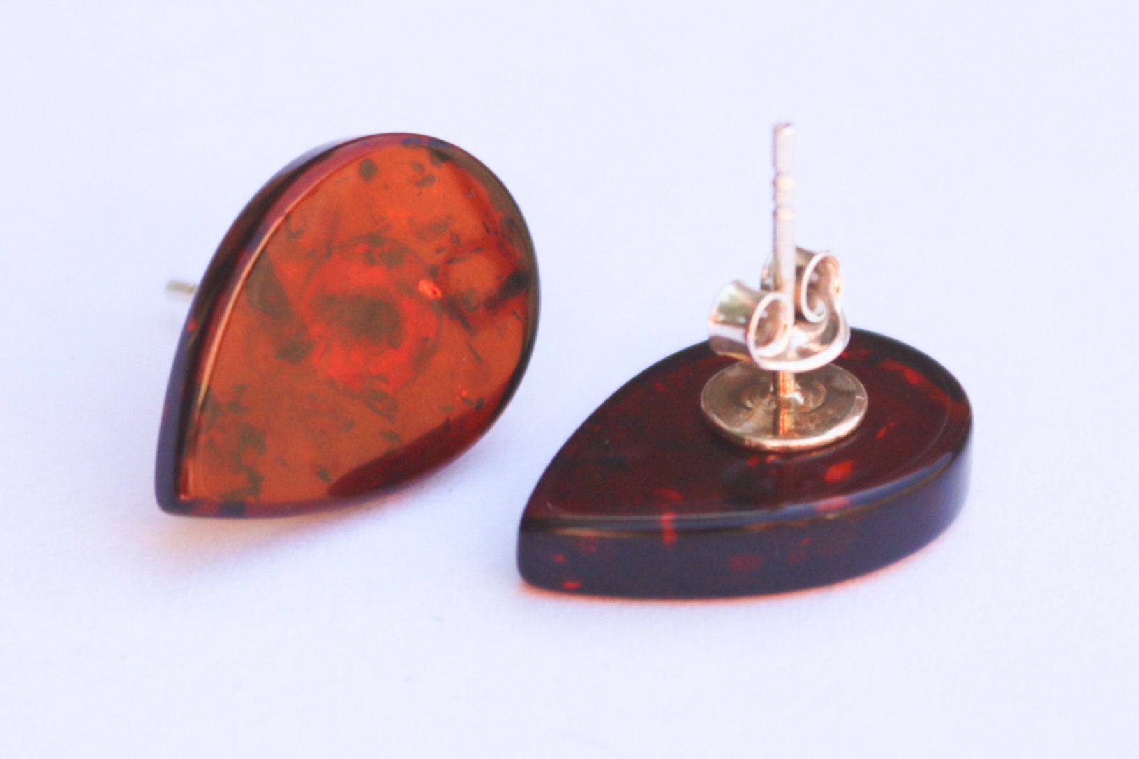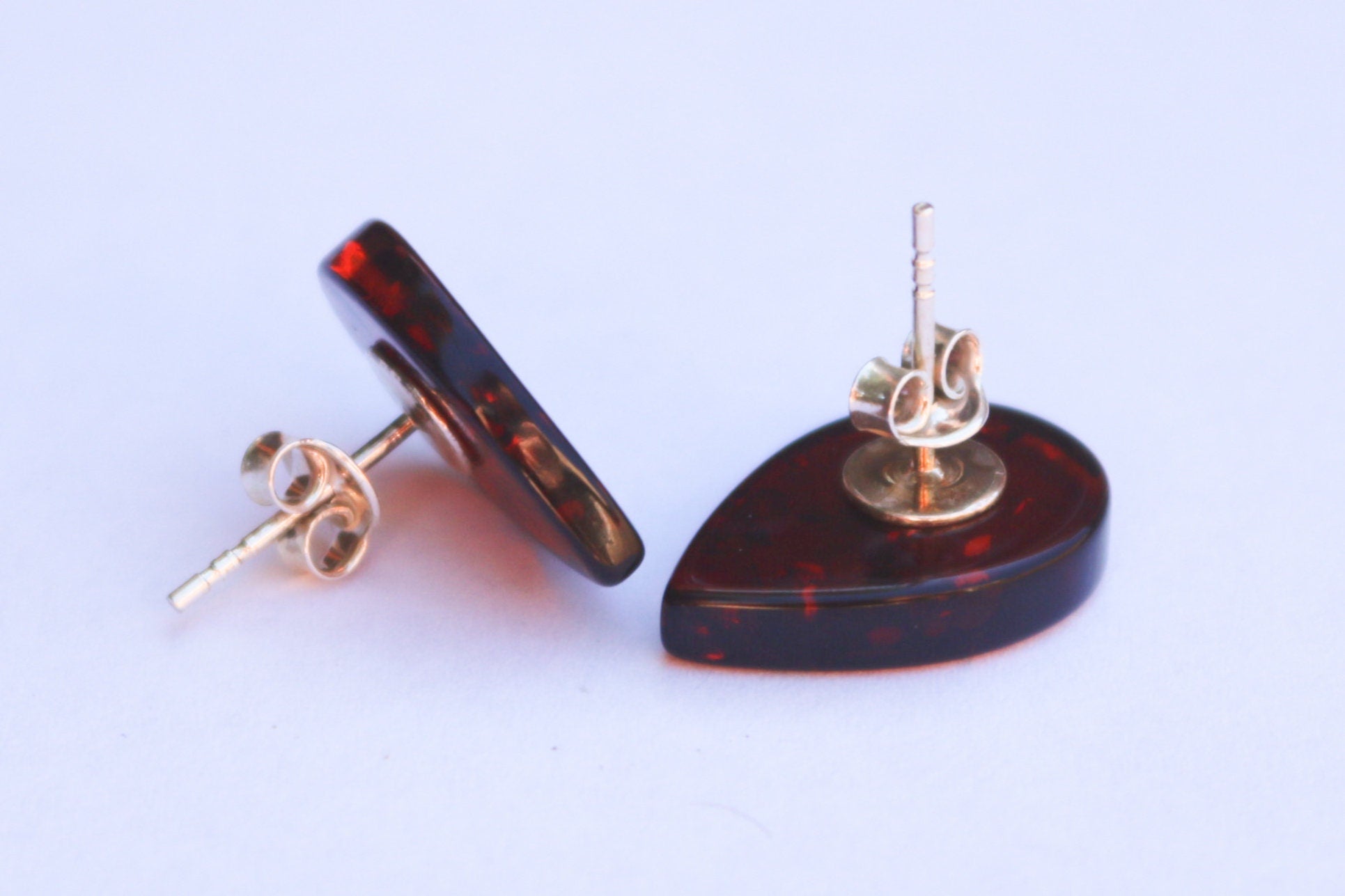 Baltic Amber hand carved leaf shaped cherry studs set in 925 sterling silver.