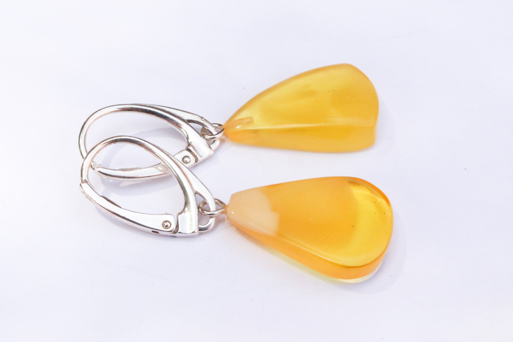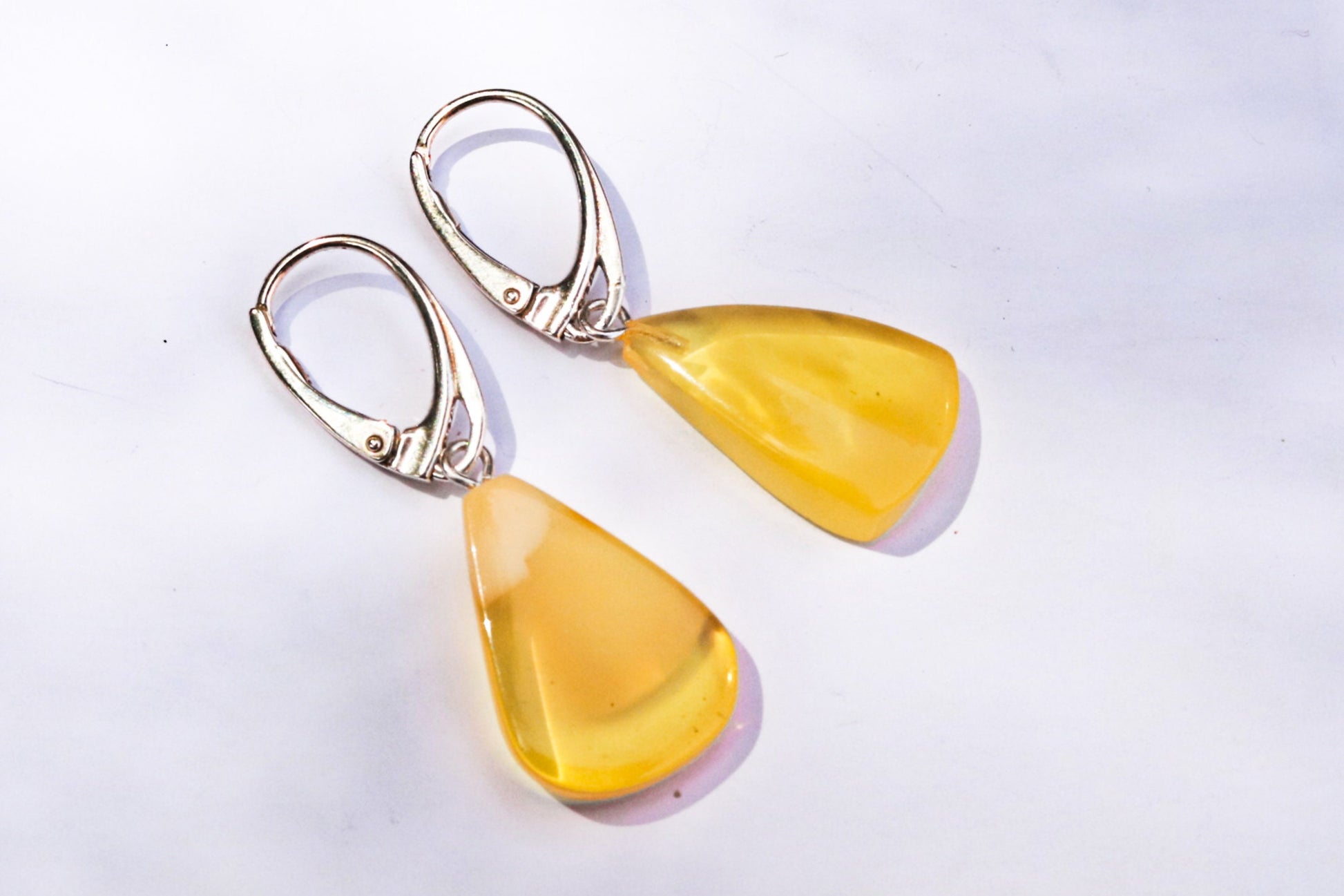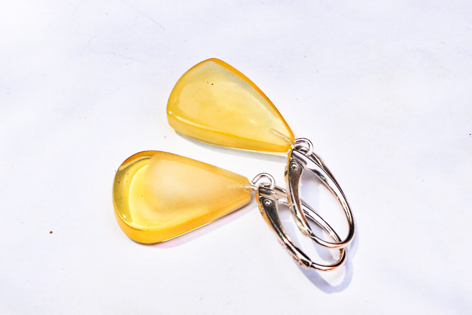 Baltic Amber earrings in cloudy yellow color. This is natural untreated semi-transparent polished amber. Each bead is hand carved out of solid amber slabs. Set in 925 sterling silver.