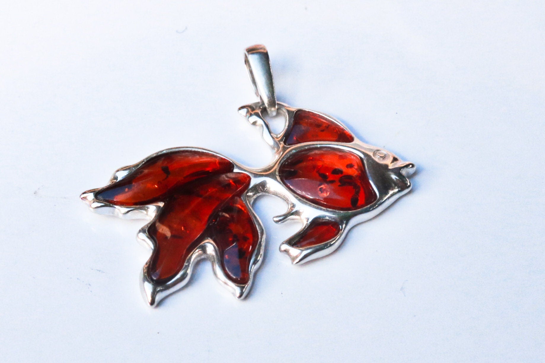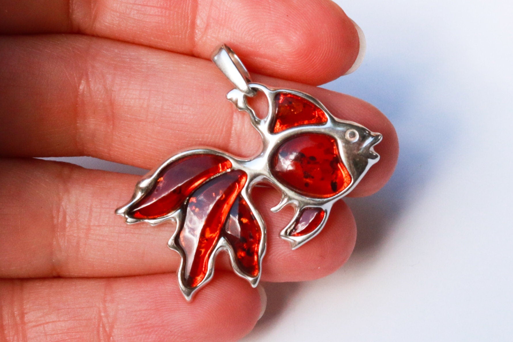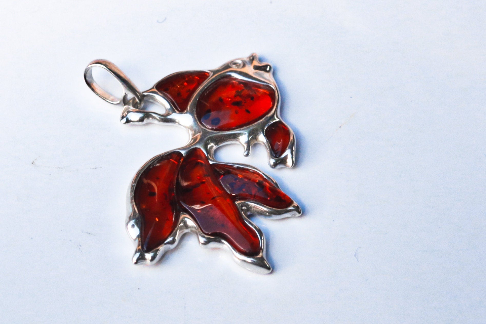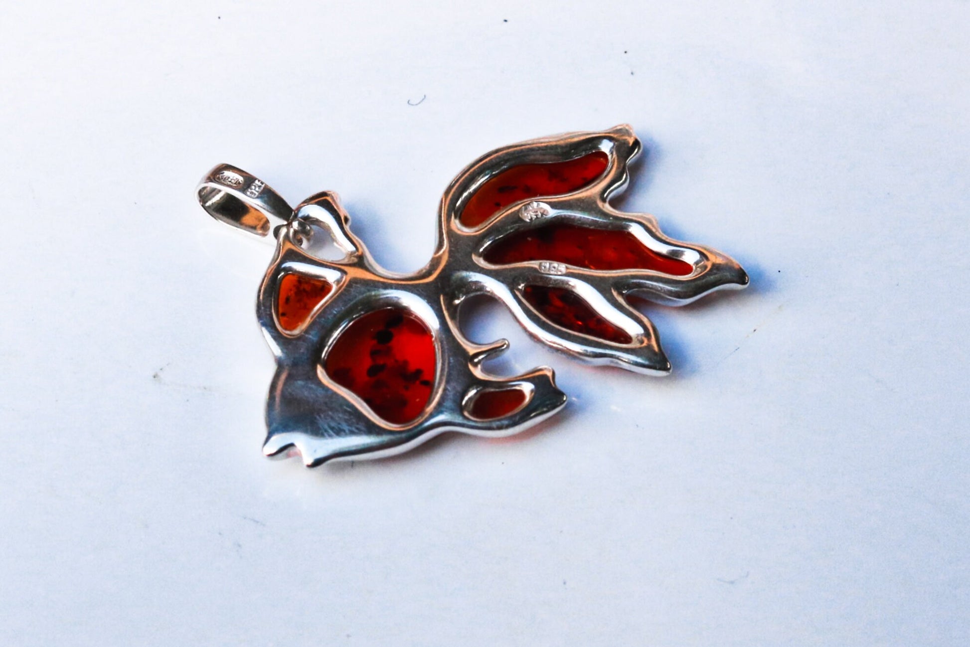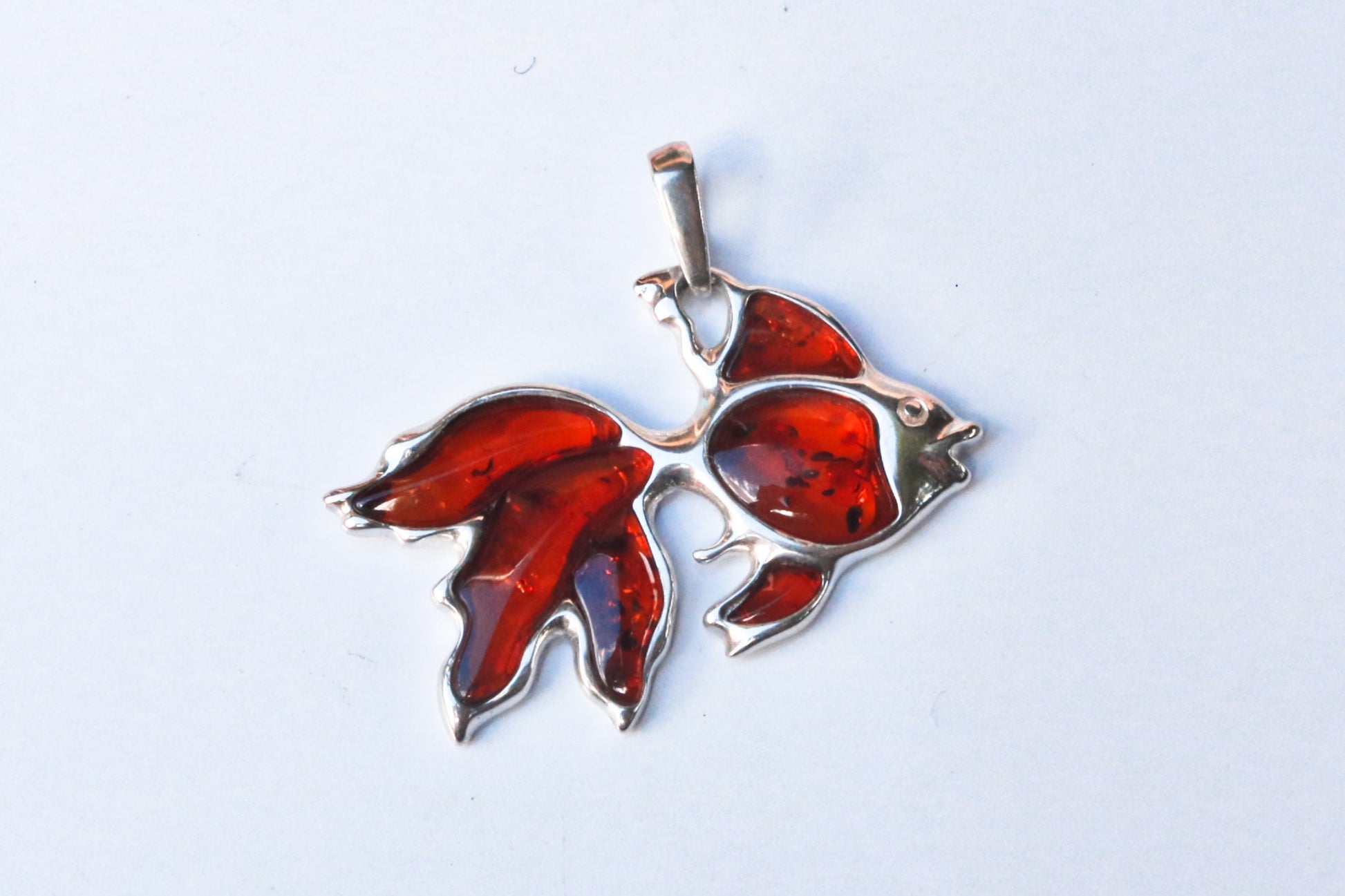 Baltic amber handcrafted fish pendant set in 925 sterling silver.