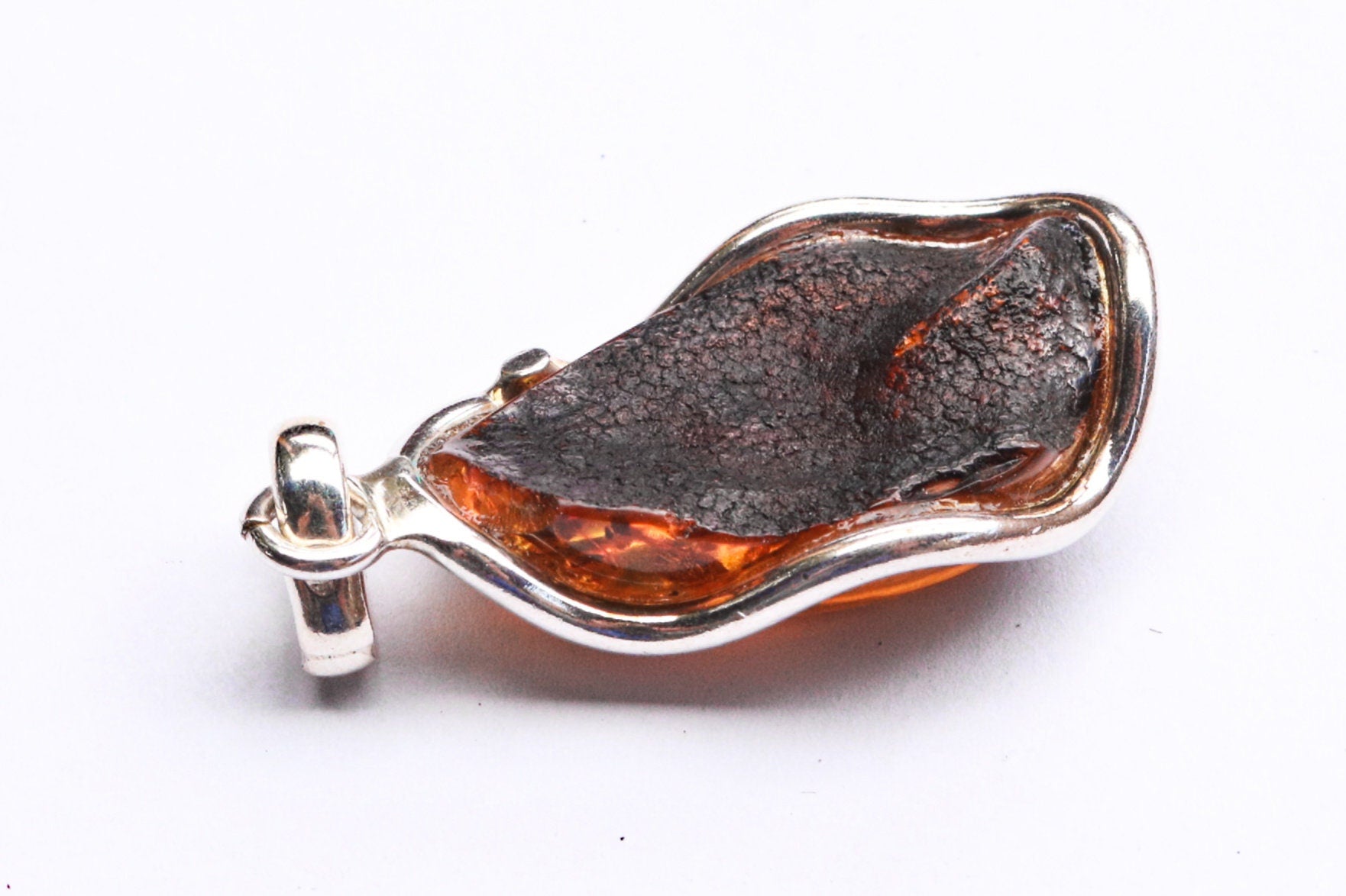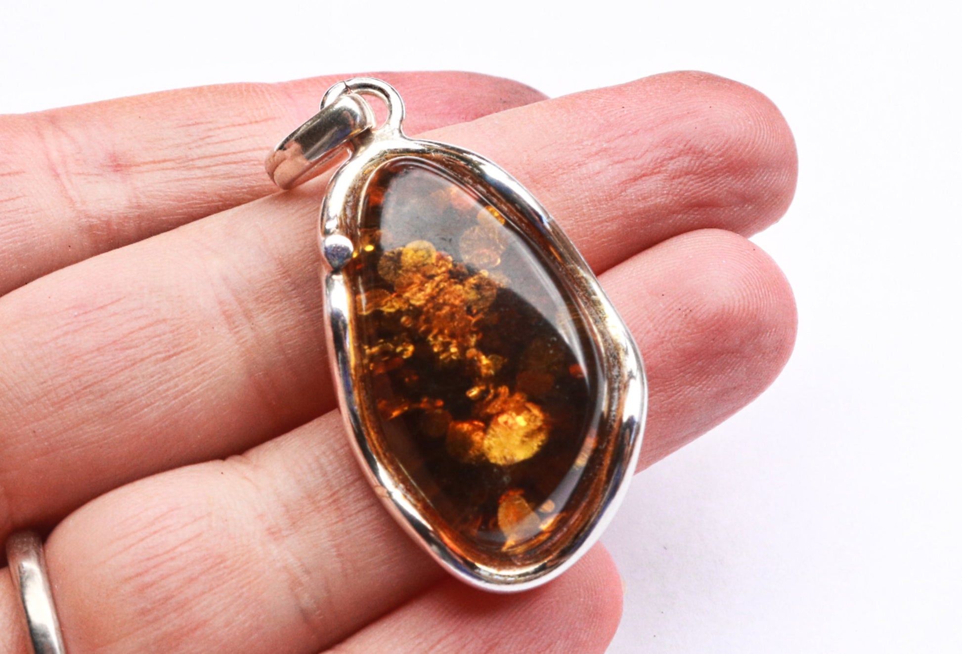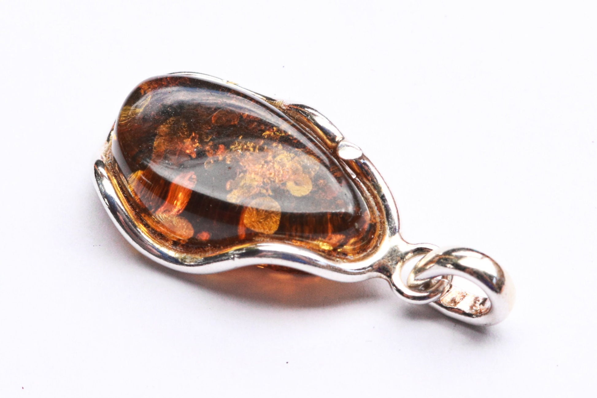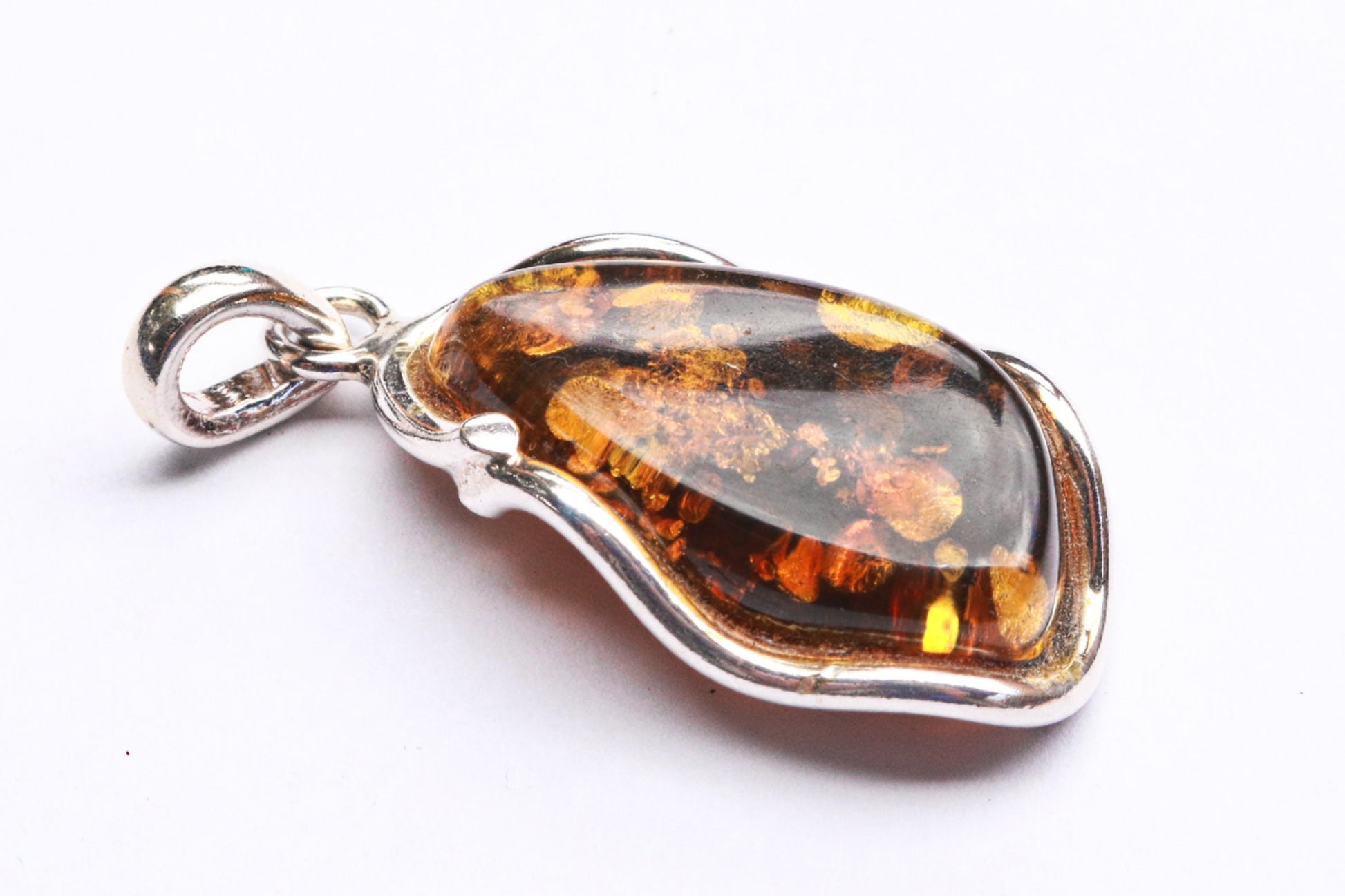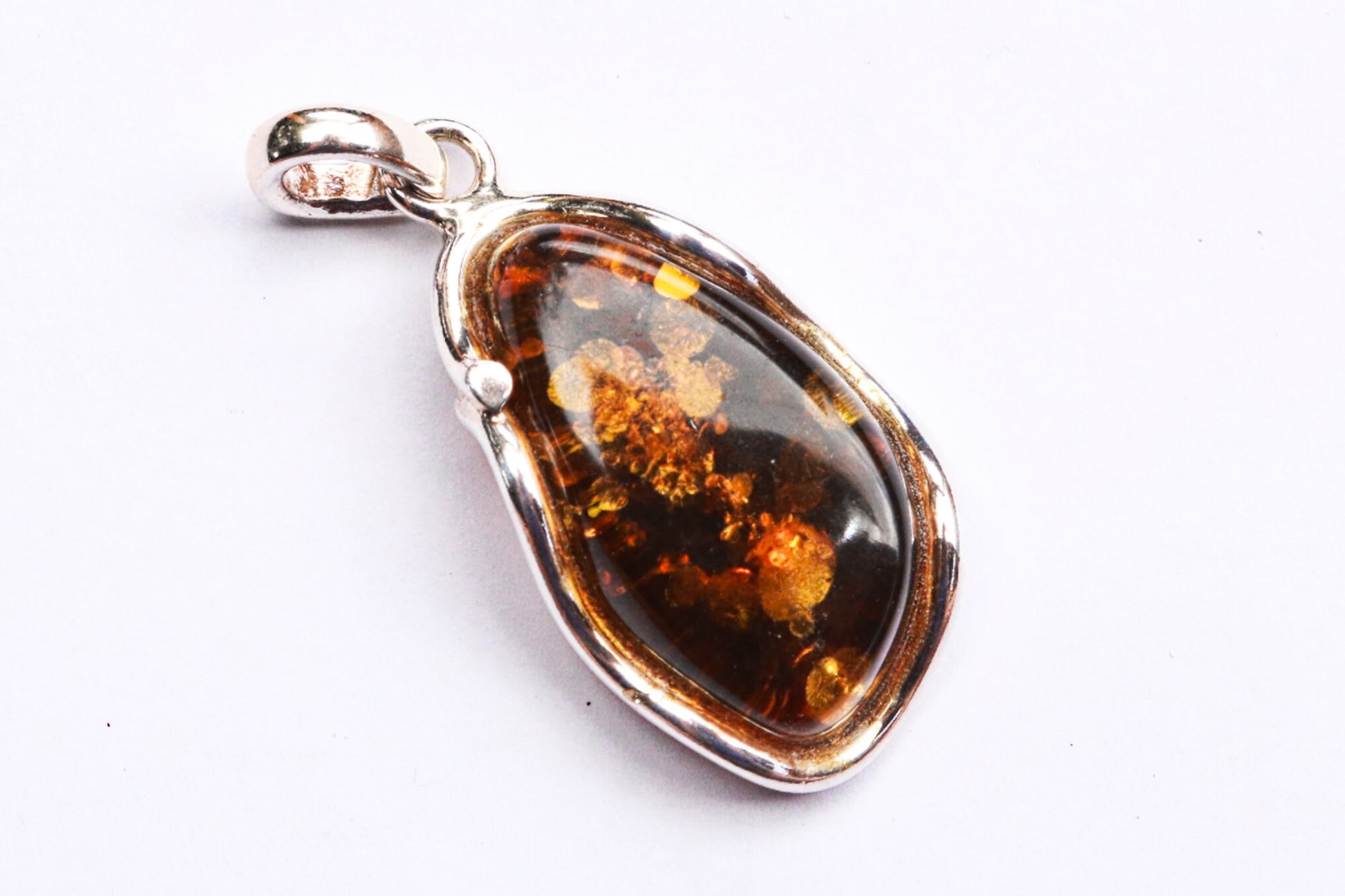 Baltic amber pendant in sparkling dark green color. Polished and set in 925 sterling silver.