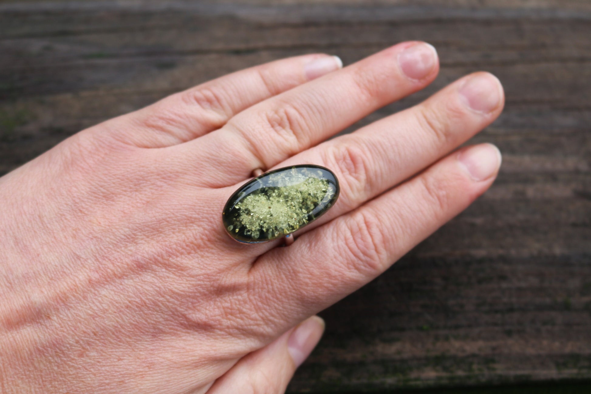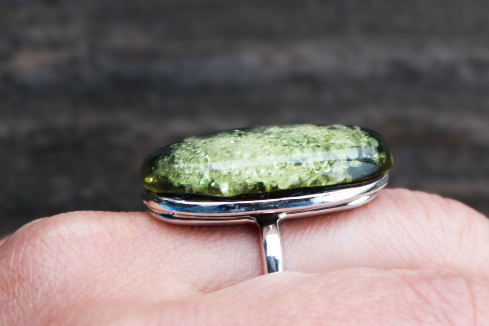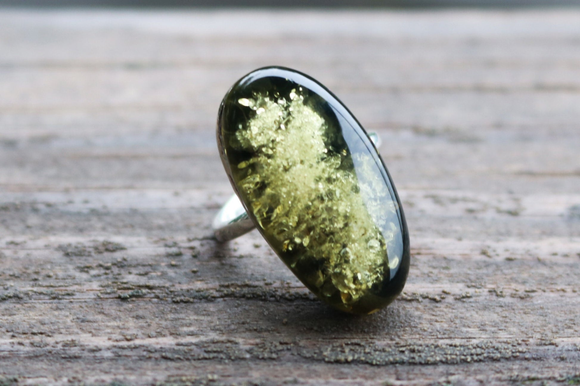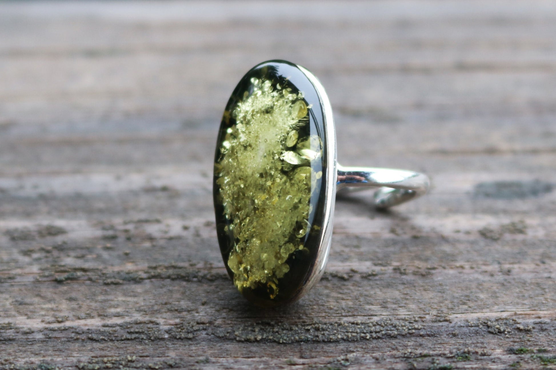 Baltic Amber oval ring in natural light green olive oil color. Set in 925 sterling silver. Will fit any size.