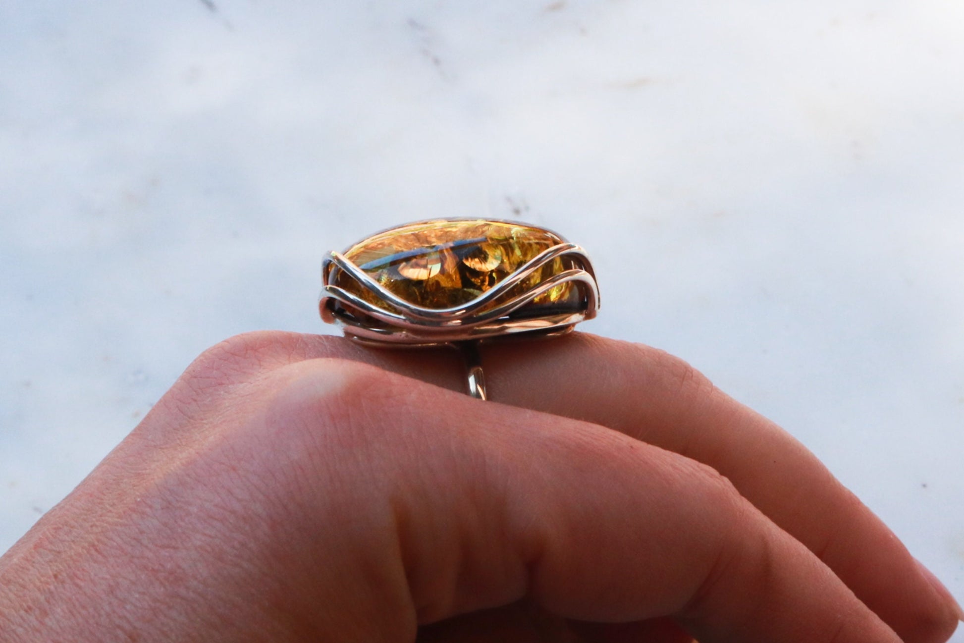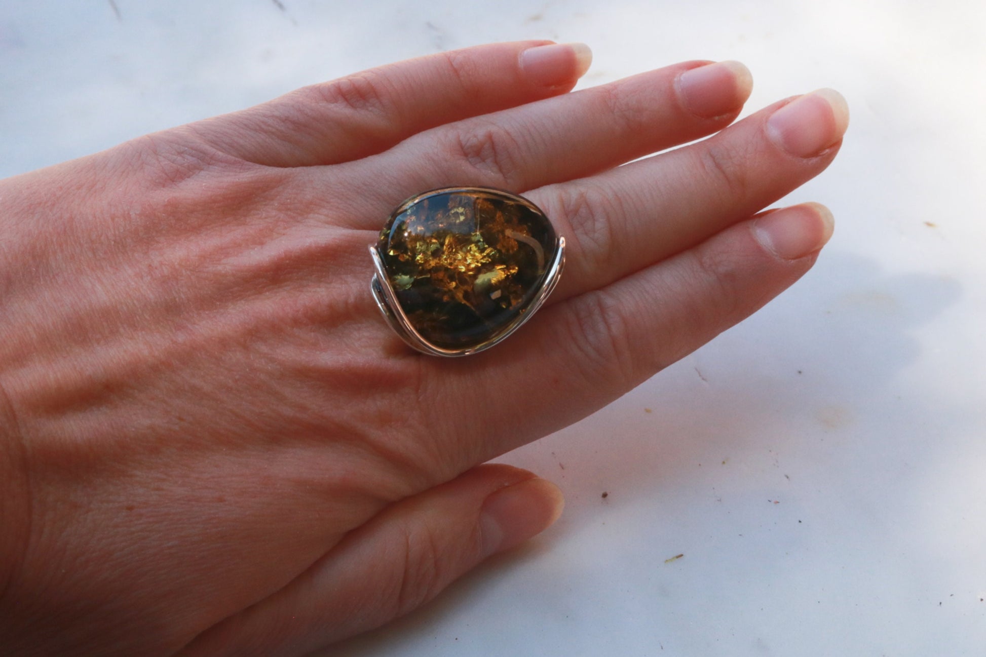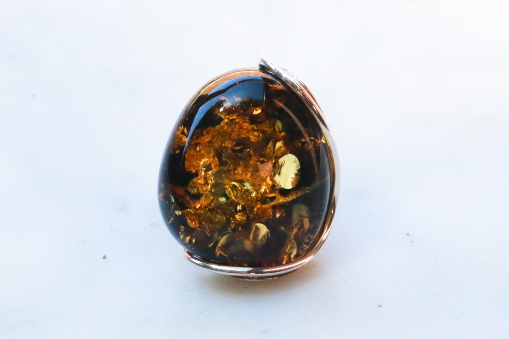 Baltic Amber ring in sparkling dark green color. Set in 925 sterling silver. Will fit any size.