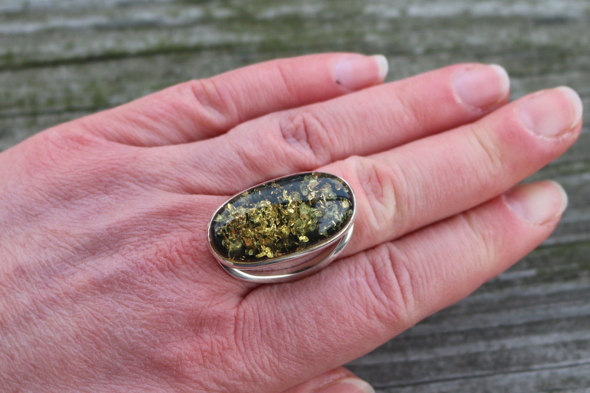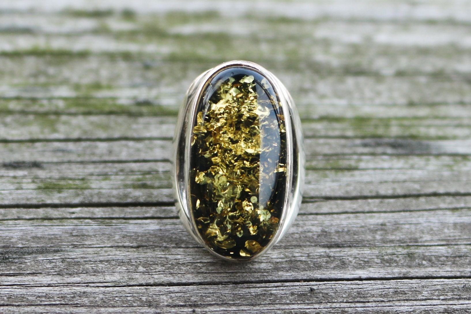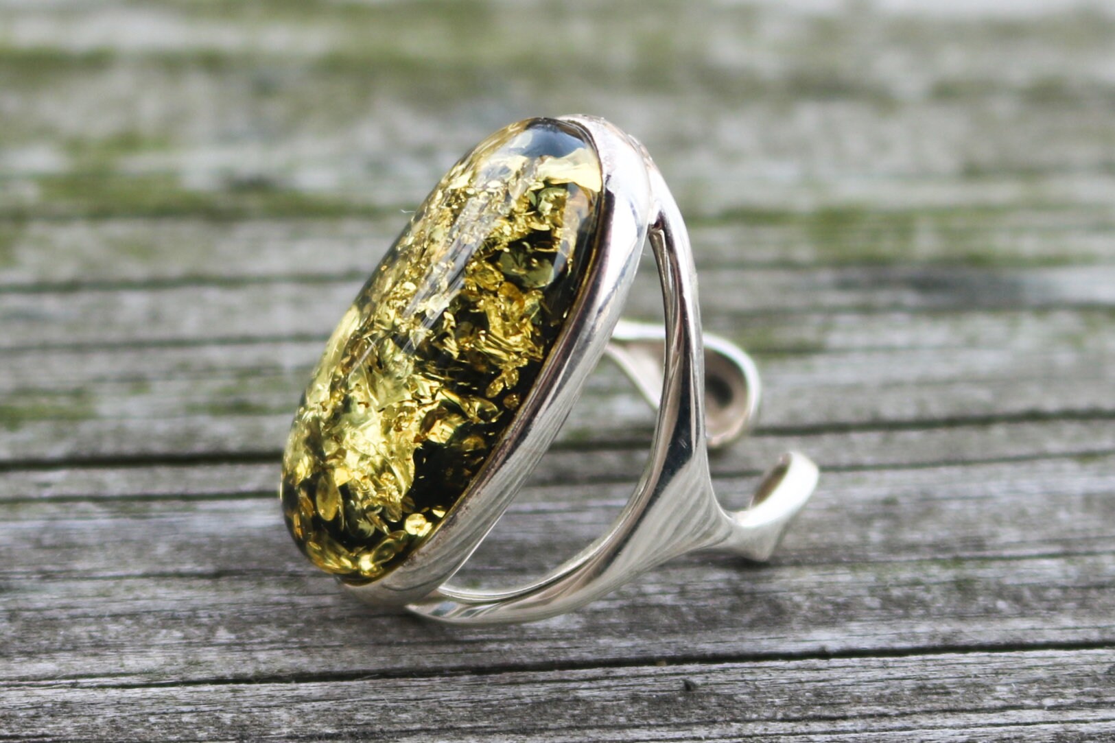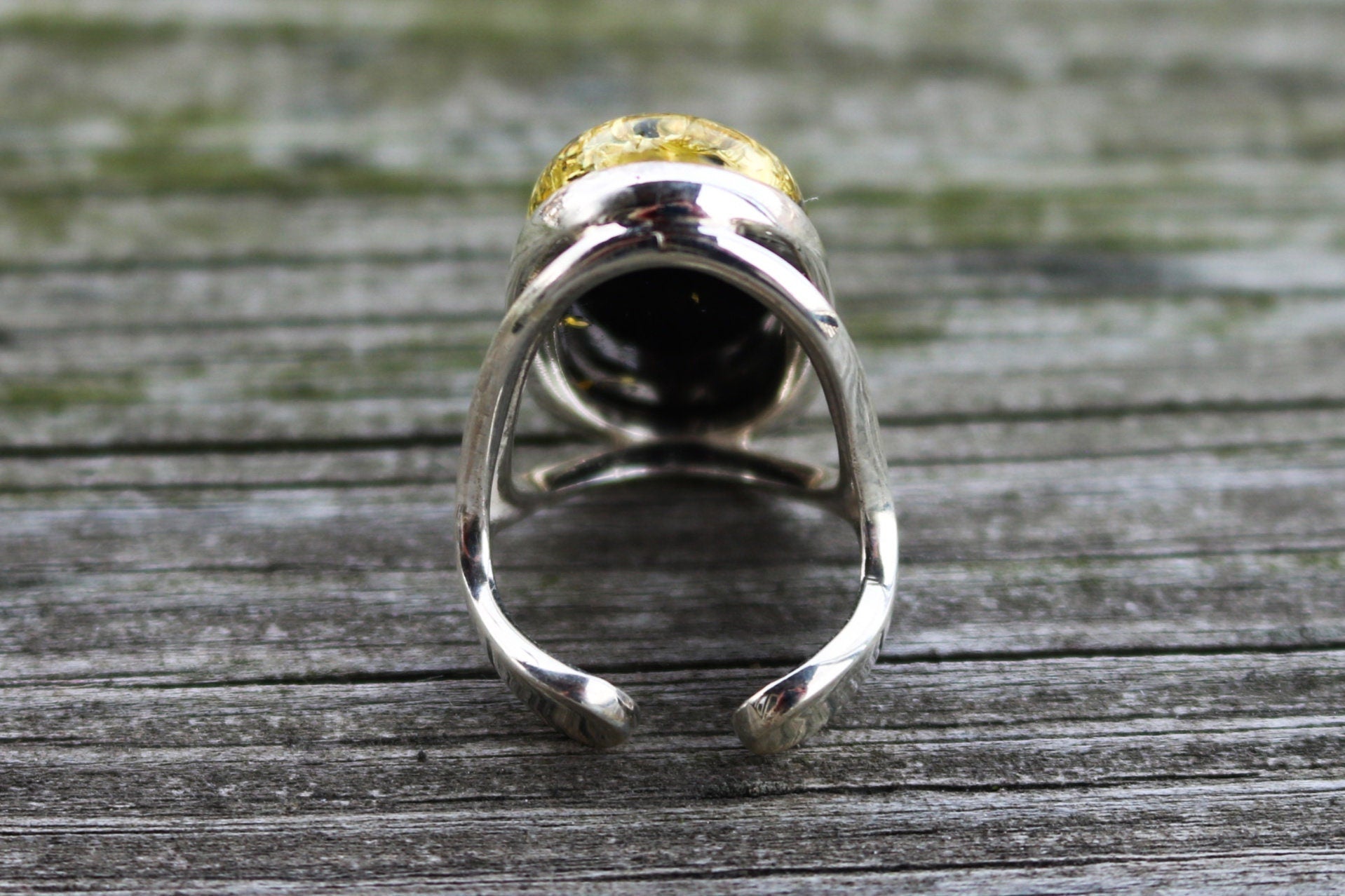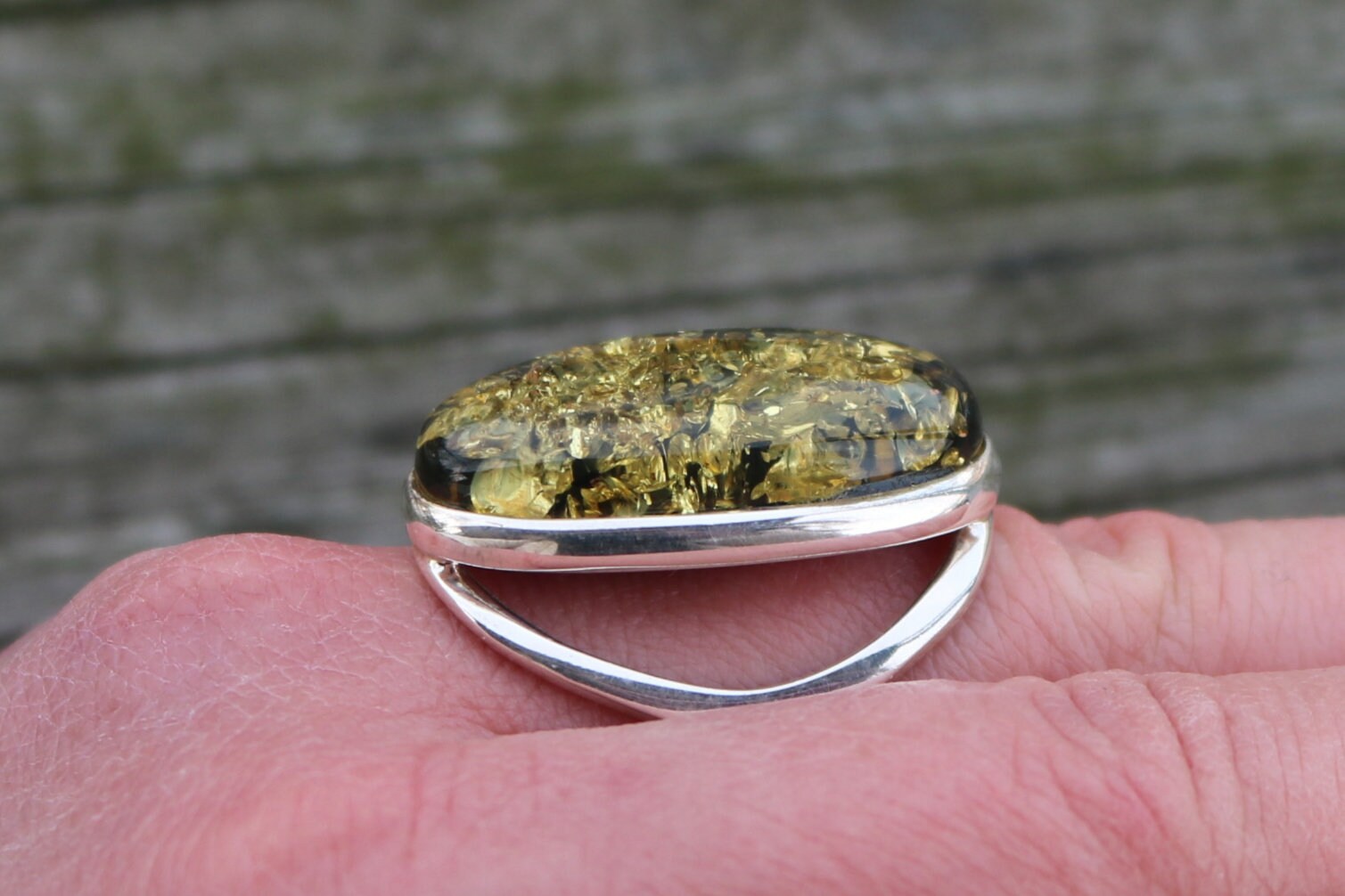 Baltic Amber ring in sparkling dark green color. Set in 925 sterling silver.
