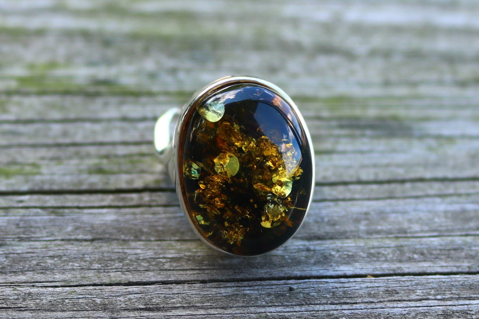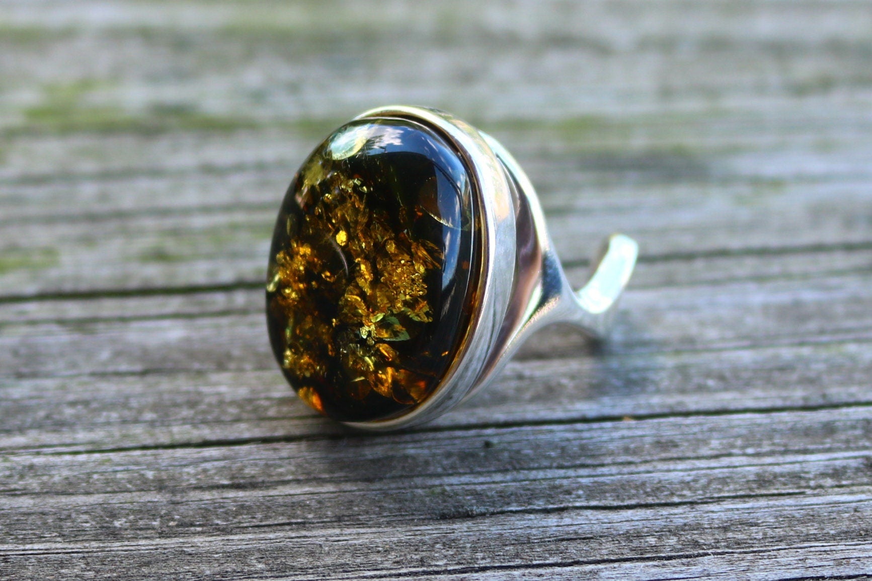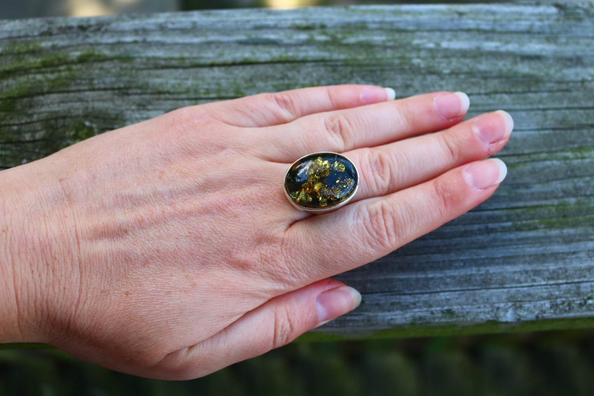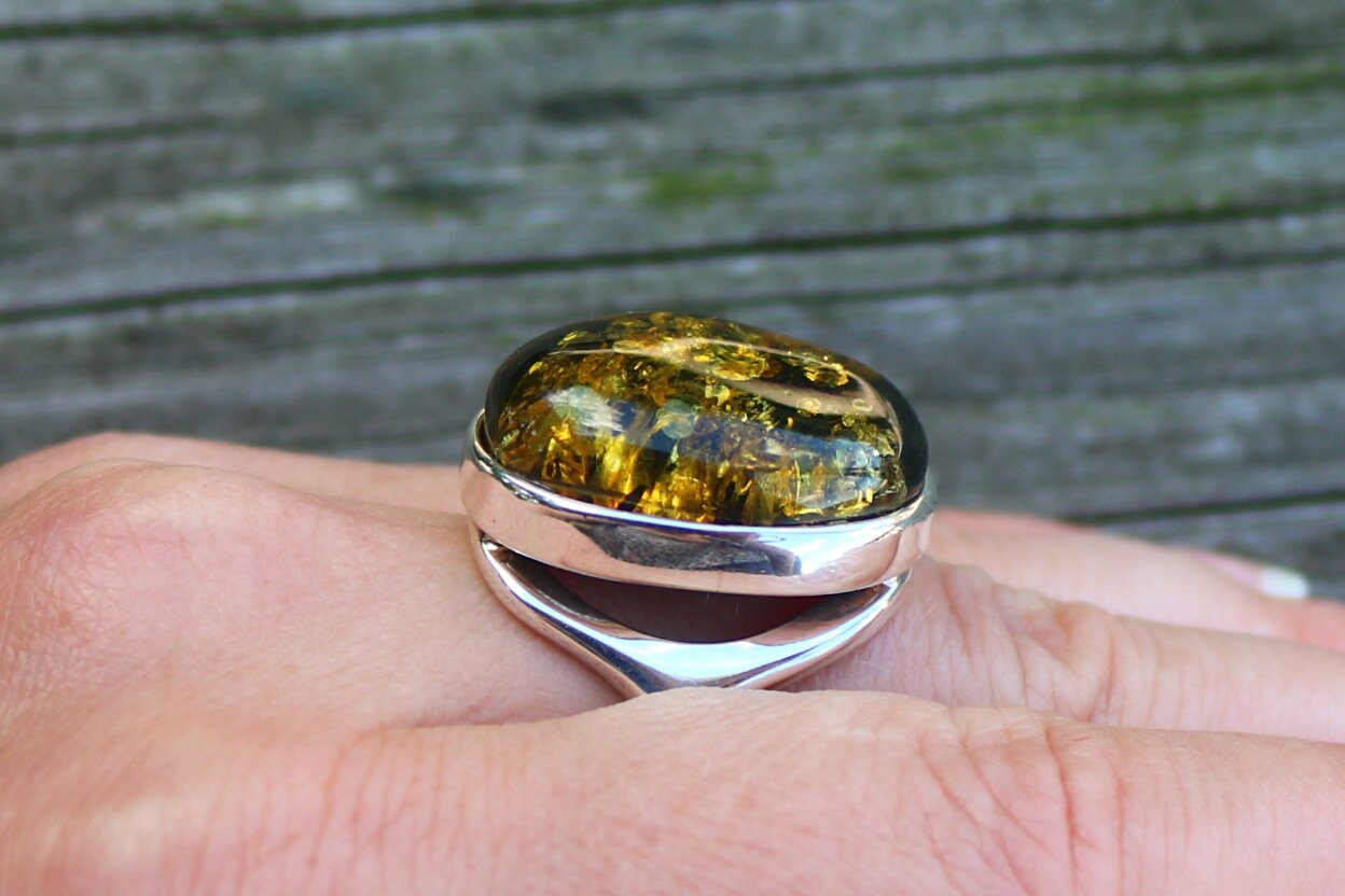 Baltic Amber Green Ring Oval Adjustable Sparkling Natural 925 Silver 13.1 gram
