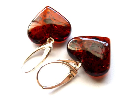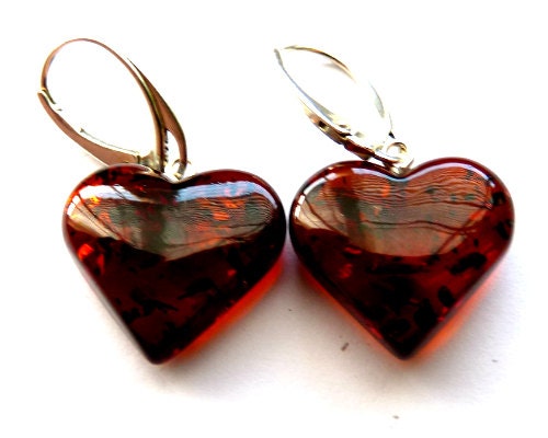 Baltic Amber Heart Earrings Cherry Natural Dangling Jewelry 1.34″ 3 gram 925 Silver