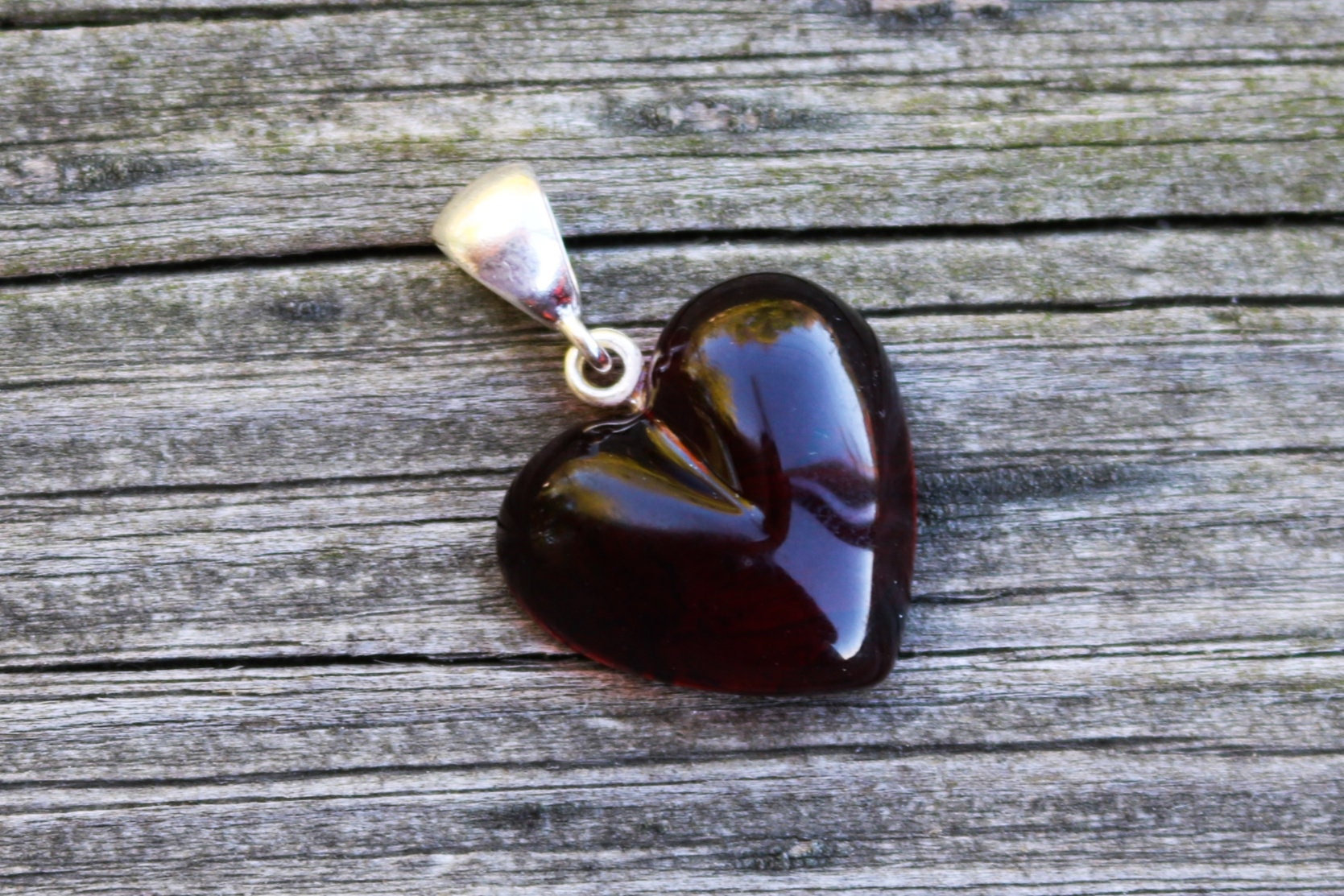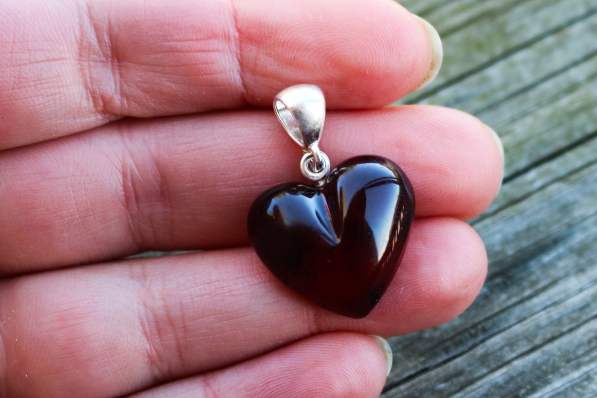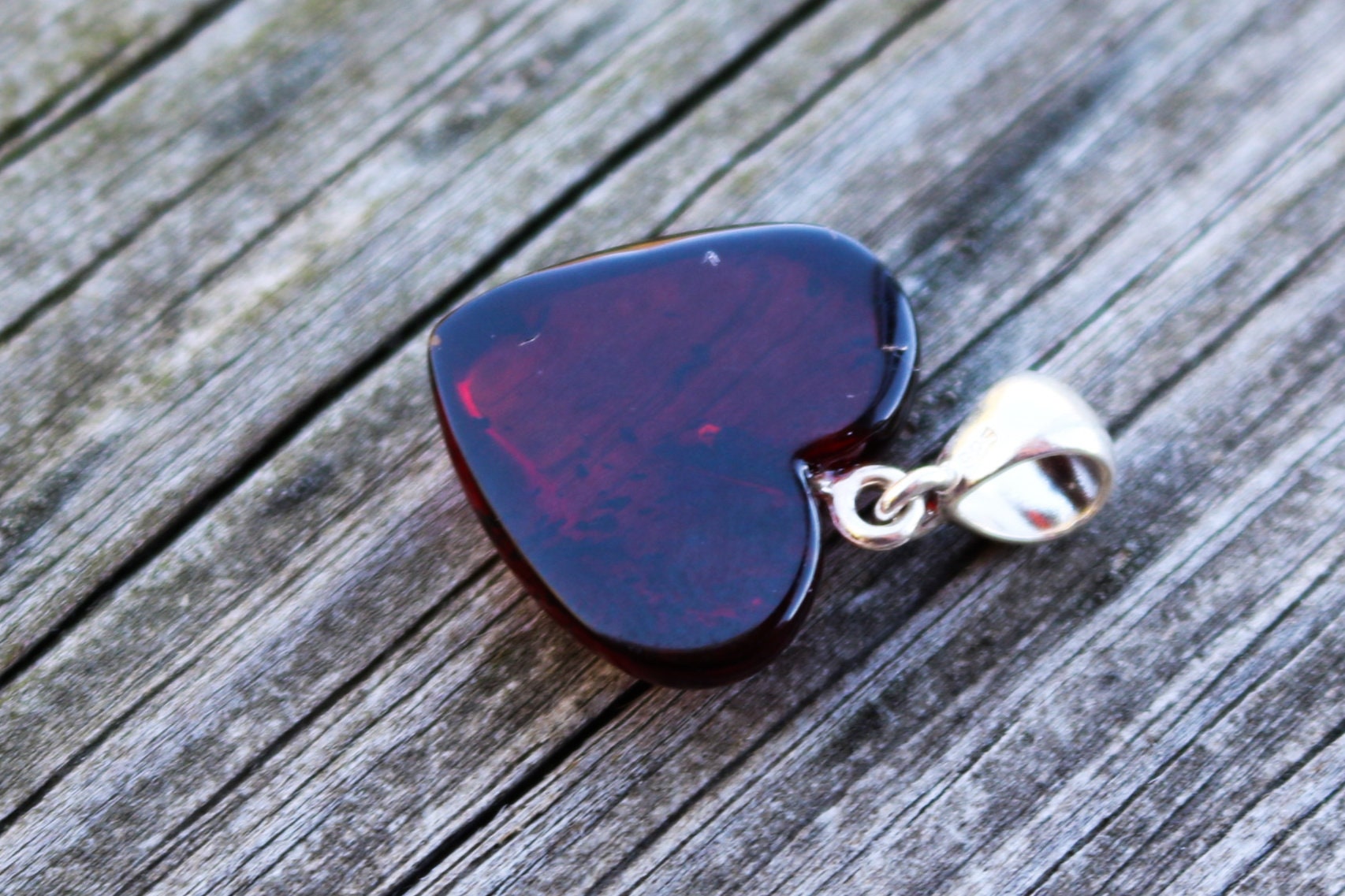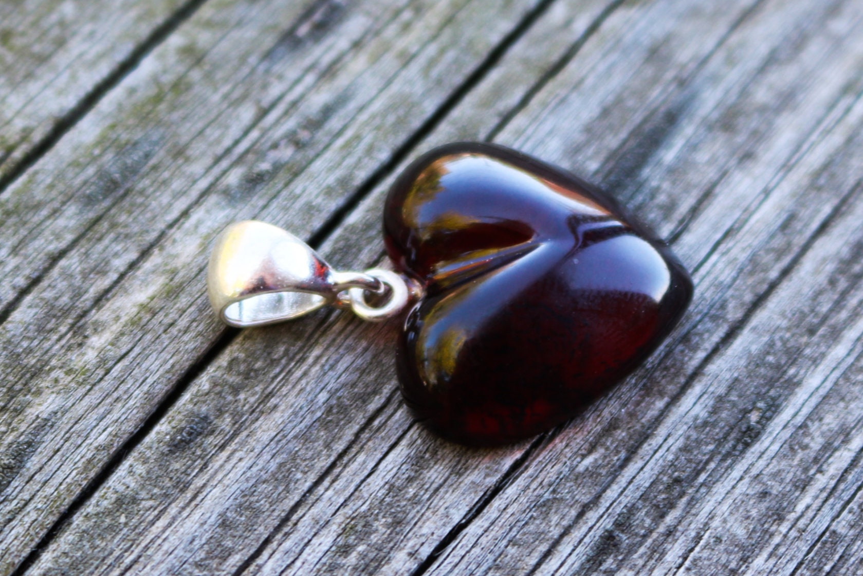 Hand carved and polished Baltic Amber heart pendant in dark cherry color. Set in 925 sterling silver.
