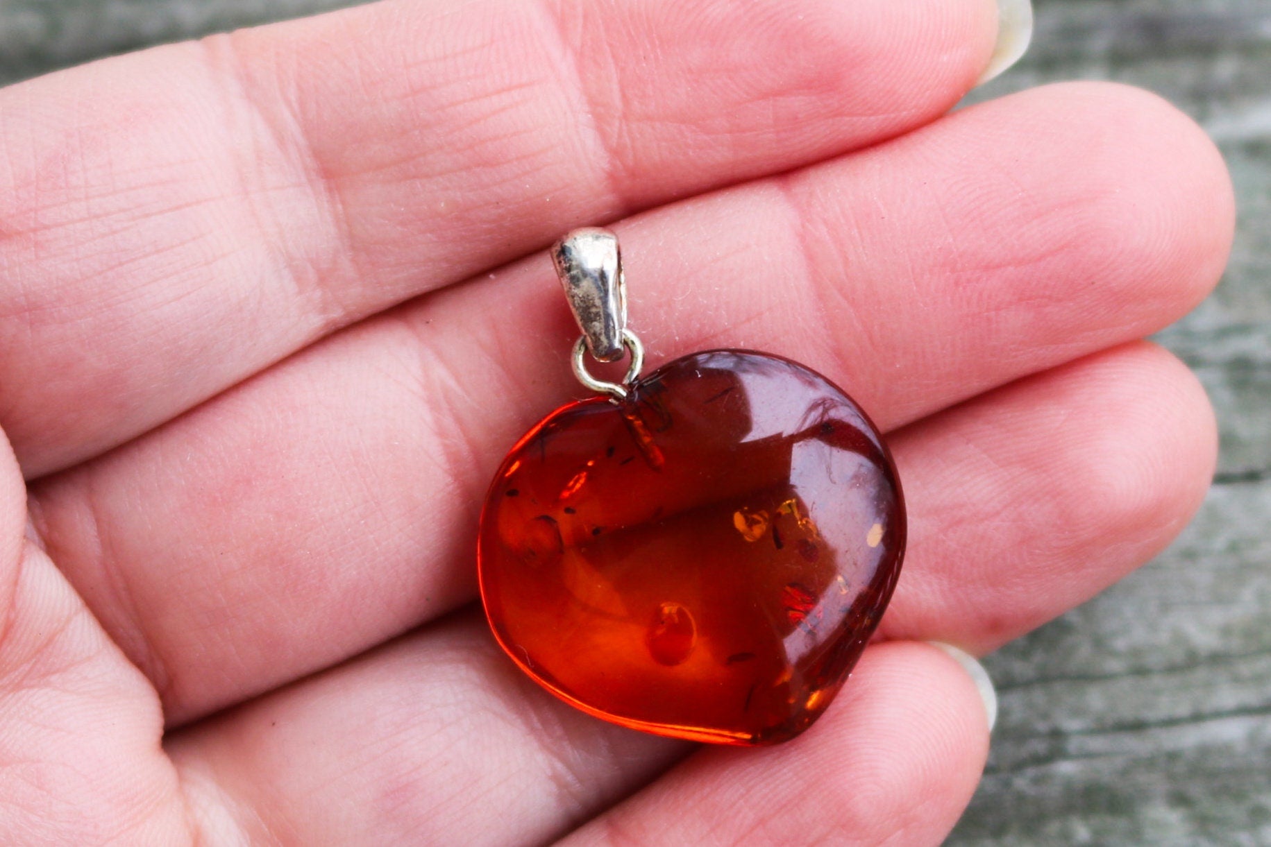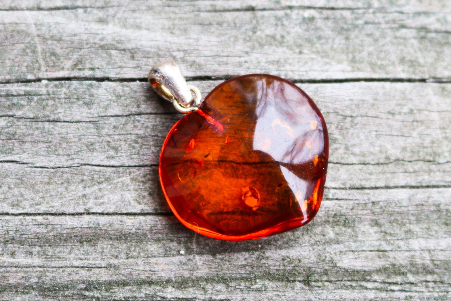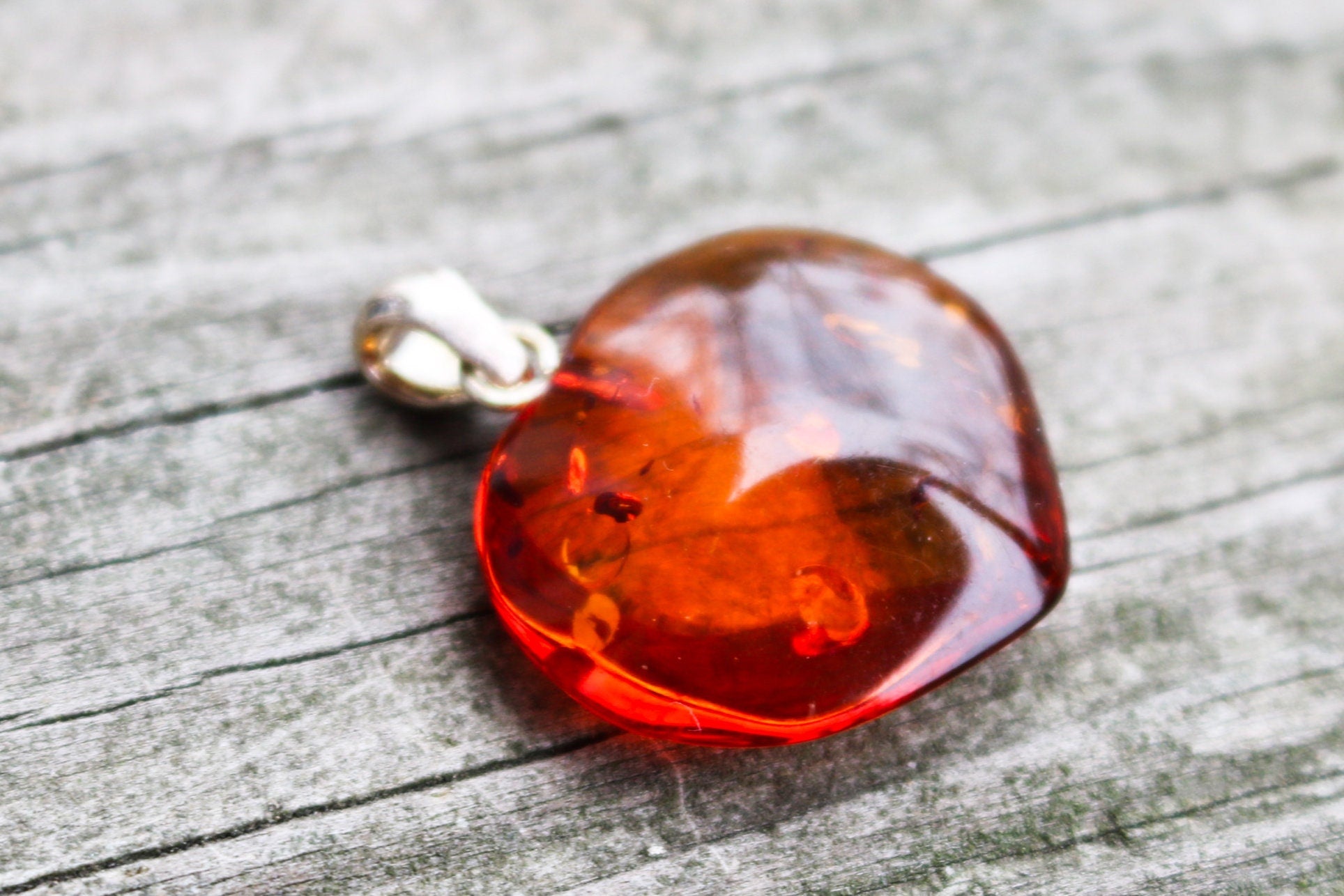 Hand carved Baltic Amber heart pendant in cognac color. Fully translucent and shiny. Set in 925 sterling silver.