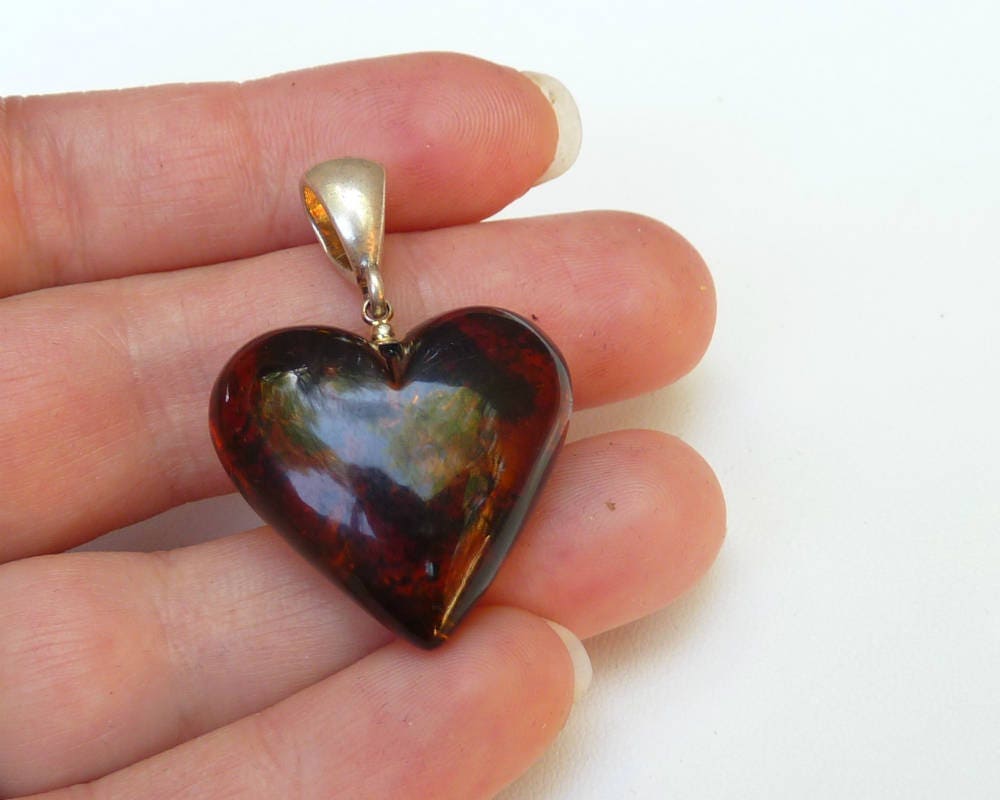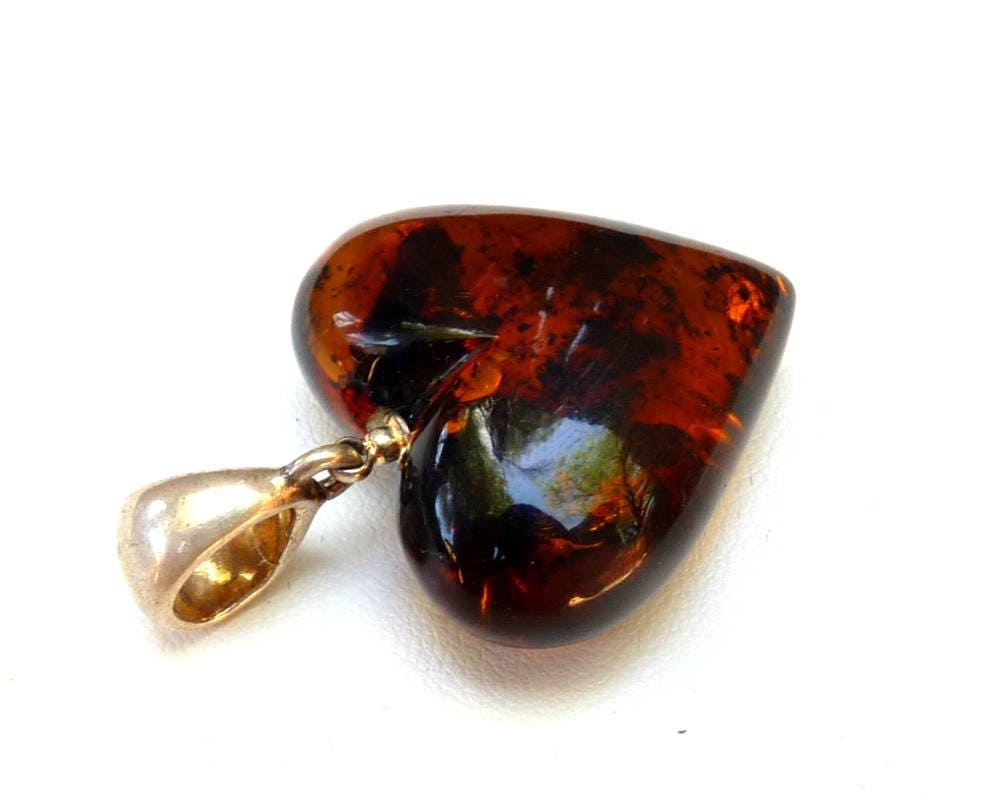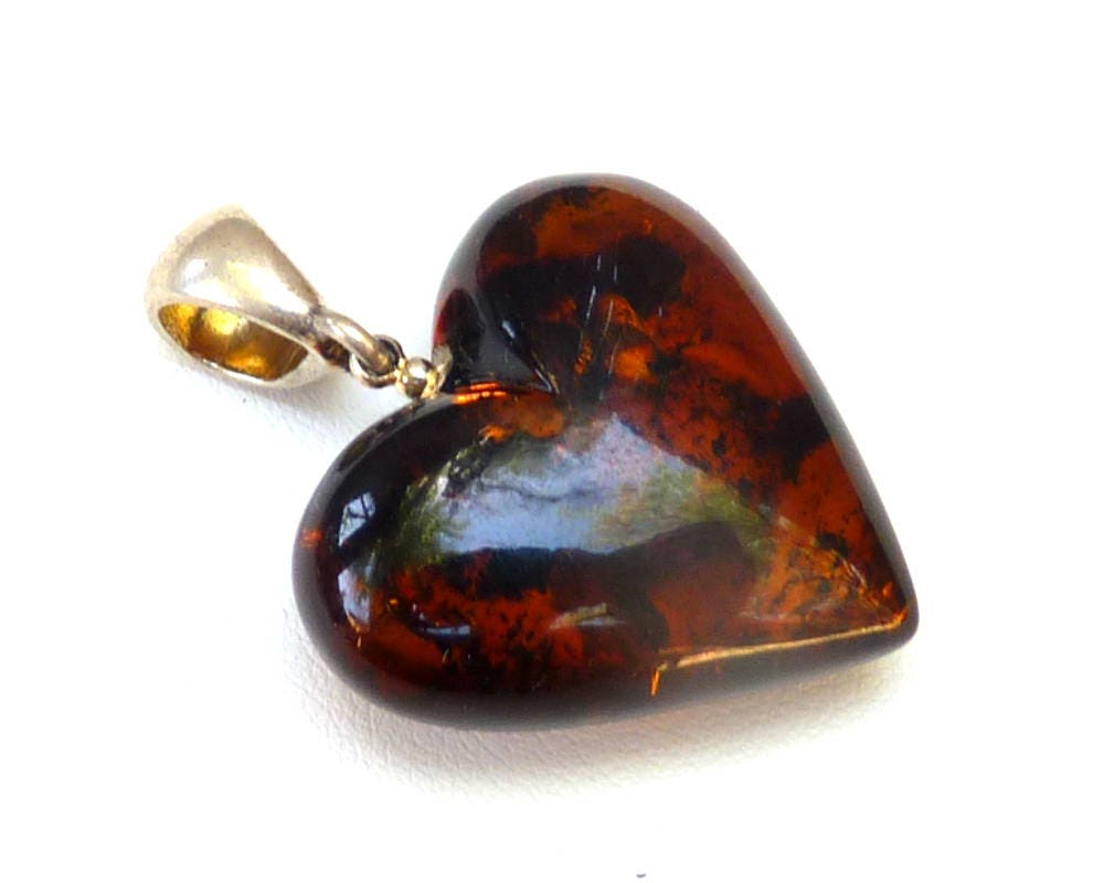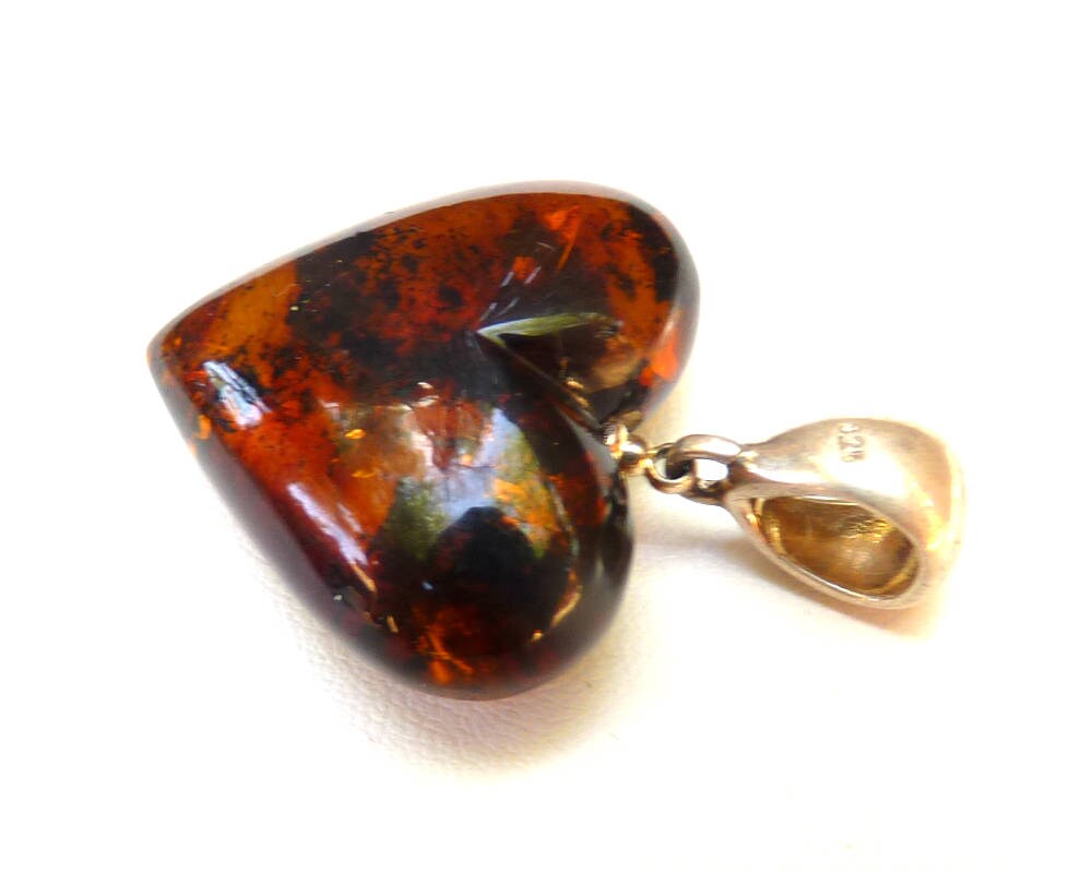 Baltic amber heart pendant hand carved in dark cognac color with natural inclusions. Set in 925 sterling silver.