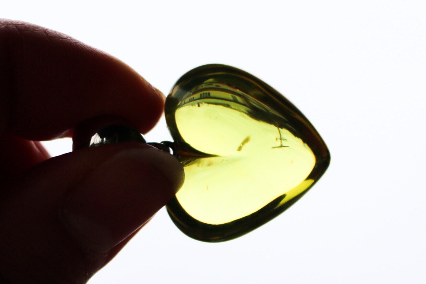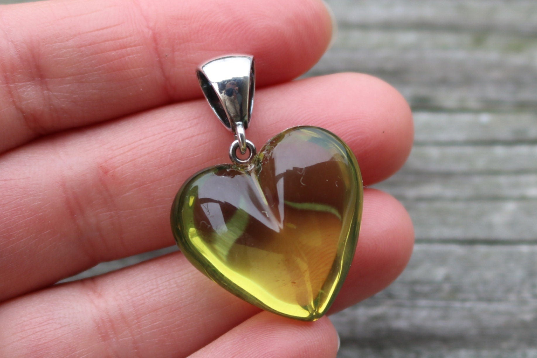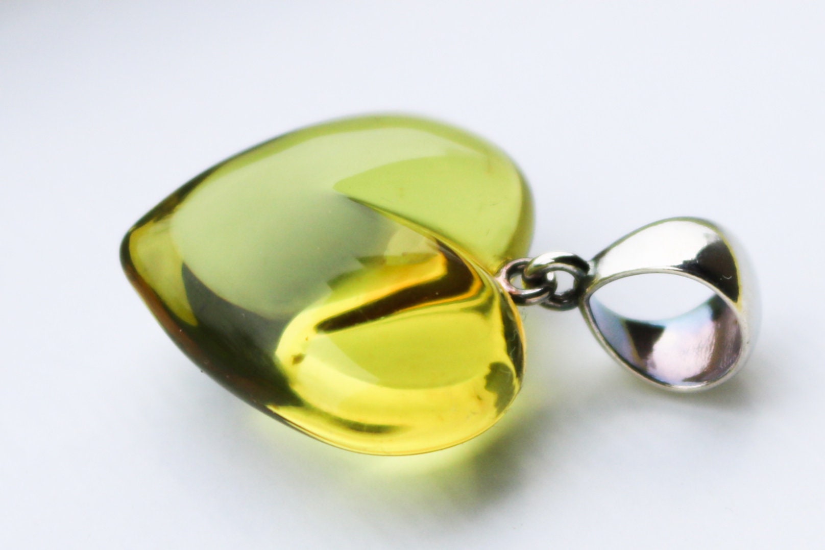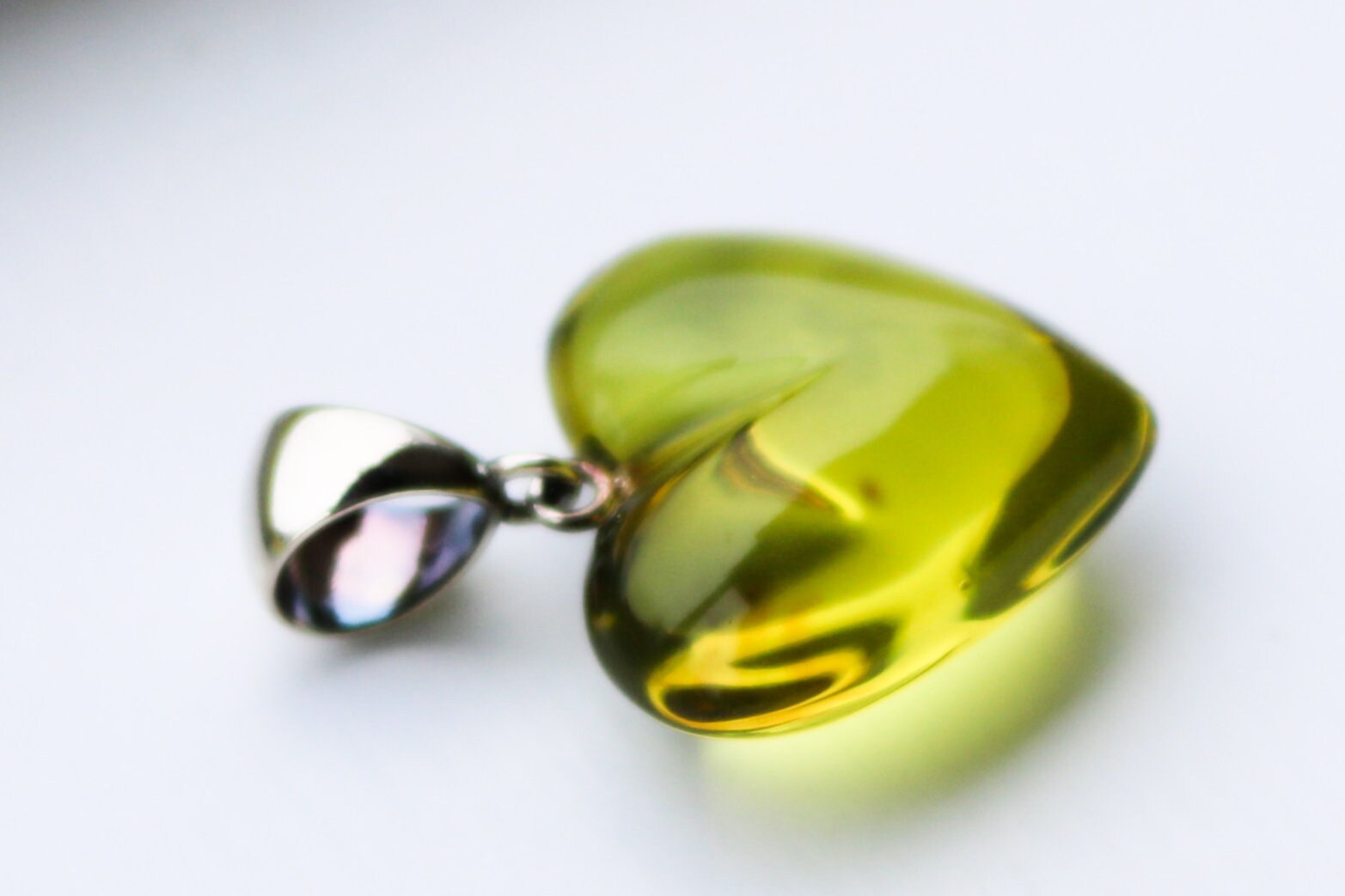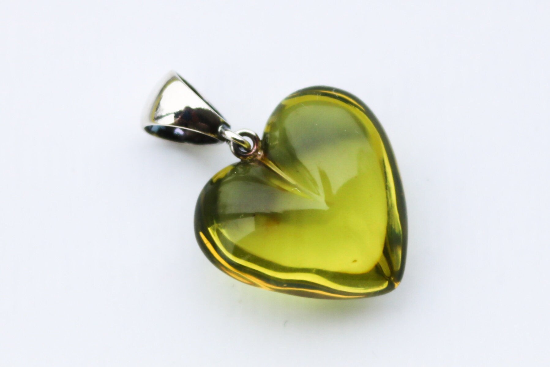 Hand carved and polished Baltic Amber heart pendant in fully transparent light green color. Set in 925 sterling silver.