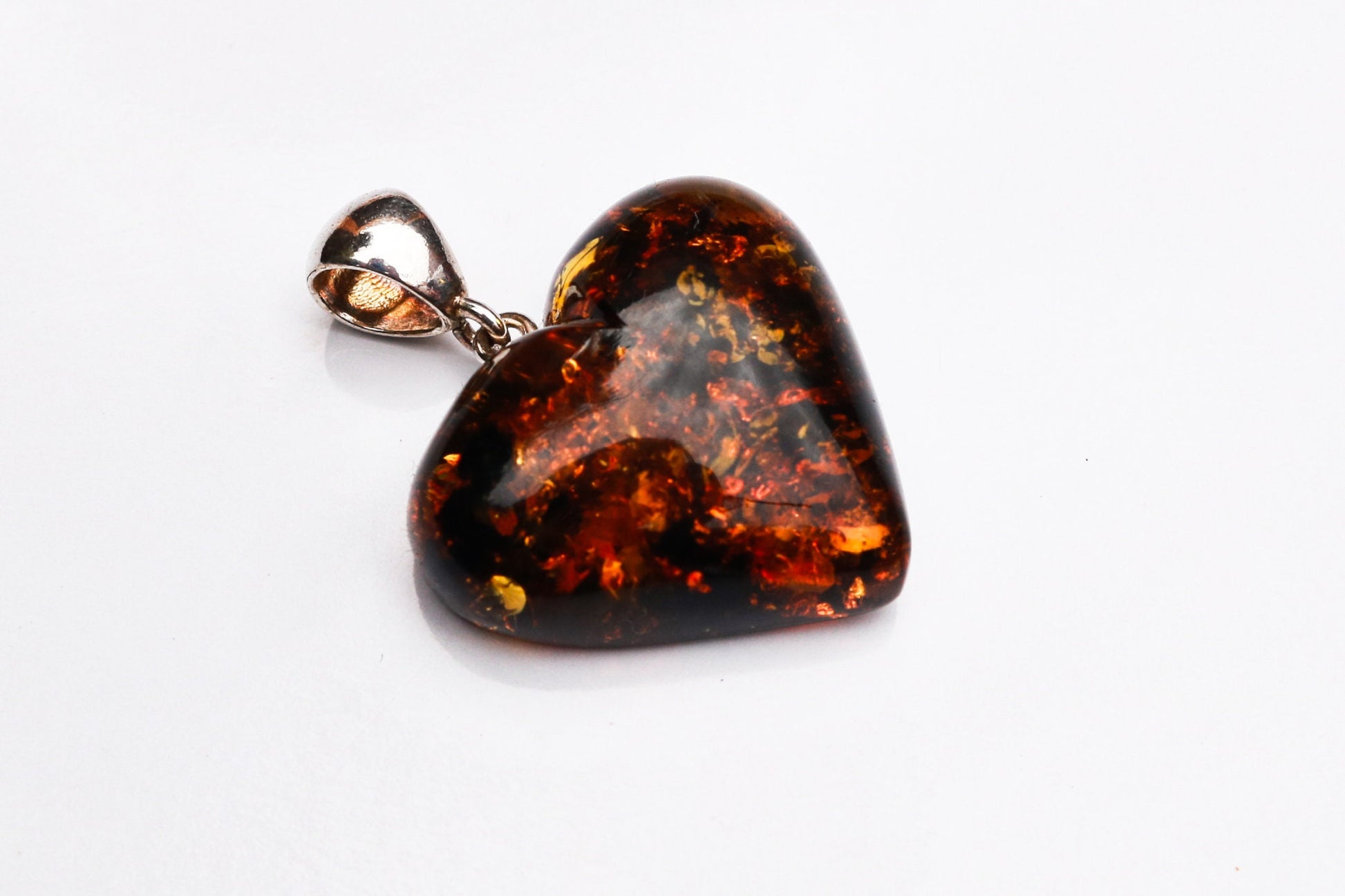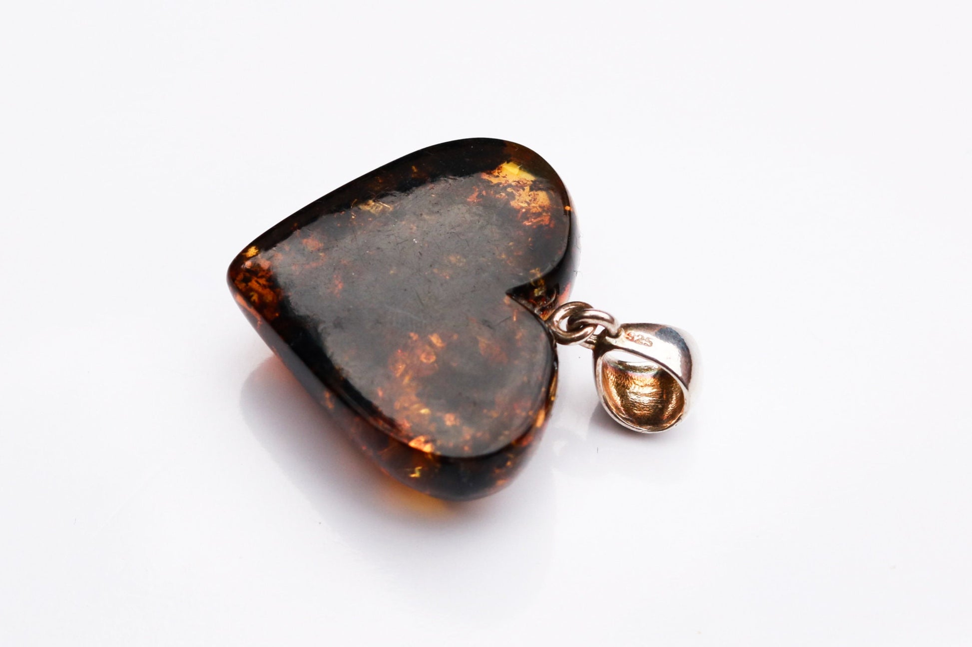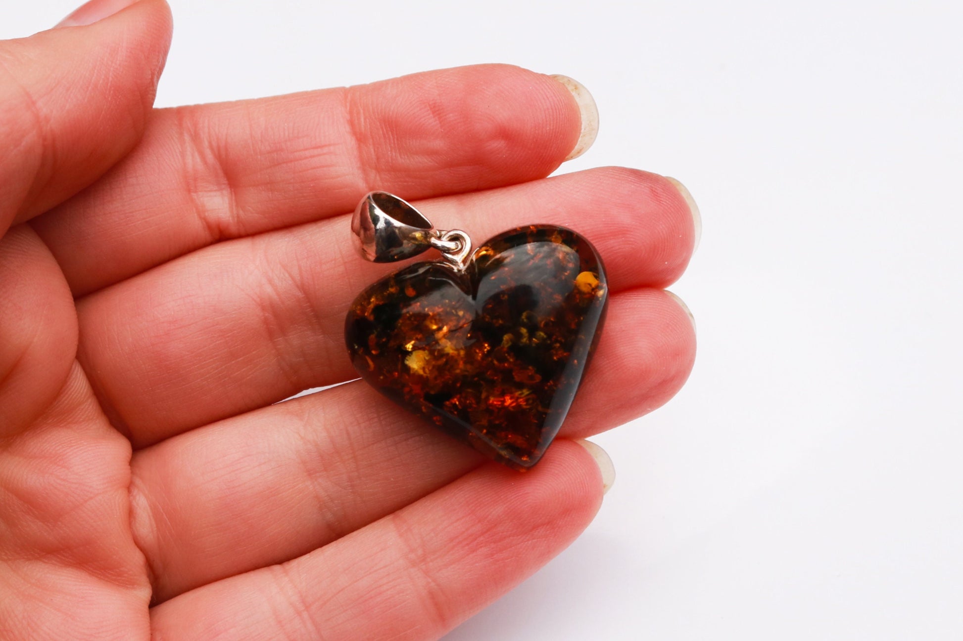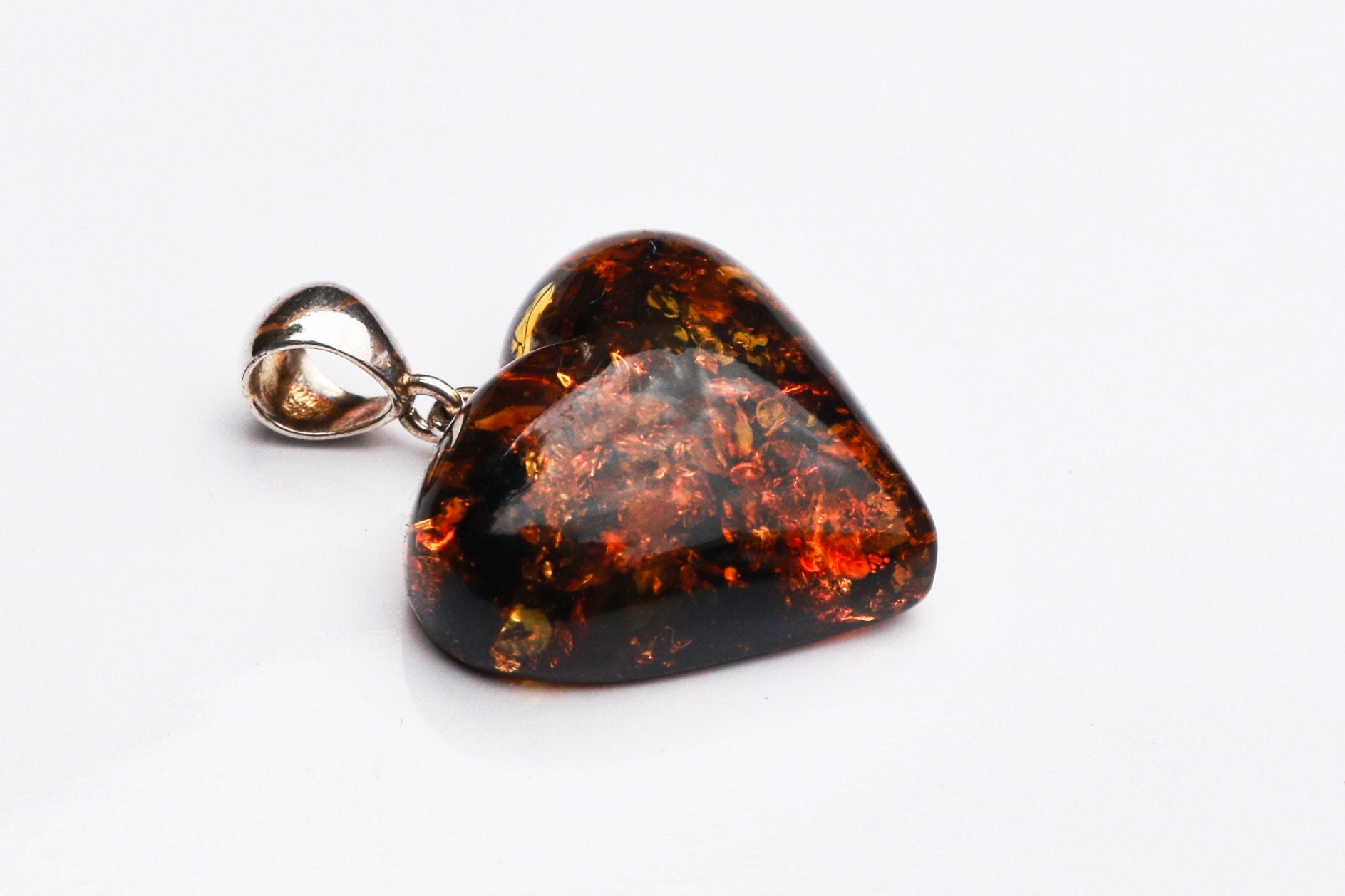 Baltic Amber Heart Pendant Green Sparkling Dark Carved 1.43" 5.1 gram 925 Silver