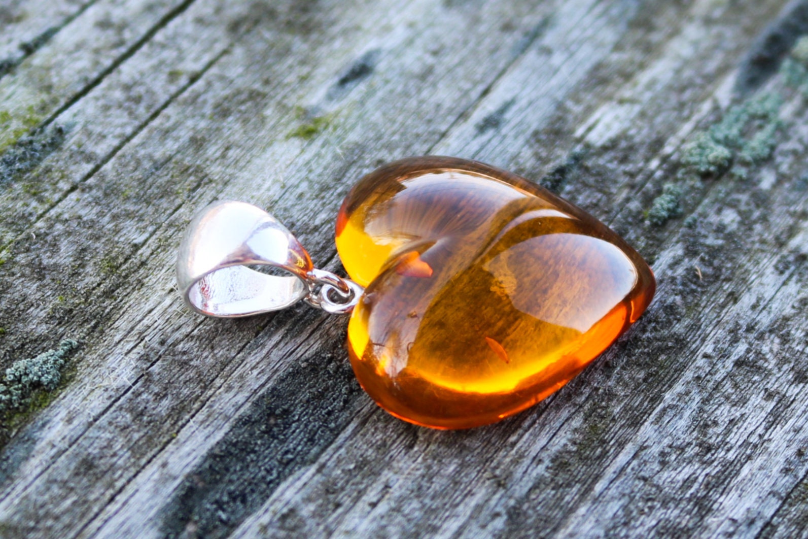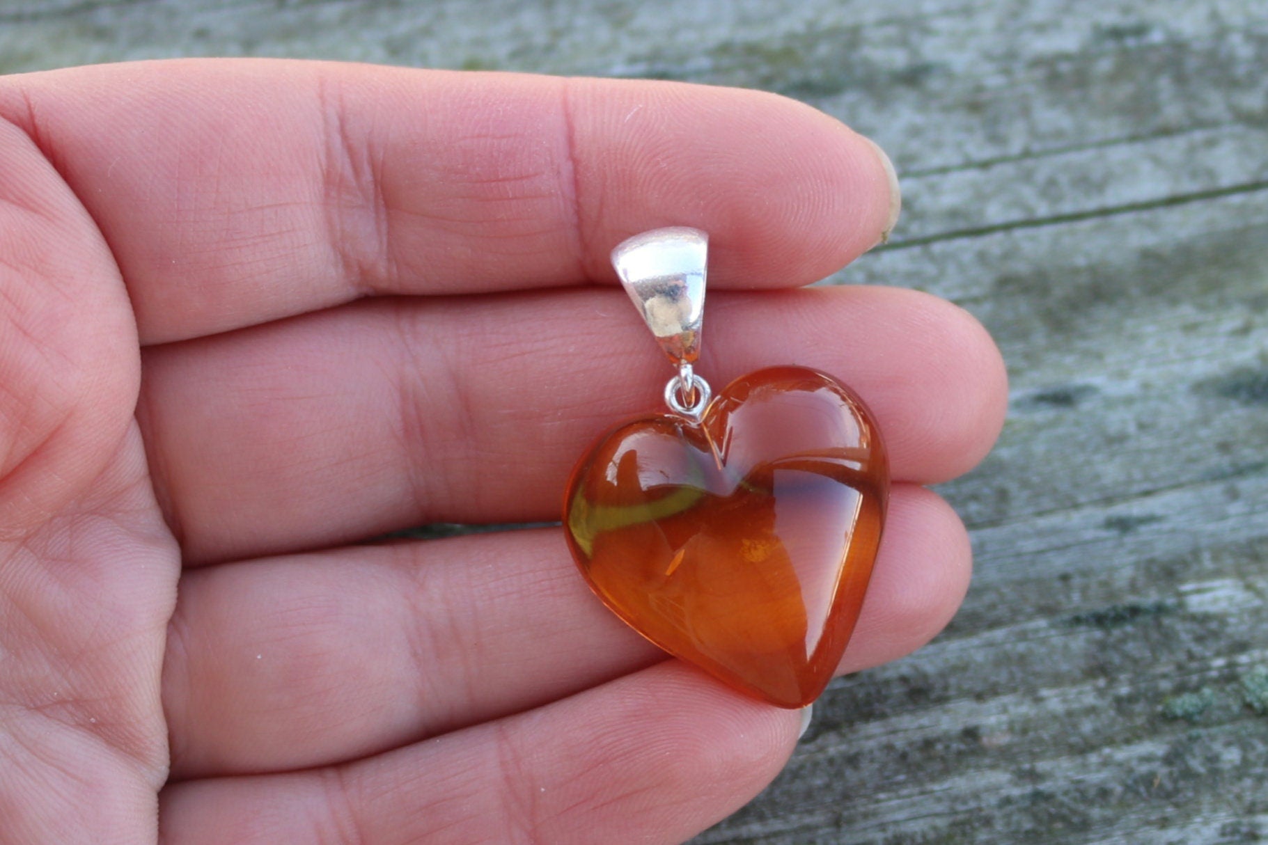 Baltic Amber hand carved heart pendant in translucent honey color. Set in 925 sterling silver.