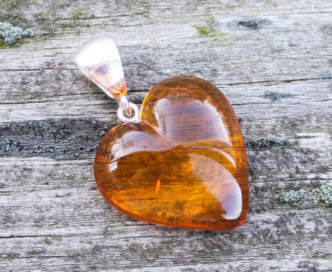 Baltic Amber Heart Pendant Honey Natural 1.52" 4.2 925 Silver