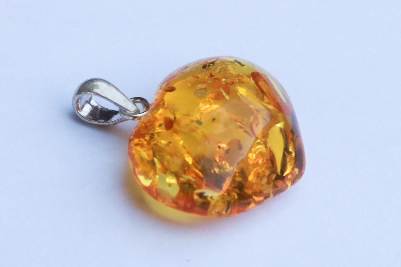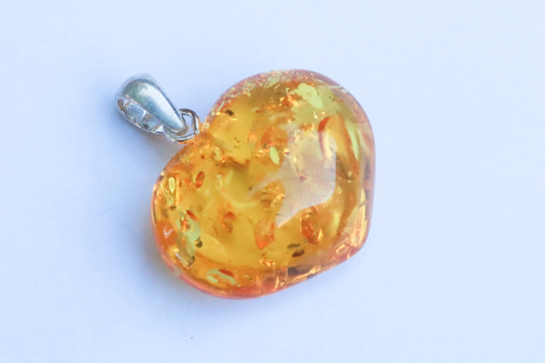 Baltic Amber hand carved heart pendant in sparkling yellow color.