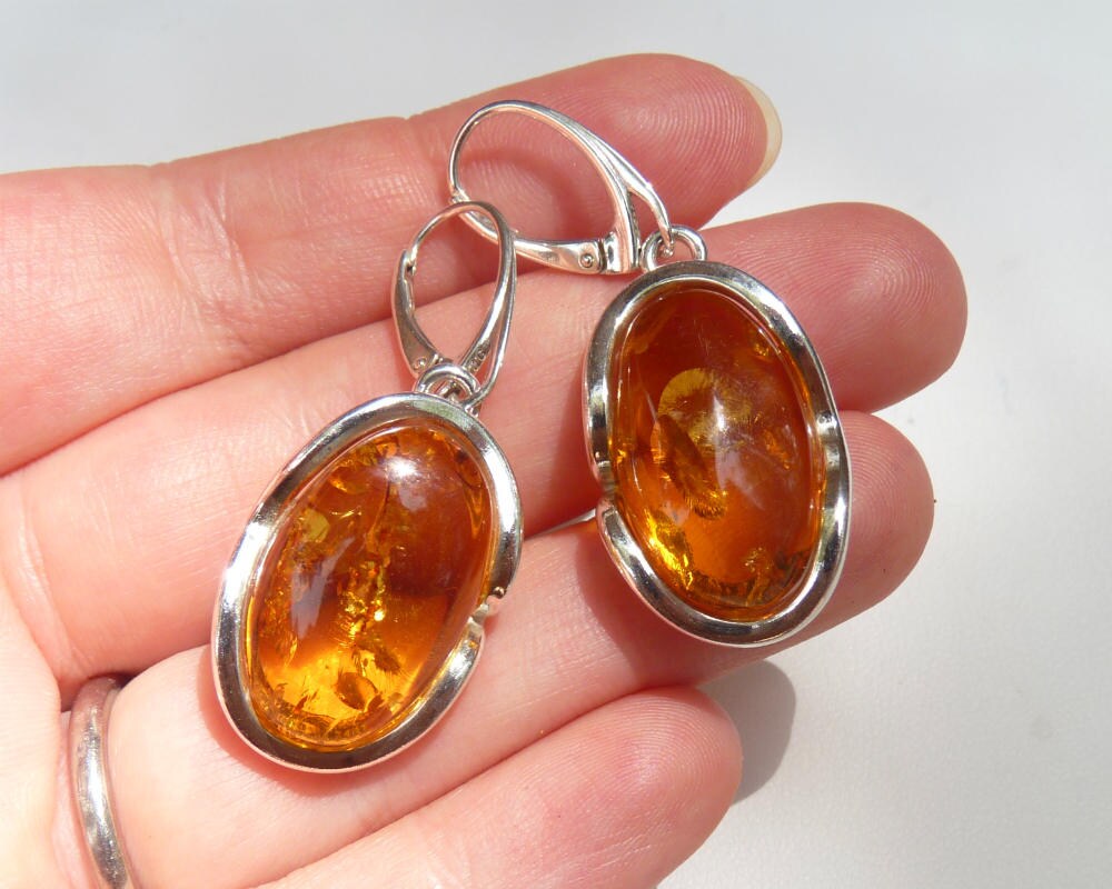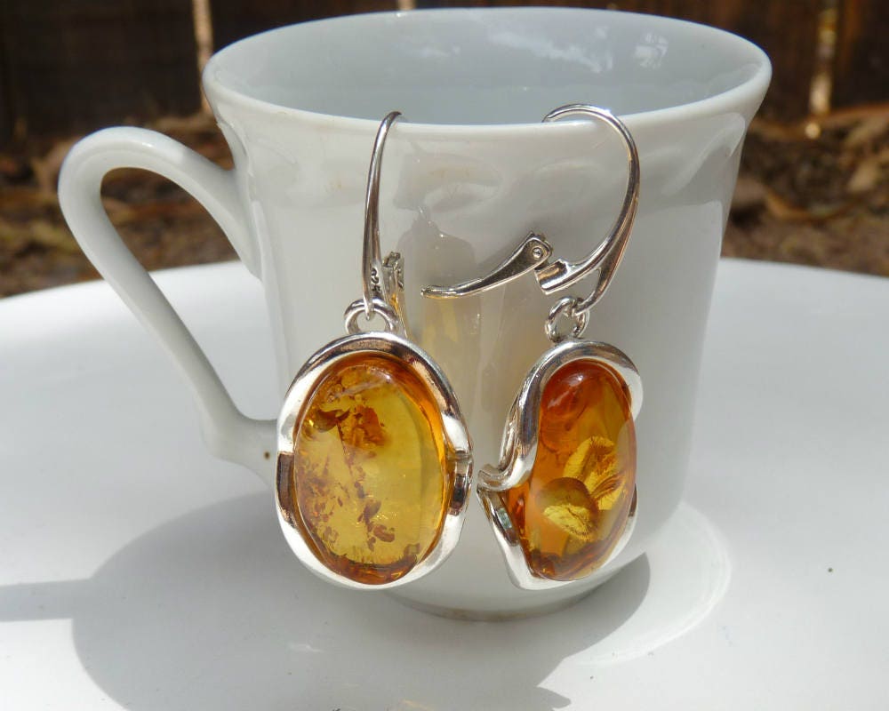 Baltic Amber Honey Earrings Natural Sparkling Oval Jewelry1.75" 11.2 gram 925 Silver