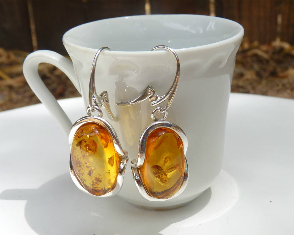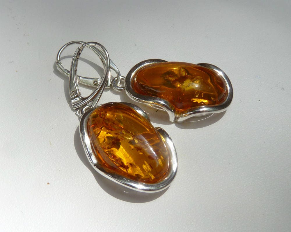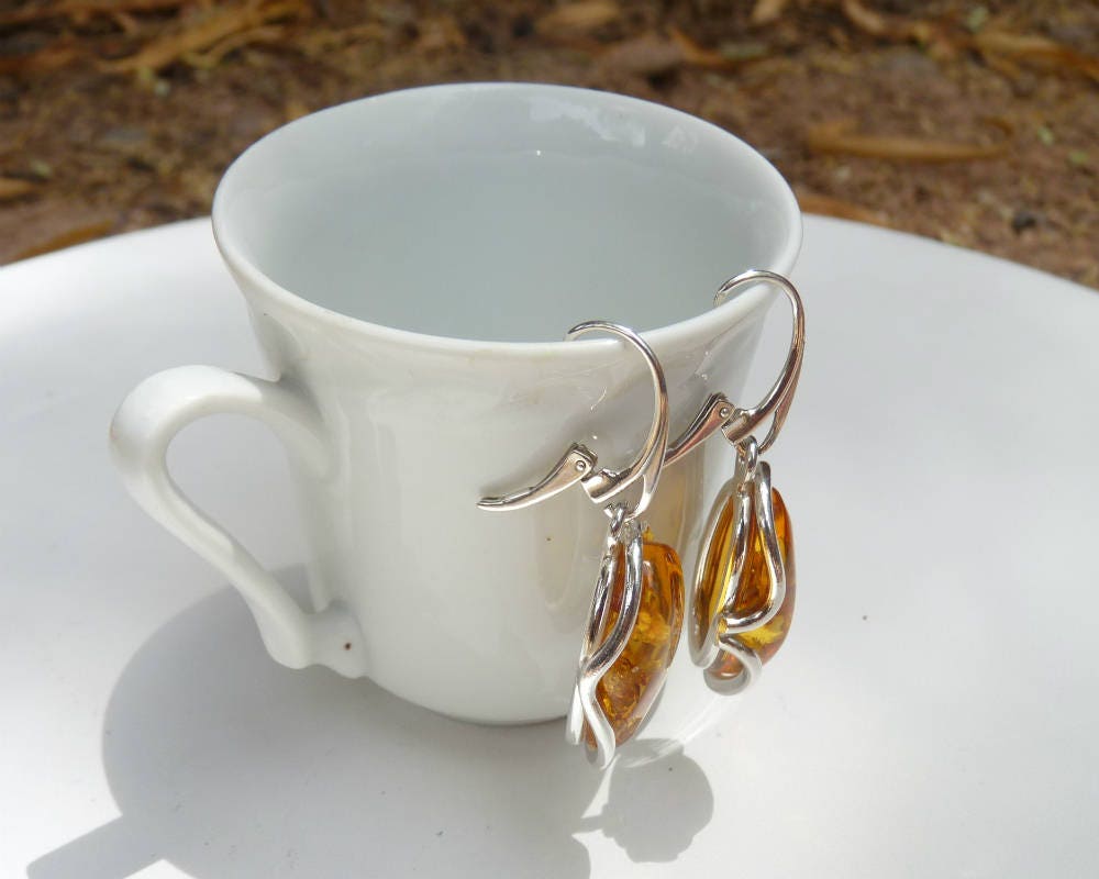 Baltic amber dangling earrings in gorgeous honey color. Set in 925 sterling silver.
