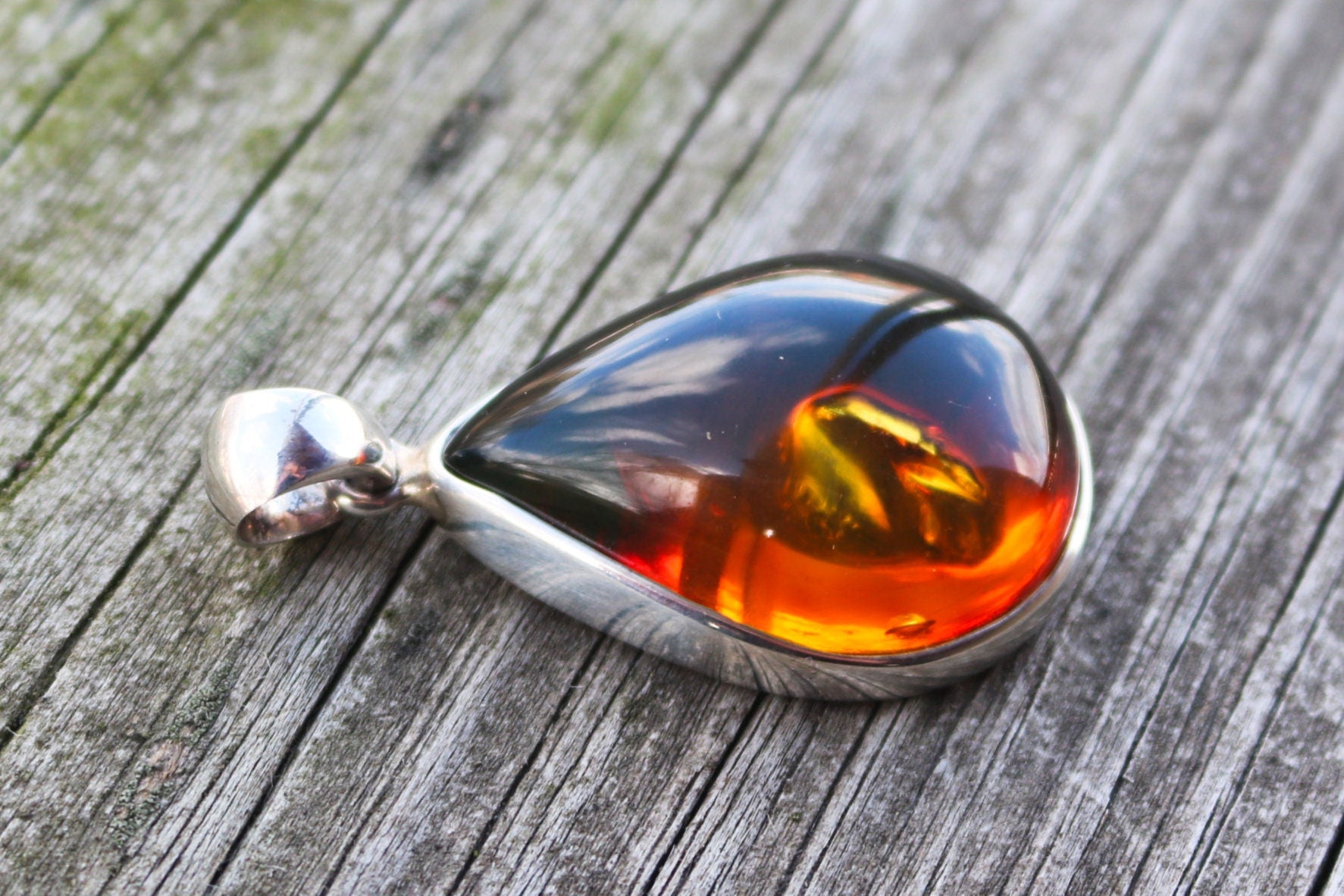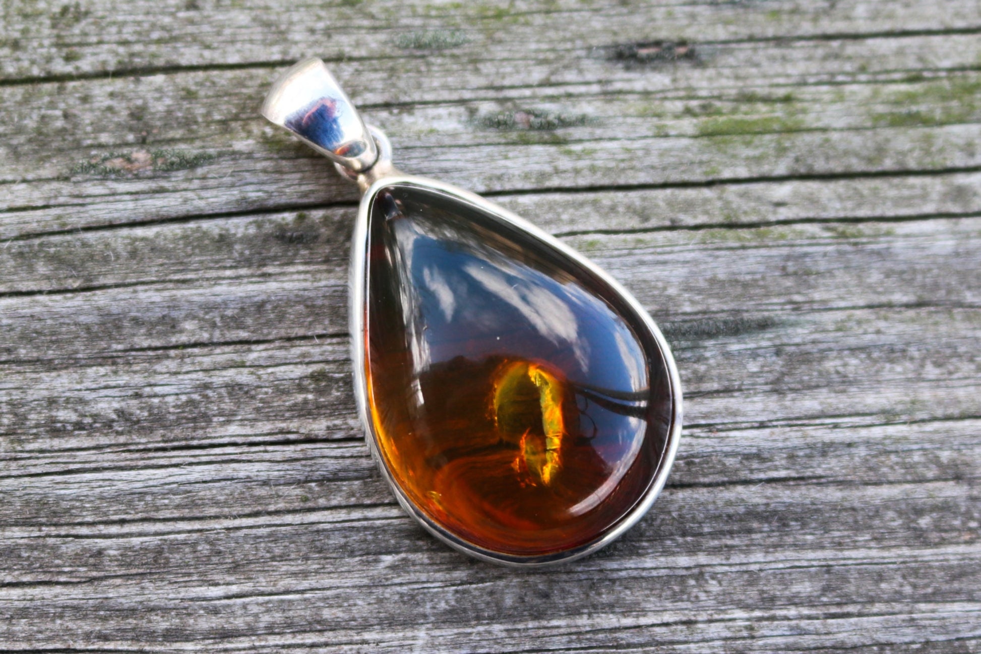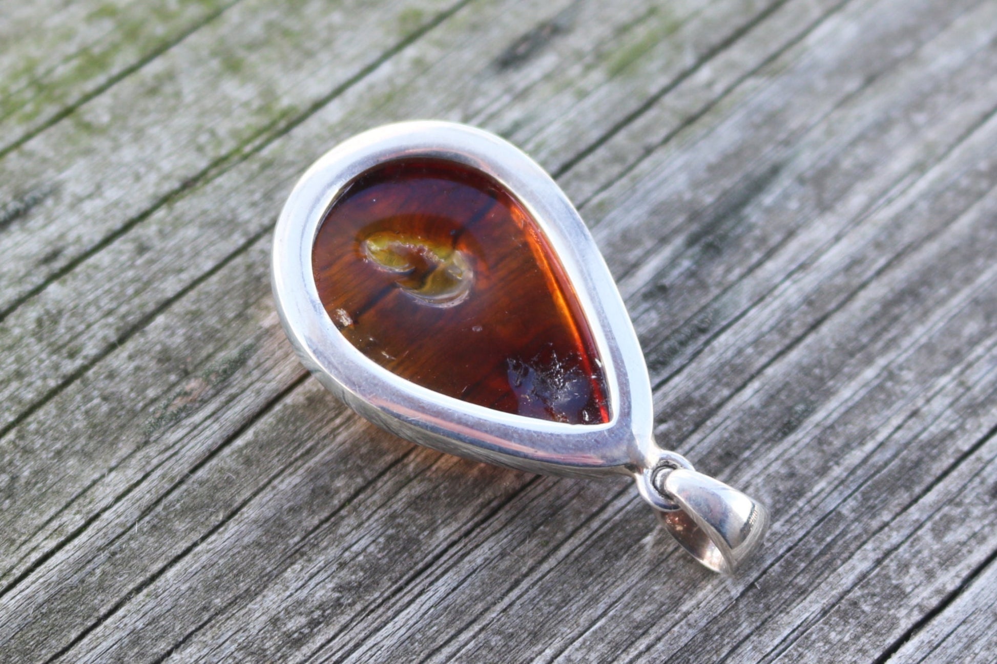 Baltic Amber hand carved dark honey pendant. Set in 925 sterling silver. This is natural untreated amber.