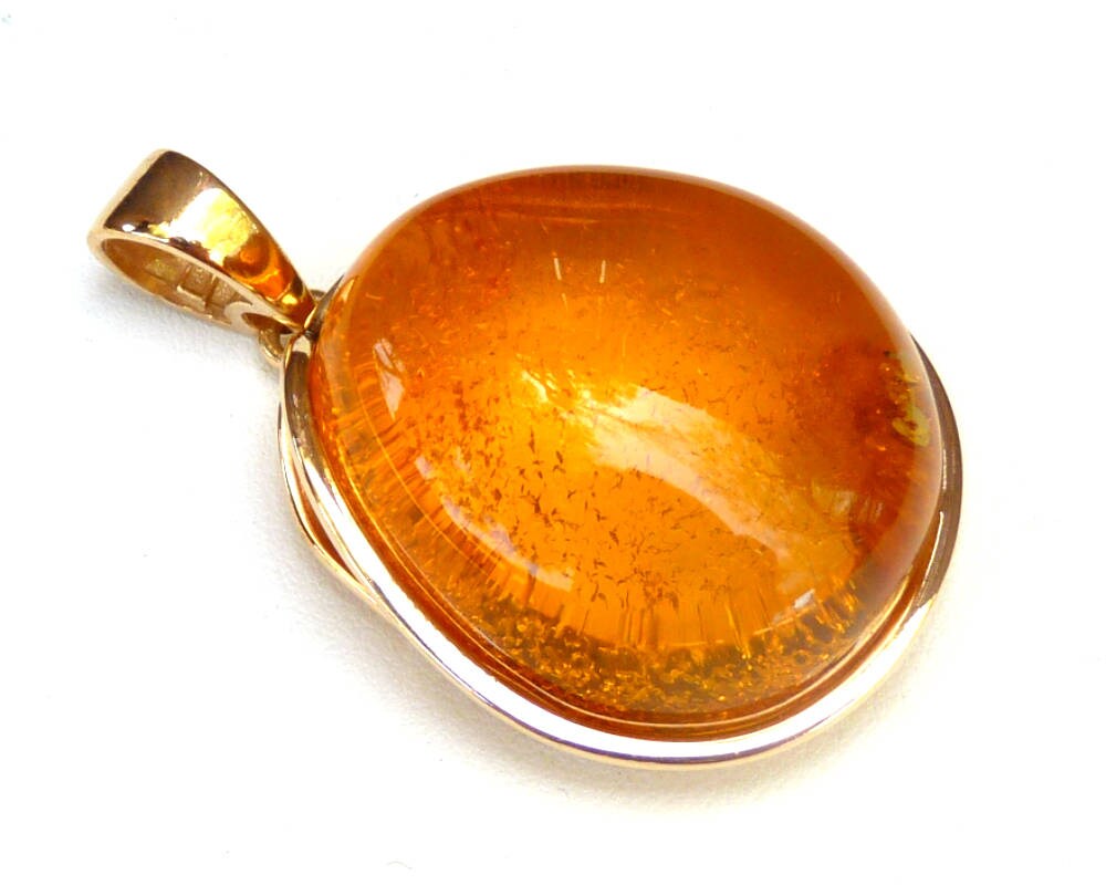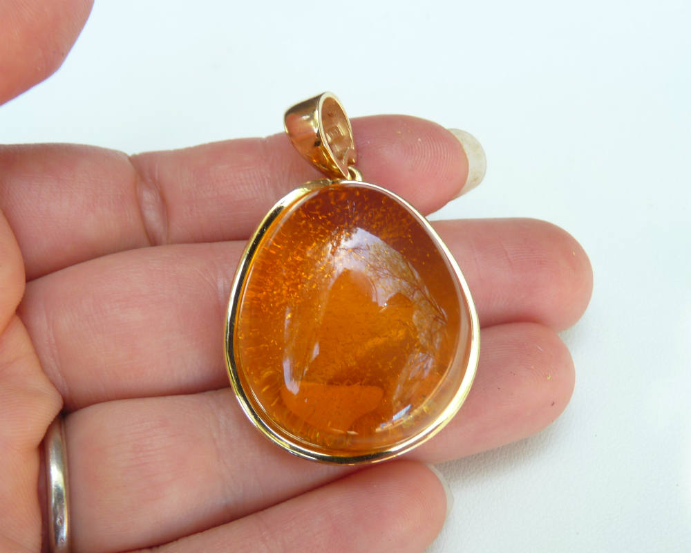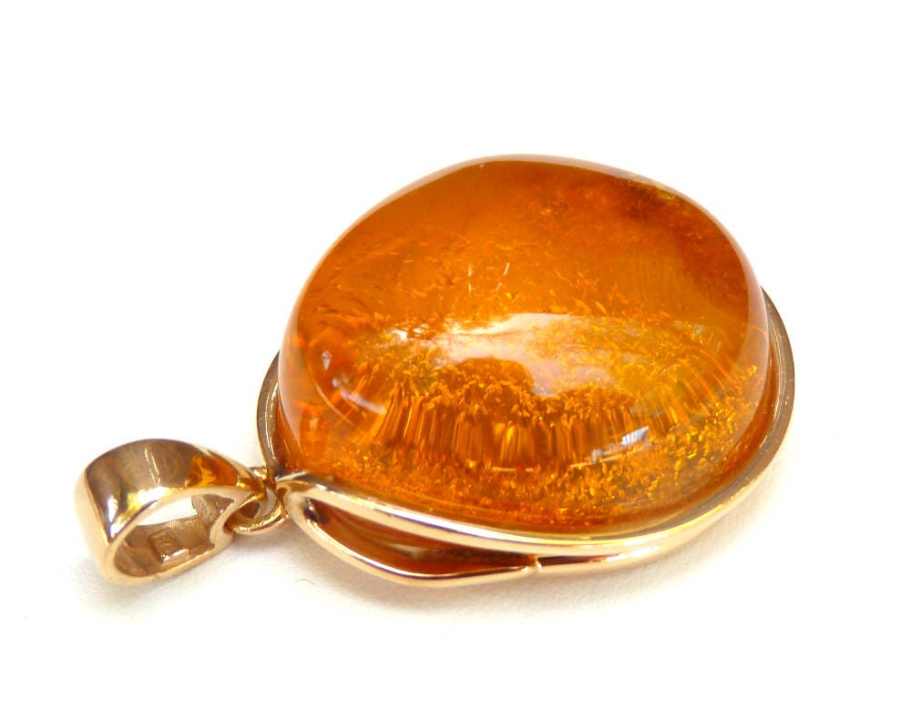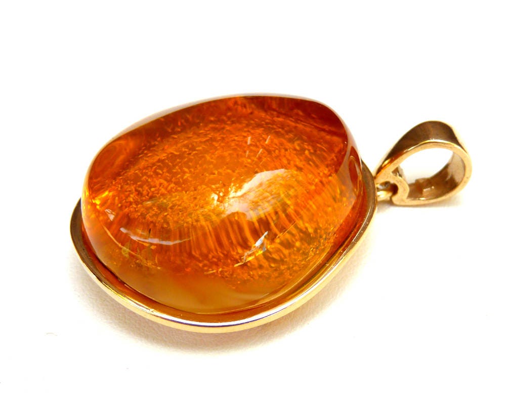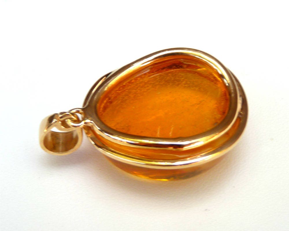 Baltic amber pendant made out of natural untreated fully transparent honey color. Set in gold plated 925 sterling silver.
