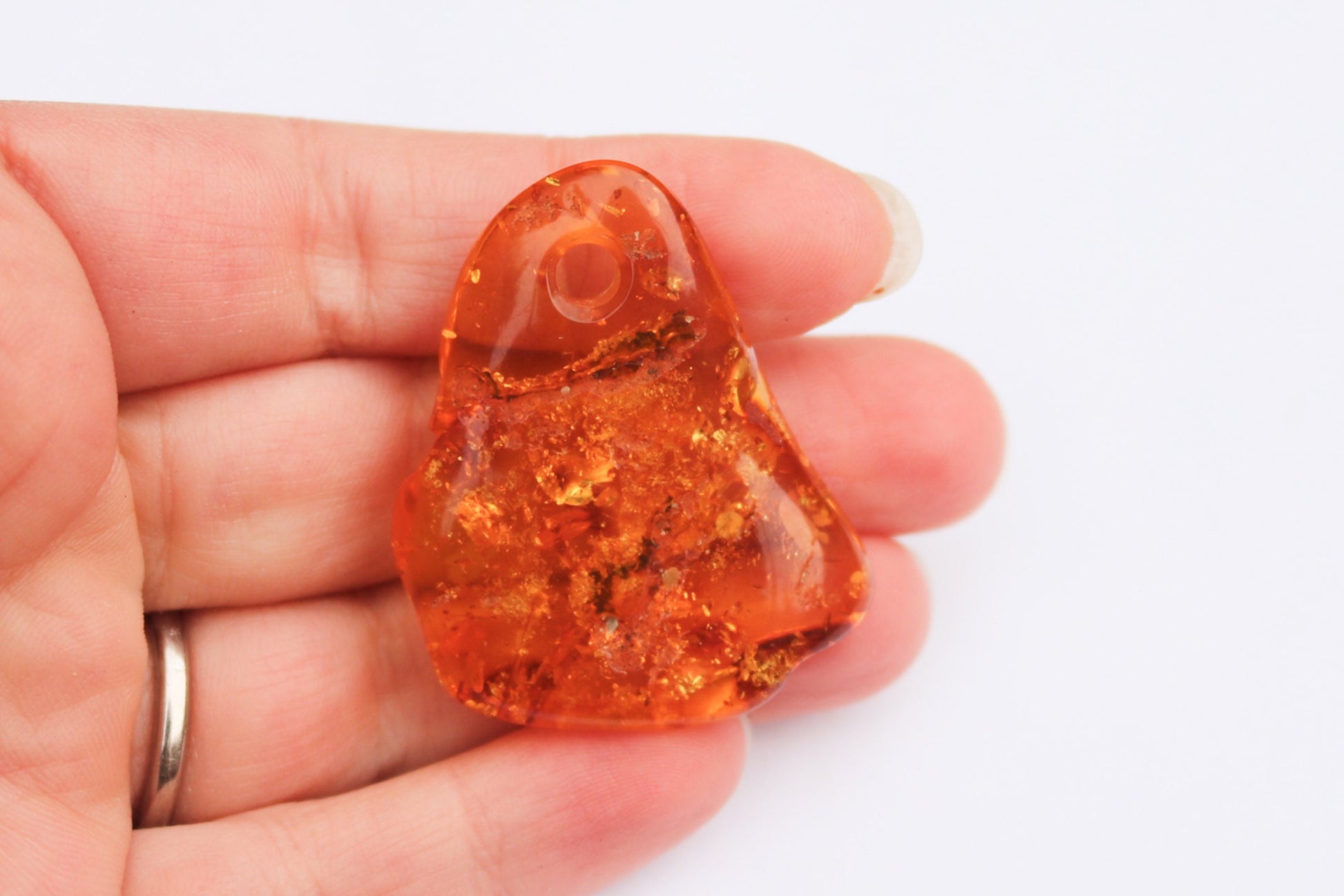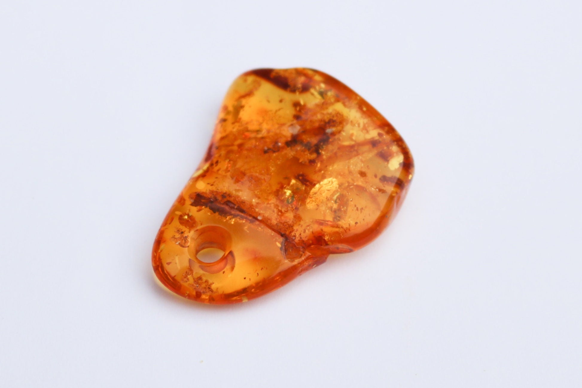It is probably the most popular, recognizable and one of the most common color, cognac (or whisky) amber comes mainly in treated form (initially transparent yellow), but can be also natural. Slow heating deepens the color, makes it more shimmering and bright than natural. Cognac amber is often autoclaved (treated with high pressure saturated steam at about 120°C/248°F) which results in inner cracking. The steam penetrates the amber’s structure and alter its color. That’s how decorative bubbles (or so-called “scales”) and shiny discs are created. Heating is a very cold technique that has been in use for hundreds of years to enhance amber’s natural color while autoclaving has been developed in the second half of the 20th century. There are several shades of cognac amber, varying from light honey to dark cognac, almost cherry shade.