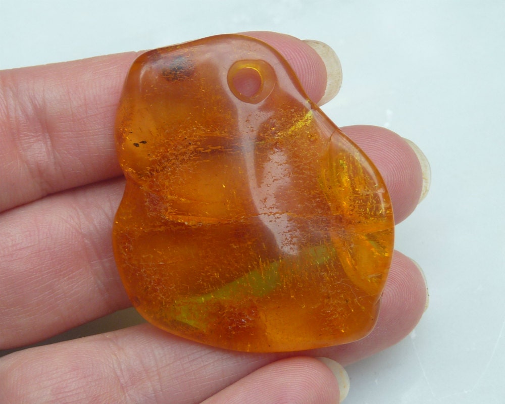 It is probably the most popular, recognizable and one of the most common color, cognac (or whisky) amber comes mainly in treated form (initially transparent yellow), but can be also natural. Slow heating deepens the color, makes it more shimmering and bright than natural. Cognac amber is often autoclaved (treated with high pressure saturated steam at about 120°C/248°F) which results in inner cracking. The steam penetrates the amber’s structure and alter its color. That’s how decorative bubbles (or so-called “scales”) and shiny discs are created. Heating is a very cold technique that has been in use for hundreds of years to enhance amber’s natural color while autoclaving has been developed in the second half of the 20th century. There are several shades of cognac amber, varying from light honey to dark cognac, almost cherry shade.