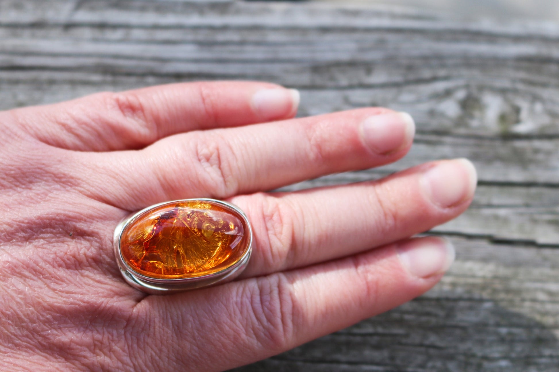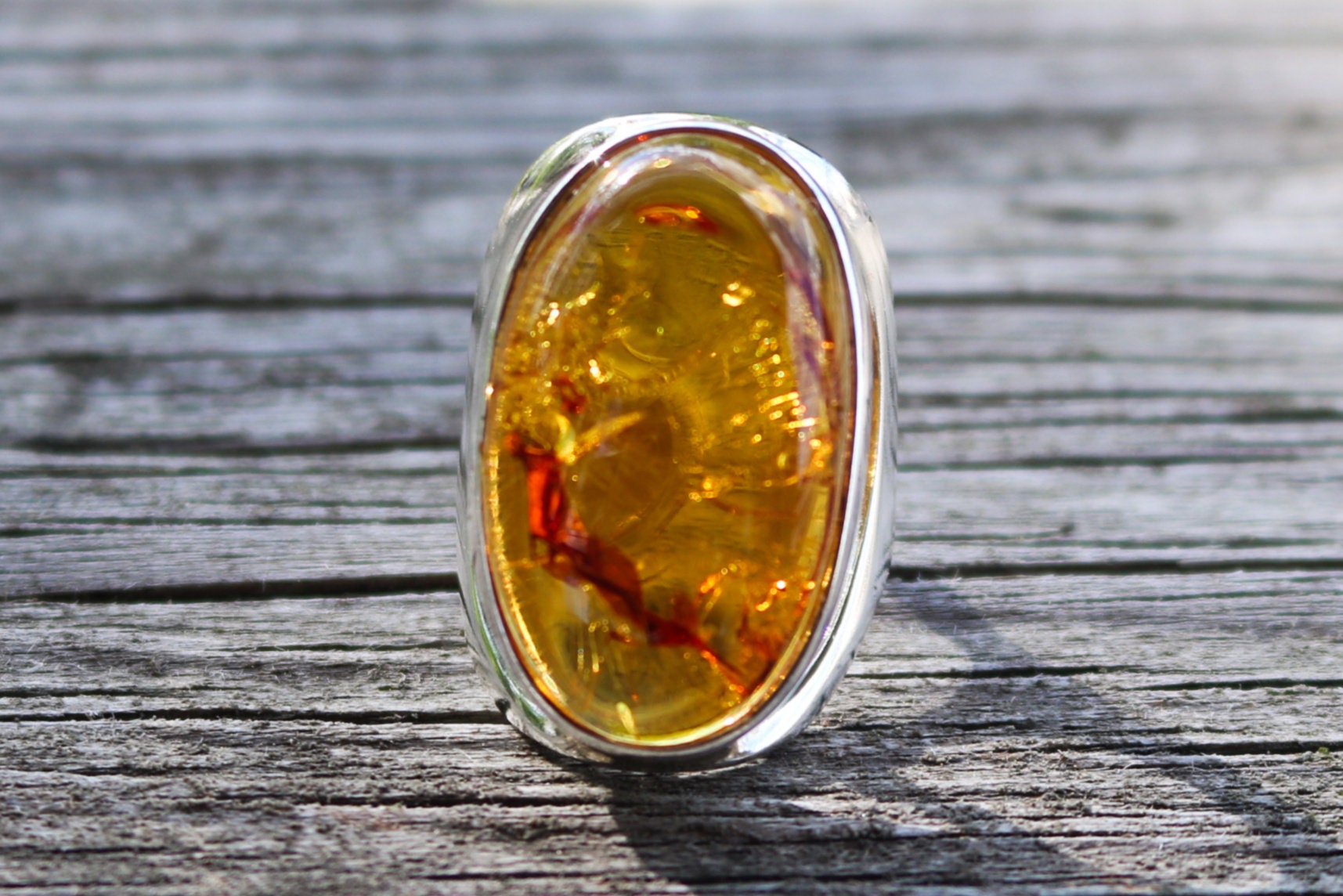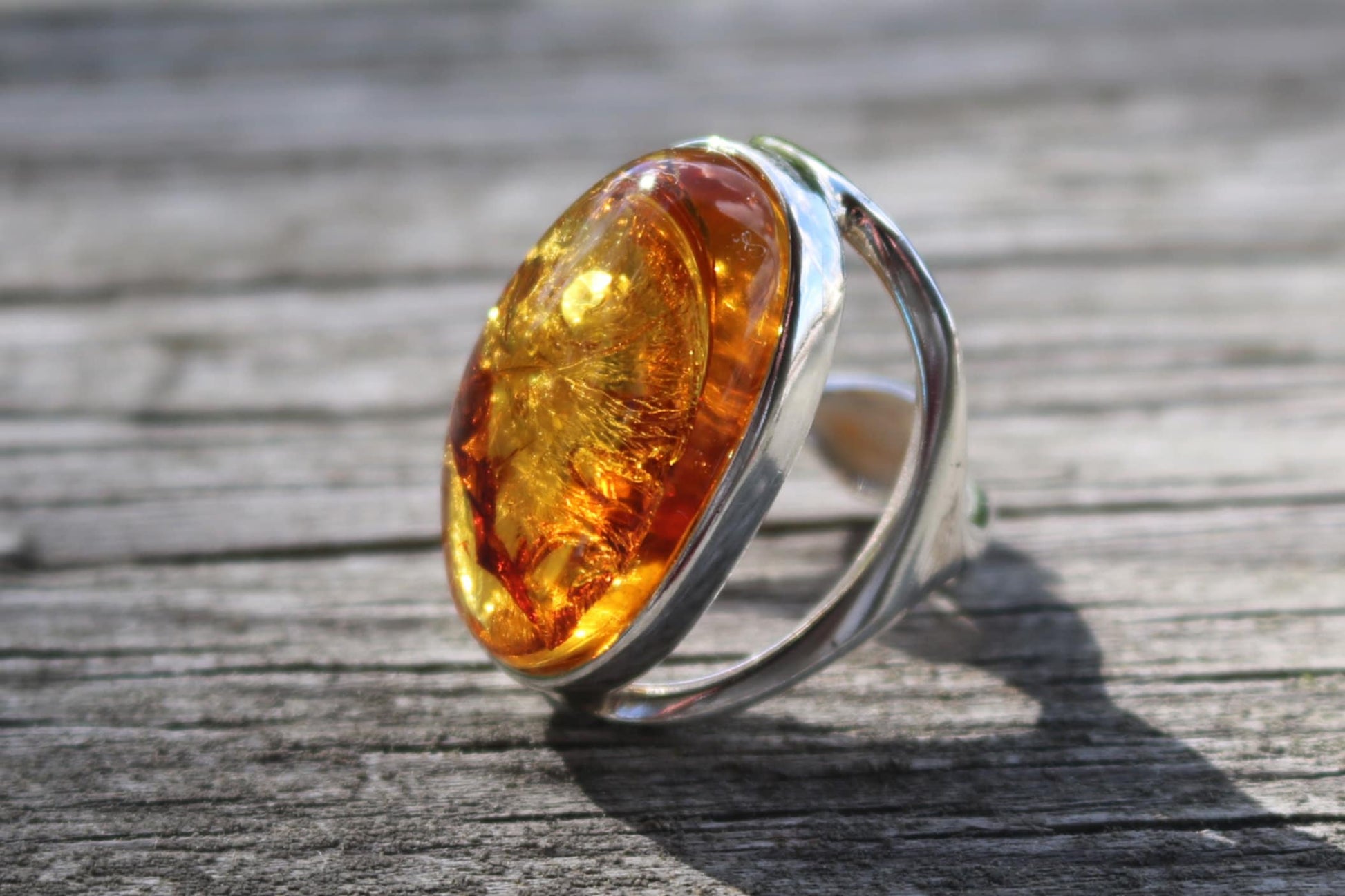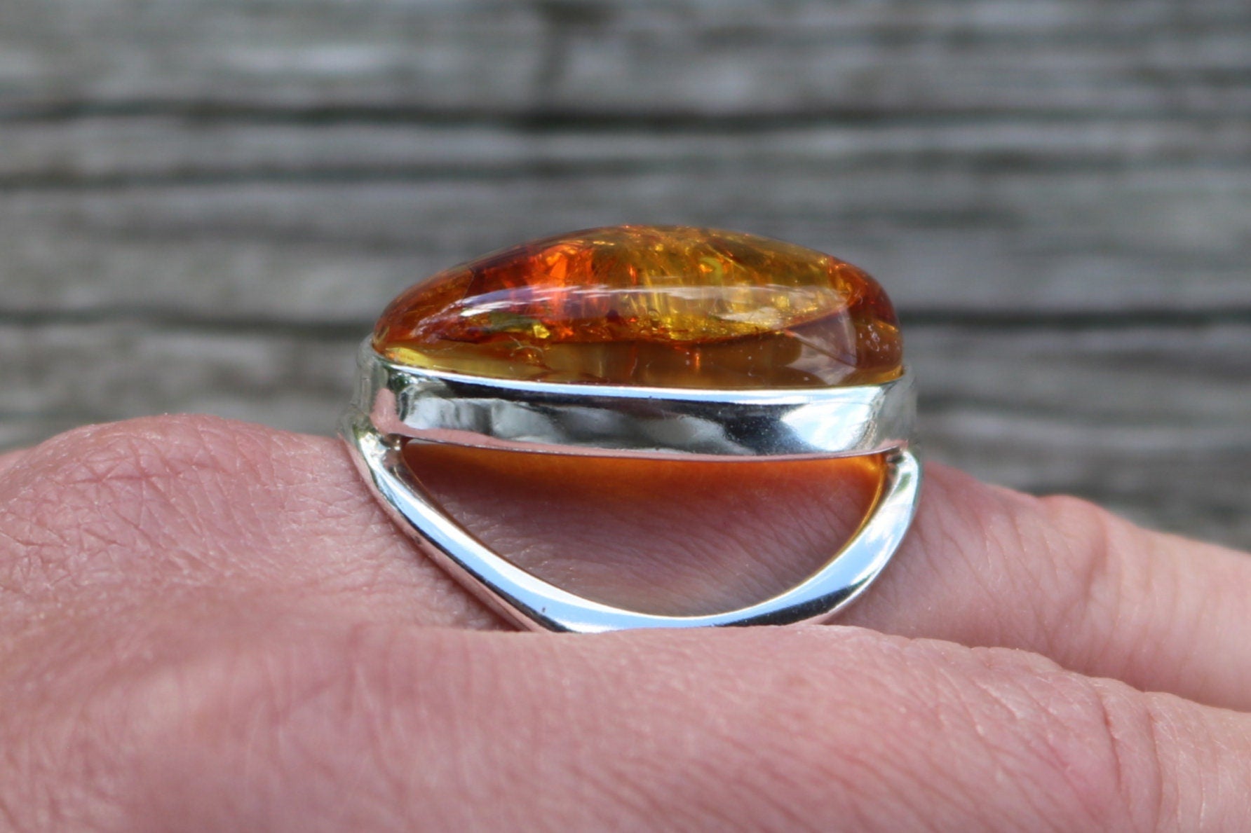 Baltic Amber Honey Ring Adjustable Natural Sparkling Oval 925 Silver 13.2 gram 925 Silver