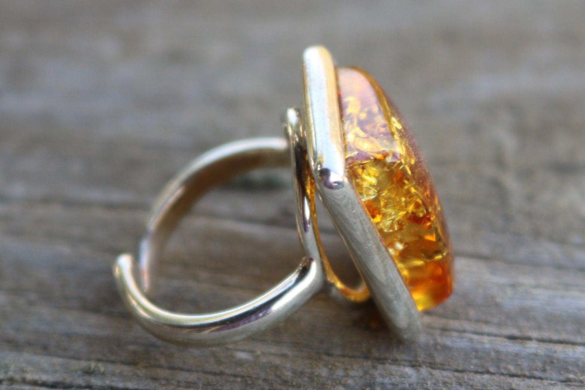 Baltic Amber ring in light honey color. Set in 925 sterling silver. Natural solid stone. This ring is adjustable. Will fit any size.