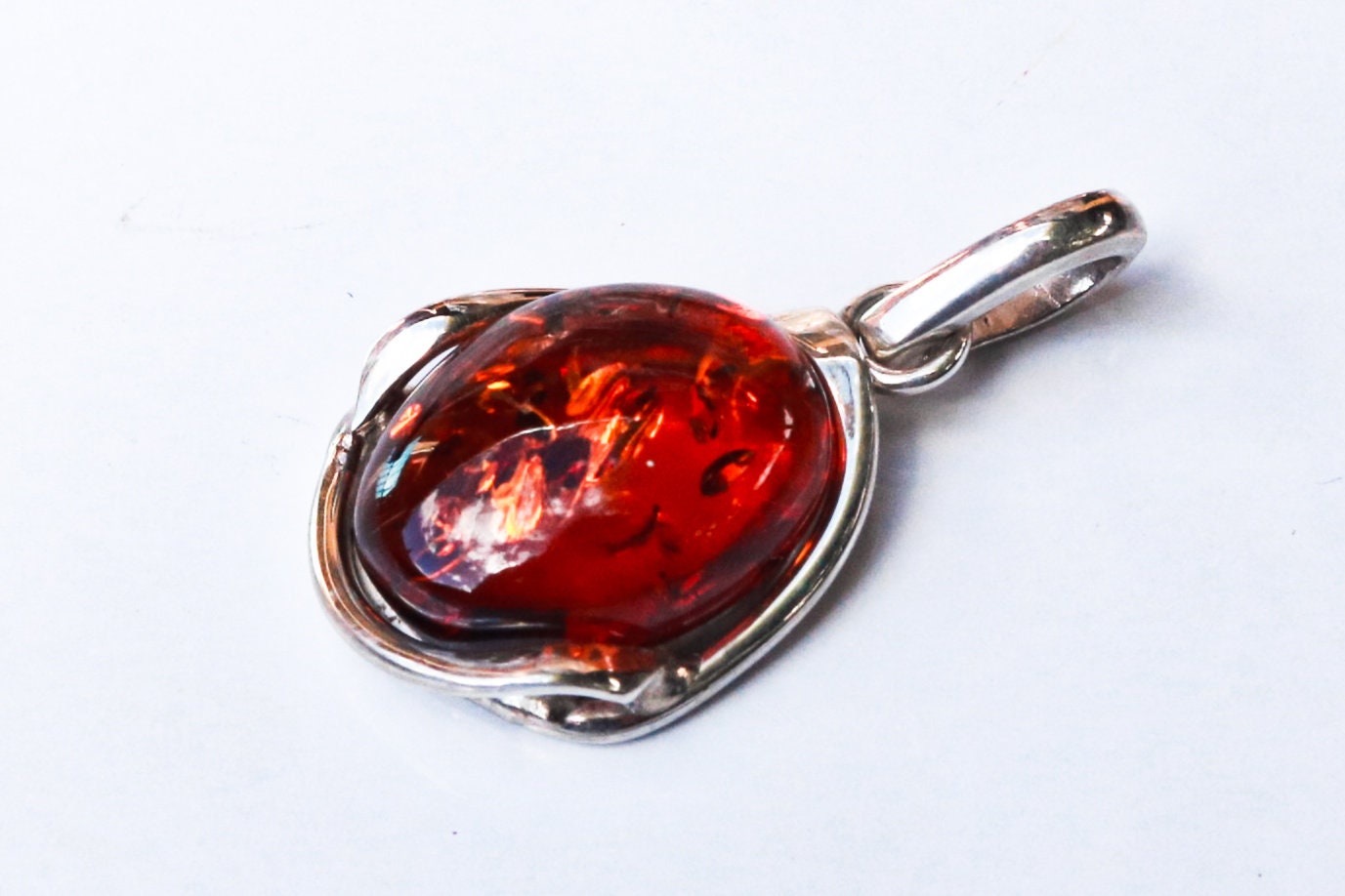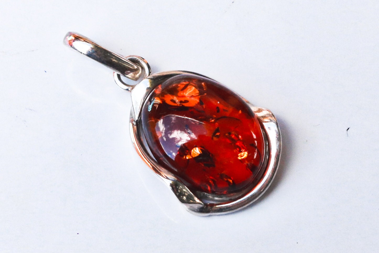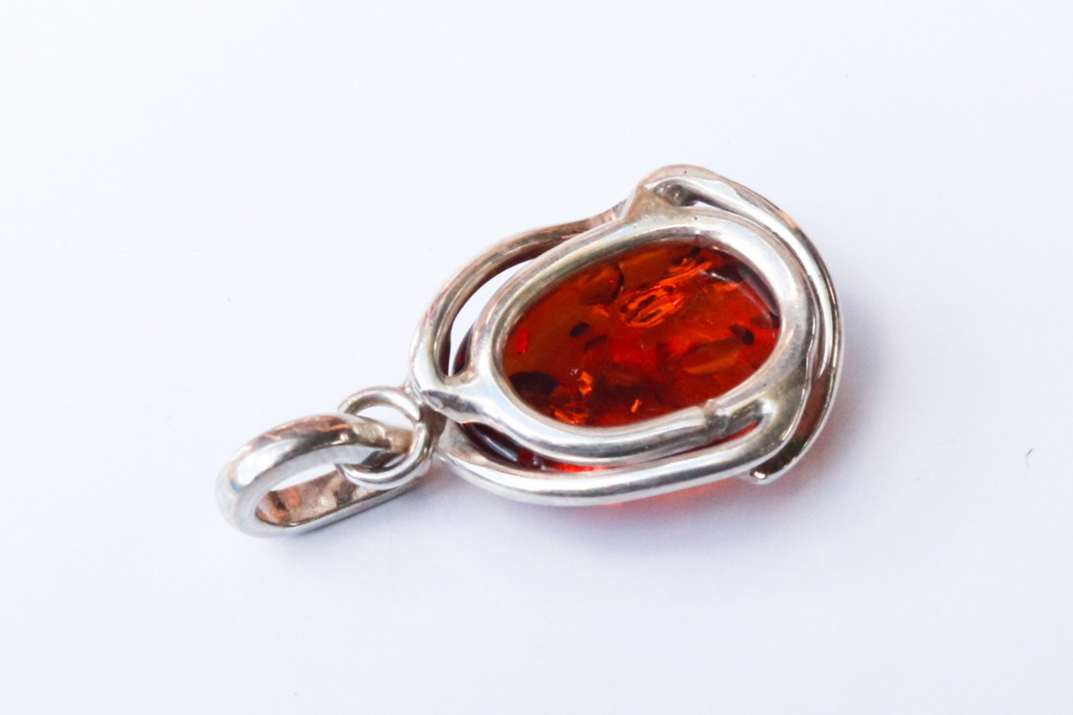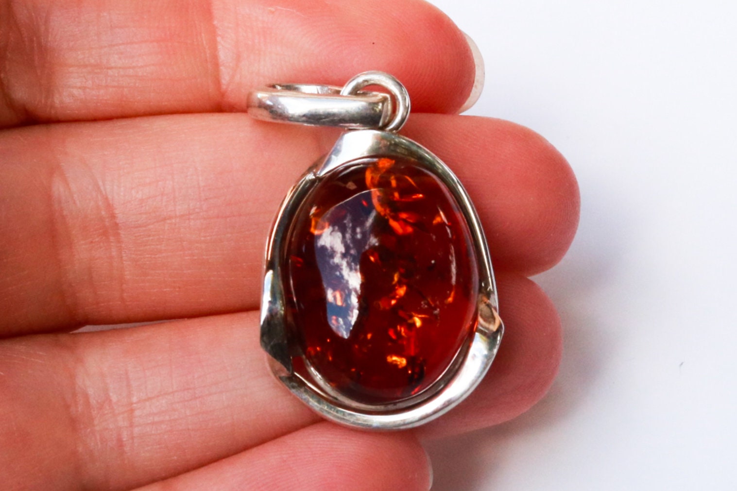 Baltic amber pendant in sparkling cognac color. Polished and set in 925 sterling silver