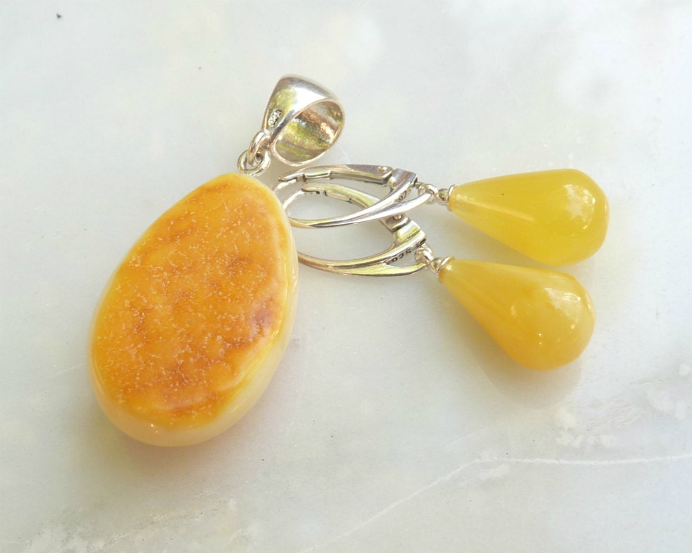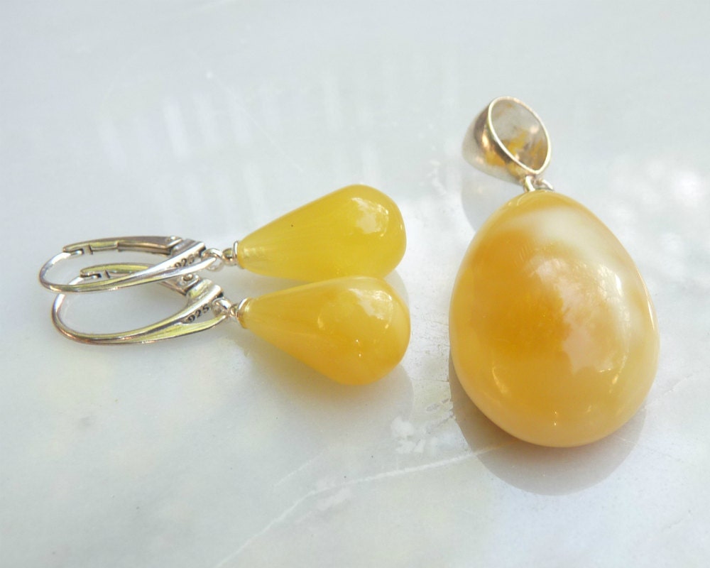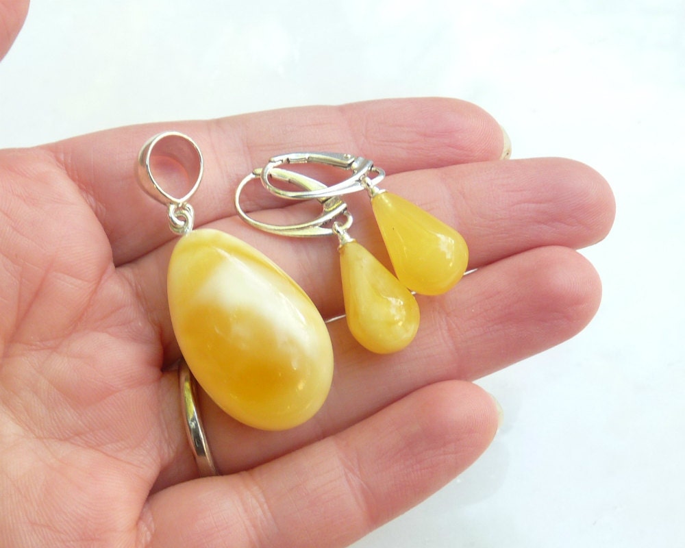 Baltic Amber hand carved drop earrings and pendant in milky butterscotch color. This is natural untreated amber. Set in 925 sterling silver.