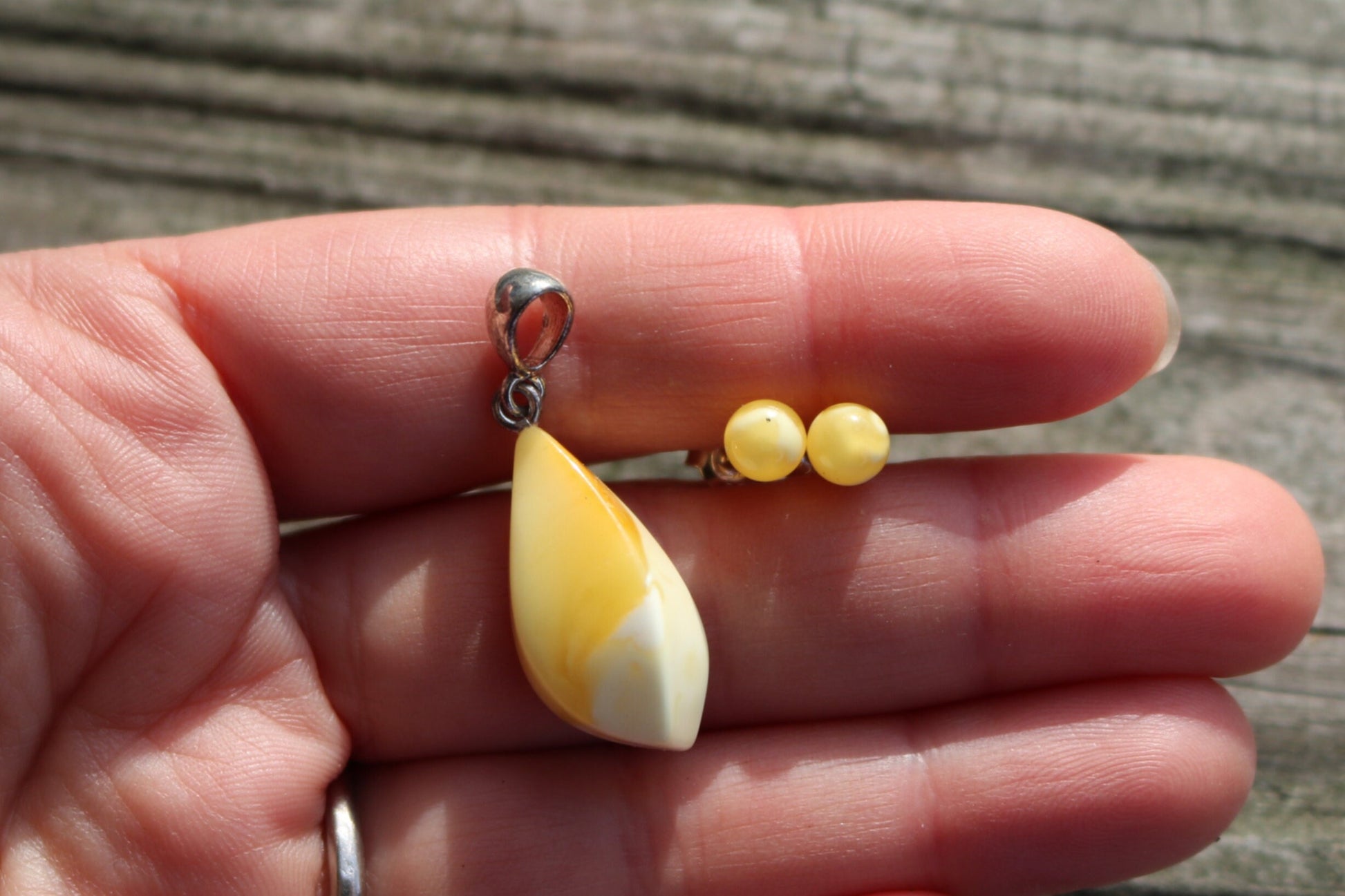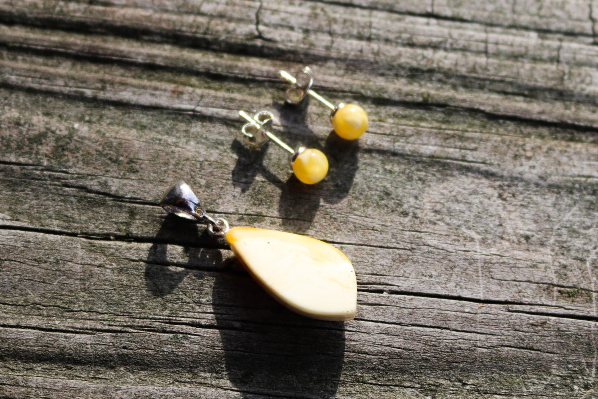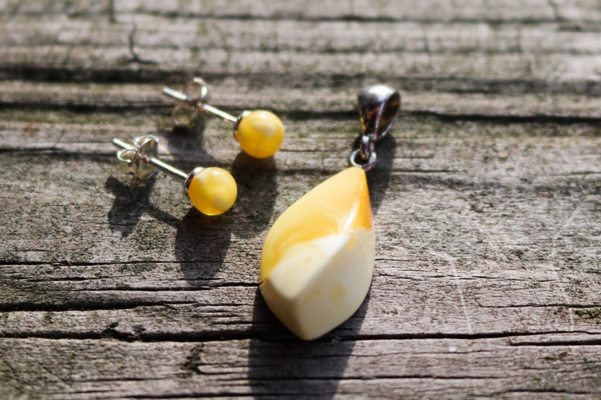 Beautiful Baltic Amber ball stud earrings and a pendant in butterscotch color with milky swirls. This is natural untreated color. Set in 925 sterling silver .