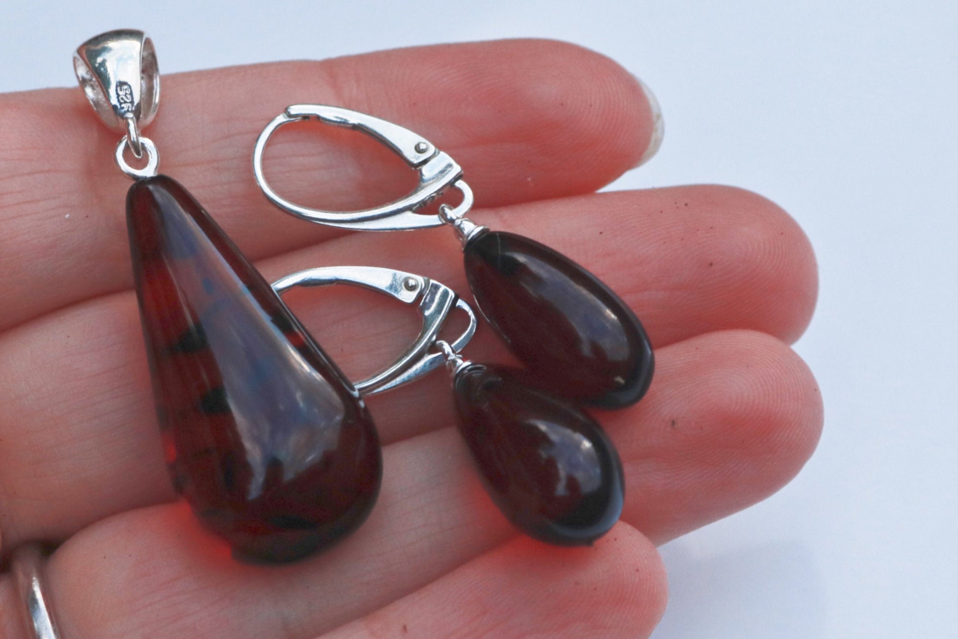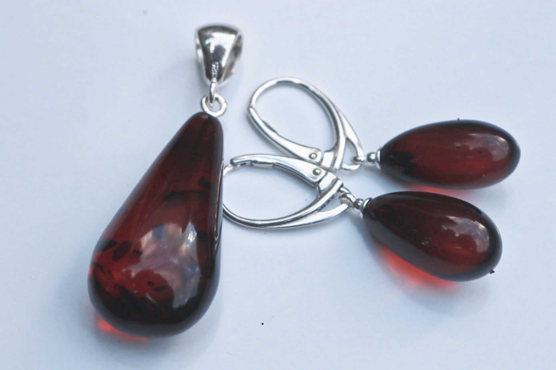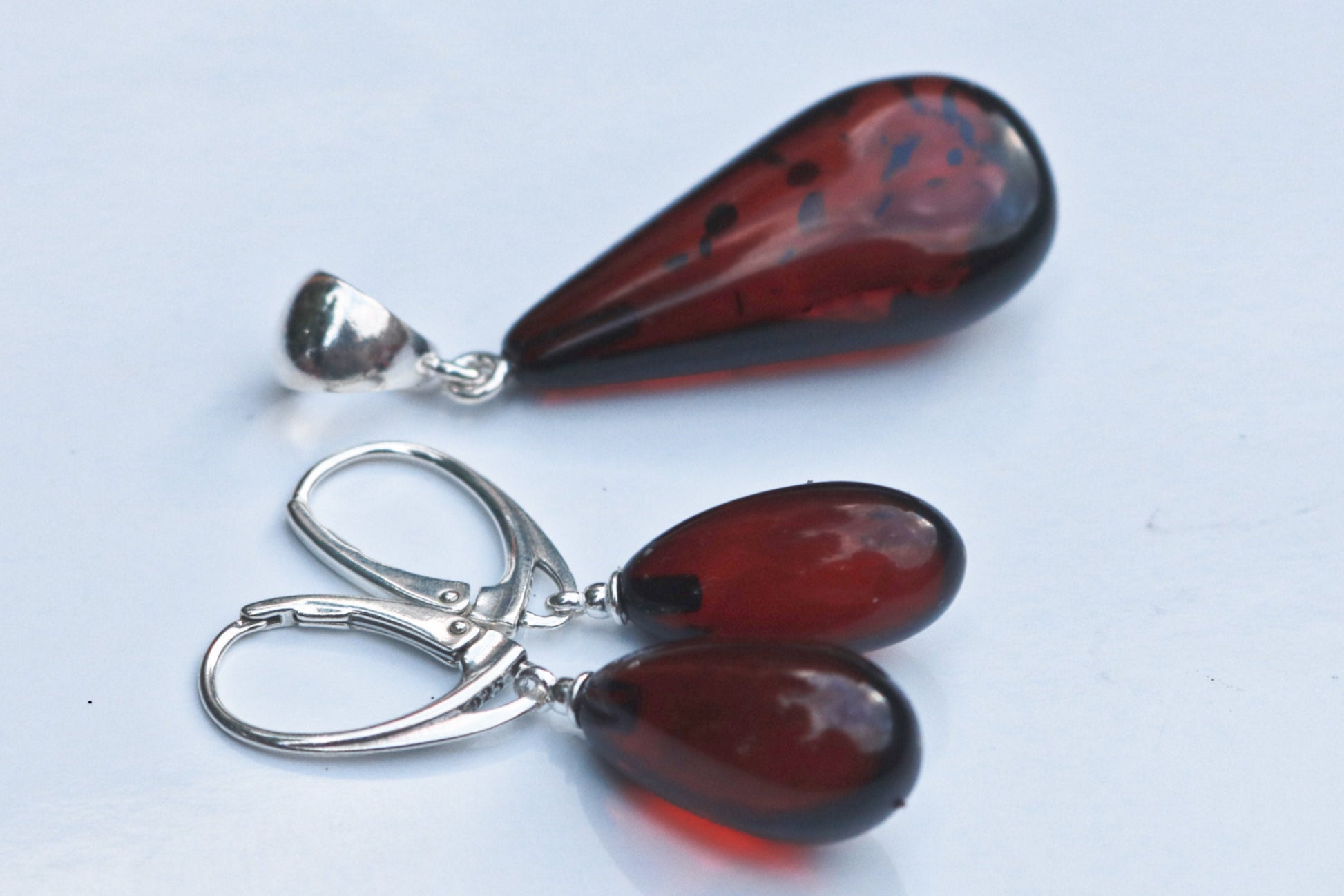 Baltic Amber Jewelry Set Cherry Drop Pendant and Earrings Natural 6.9 gram
