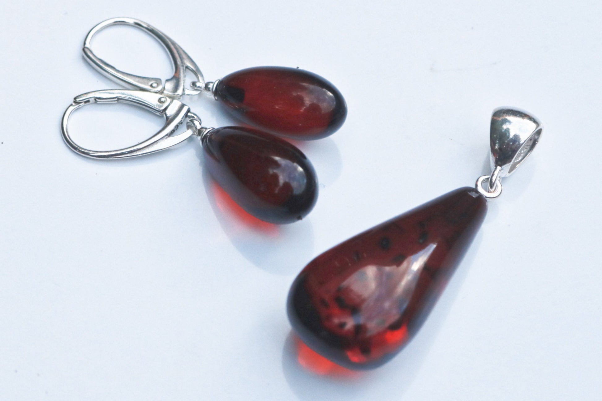 Baltic Amber jewelry set in natural untreated transparent cherry color.
