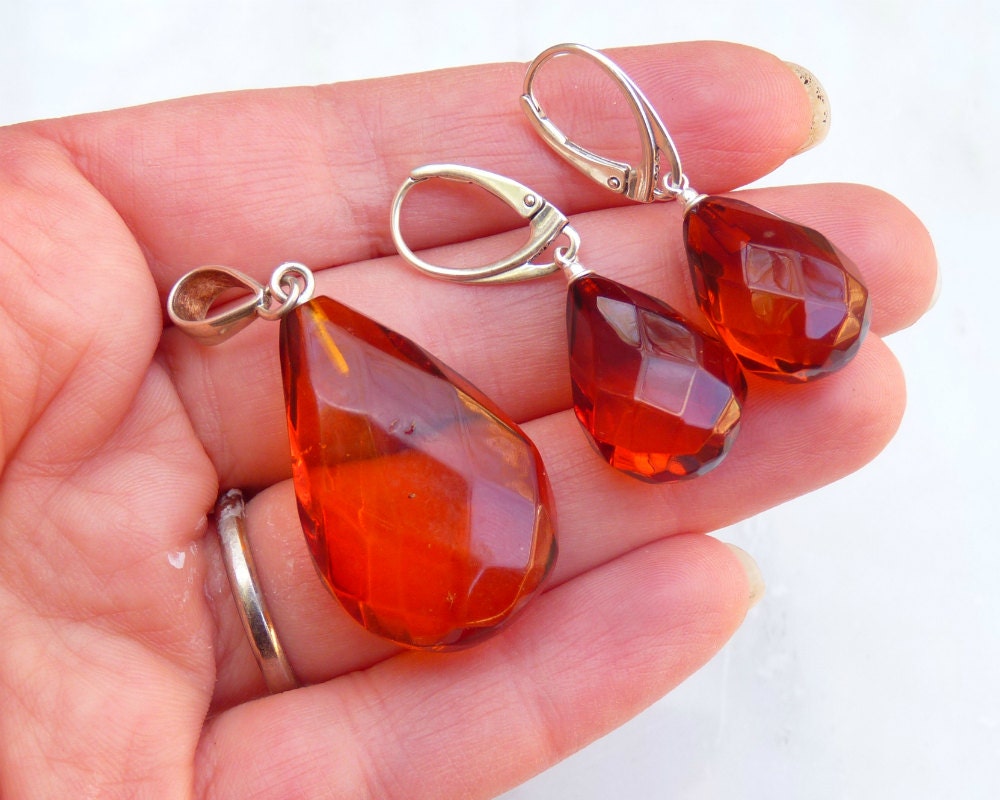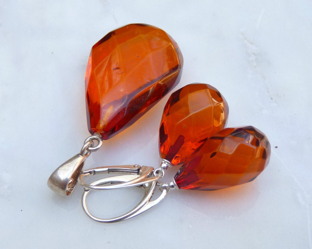 Baltic Amber Jewelry Set Cherry Faceted Pendant and Earrings Natural Drop 9.6 gram 925 Silver