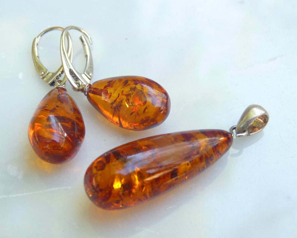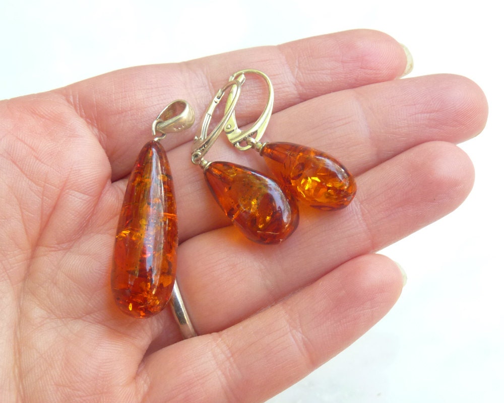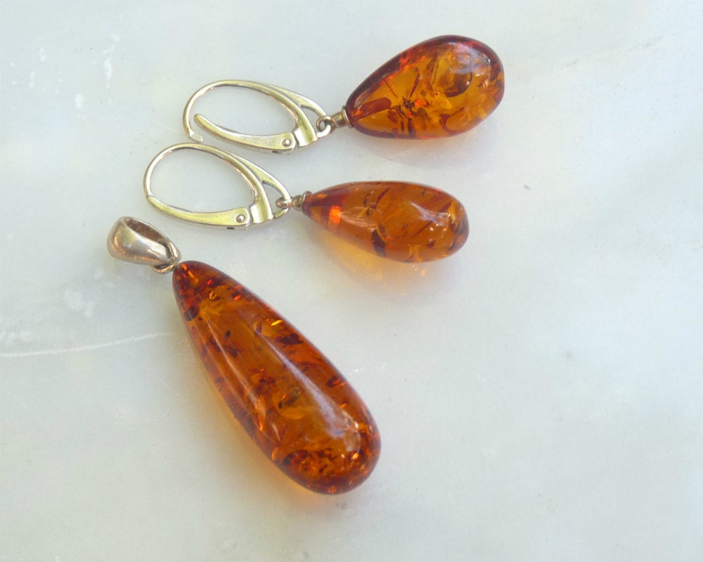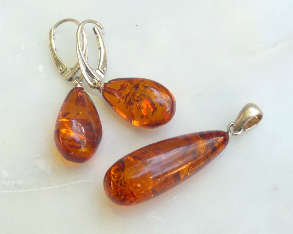 Baltic Amber hand carved drop earrings and a matching sparkling cognac color drop pendant.