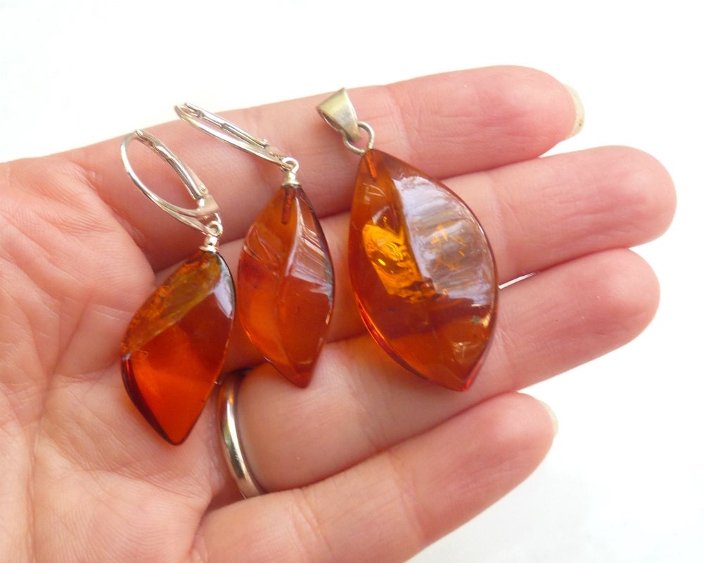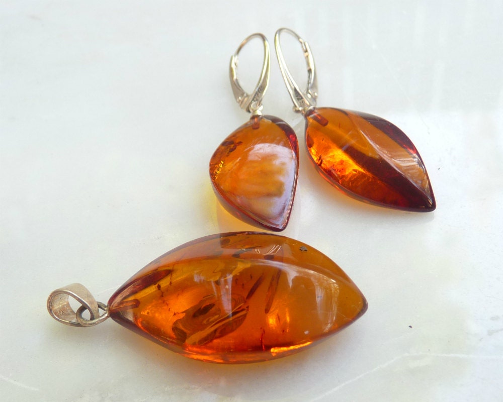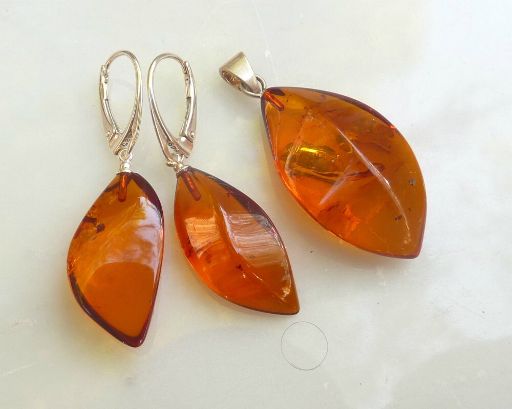 Baltic Amber Jewelry Set Cognac Earrings and Pendant Faceted Carved 7.7 gram 925 Silver