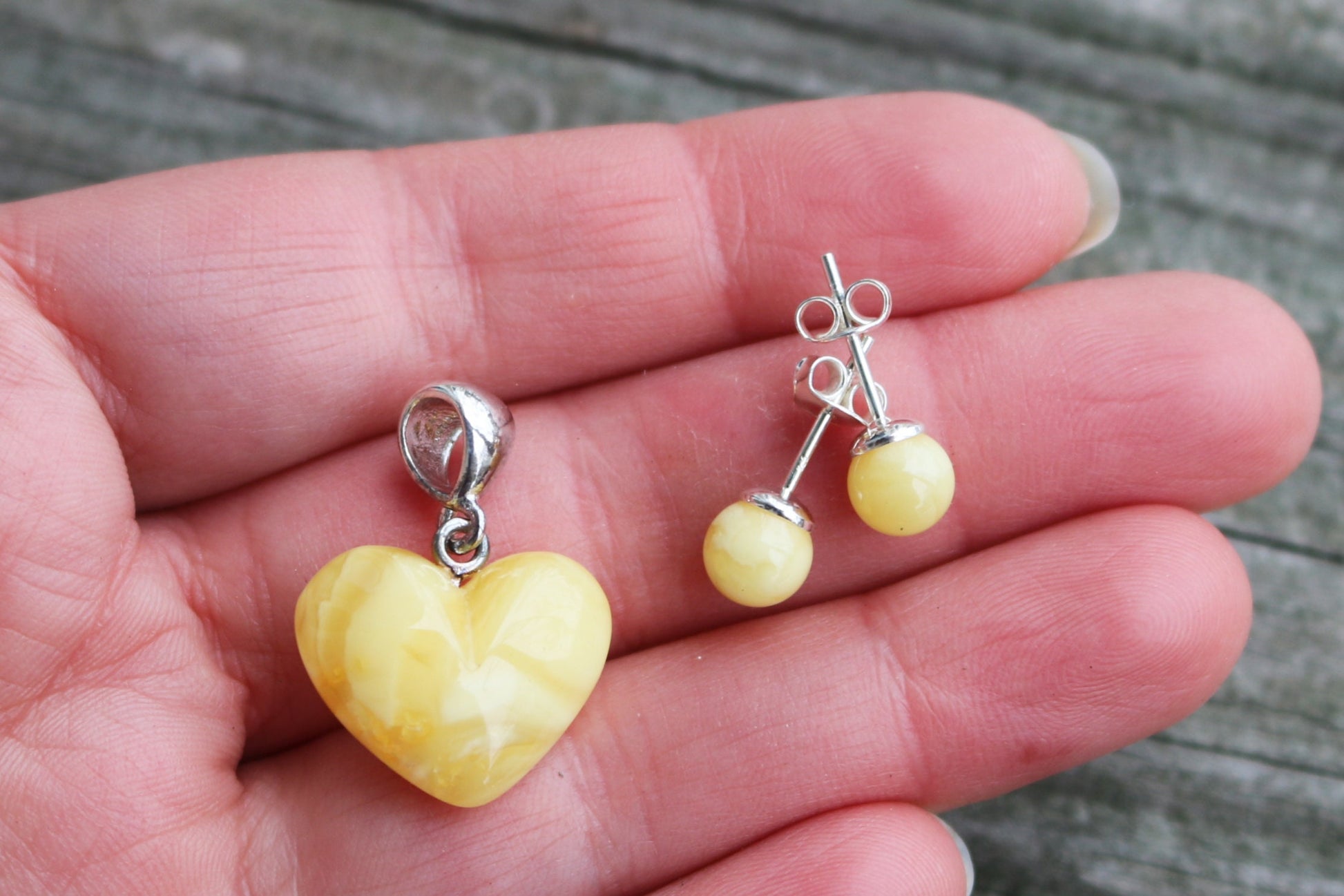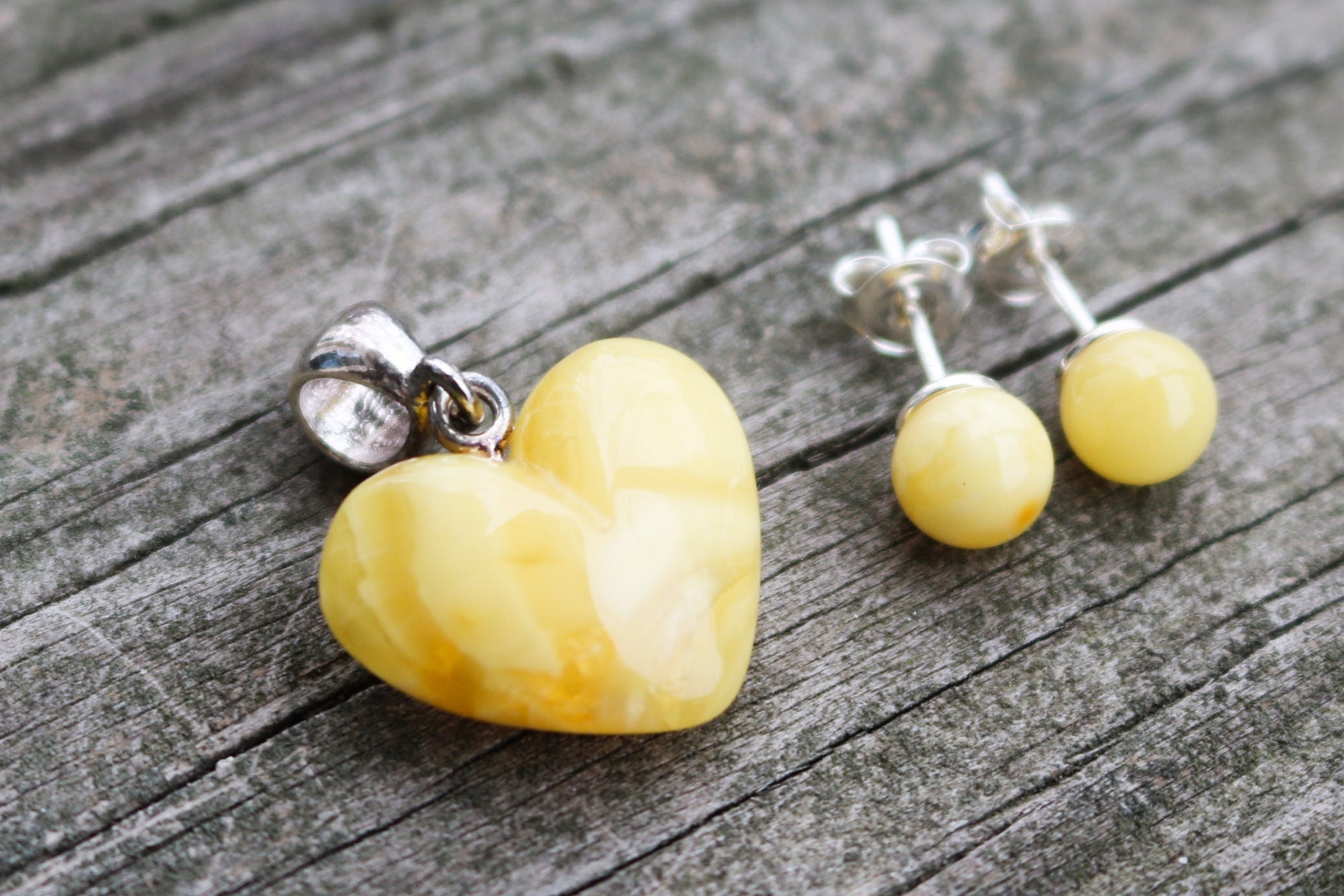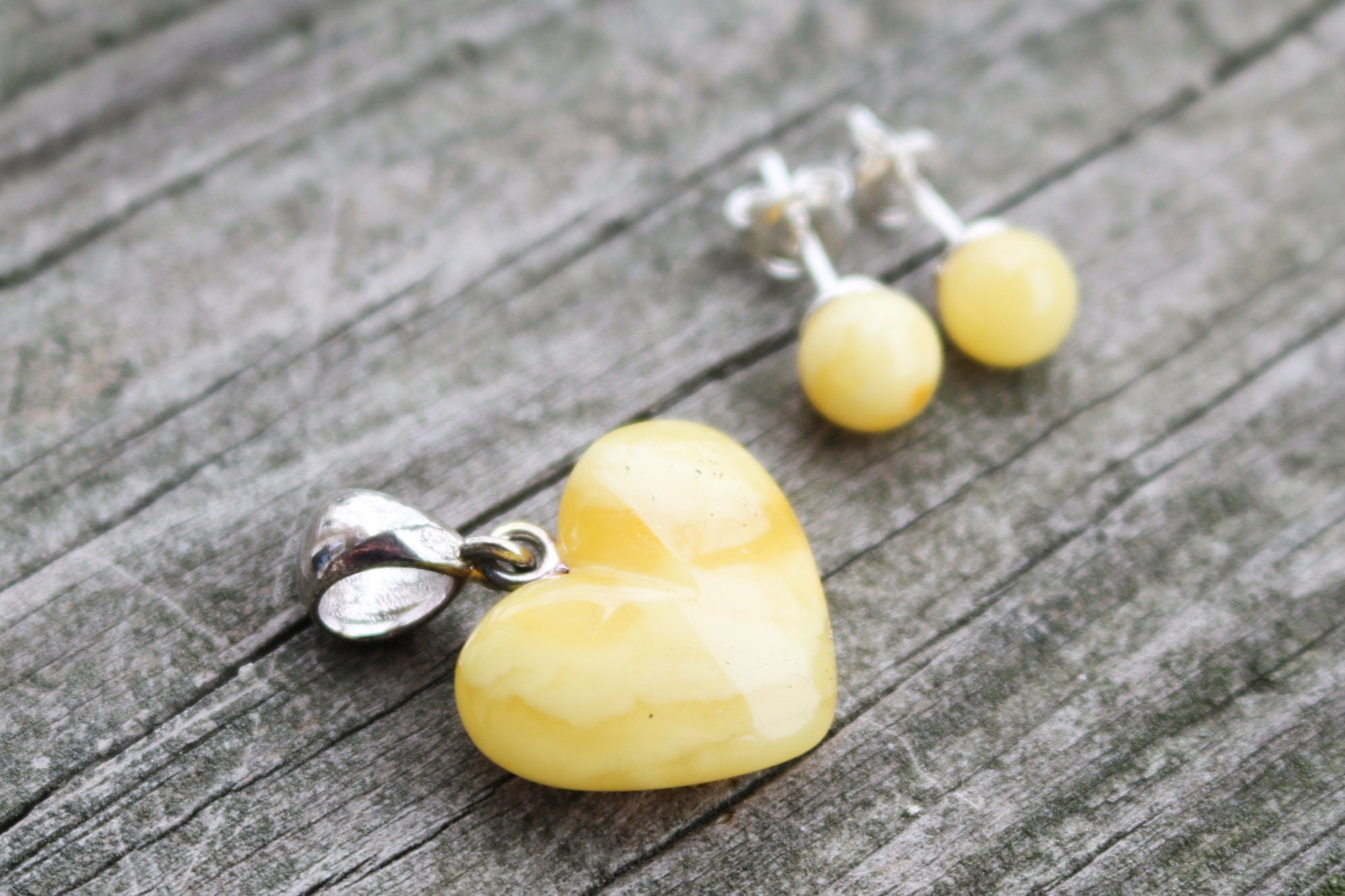 Baltic Amber Jewelry Set Earrings Heart Pendant Butterscotch Natural Untreated Yolk 3.1 gram 925 Silver