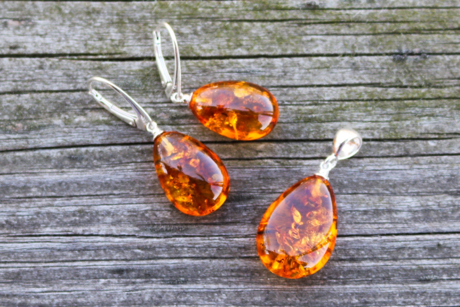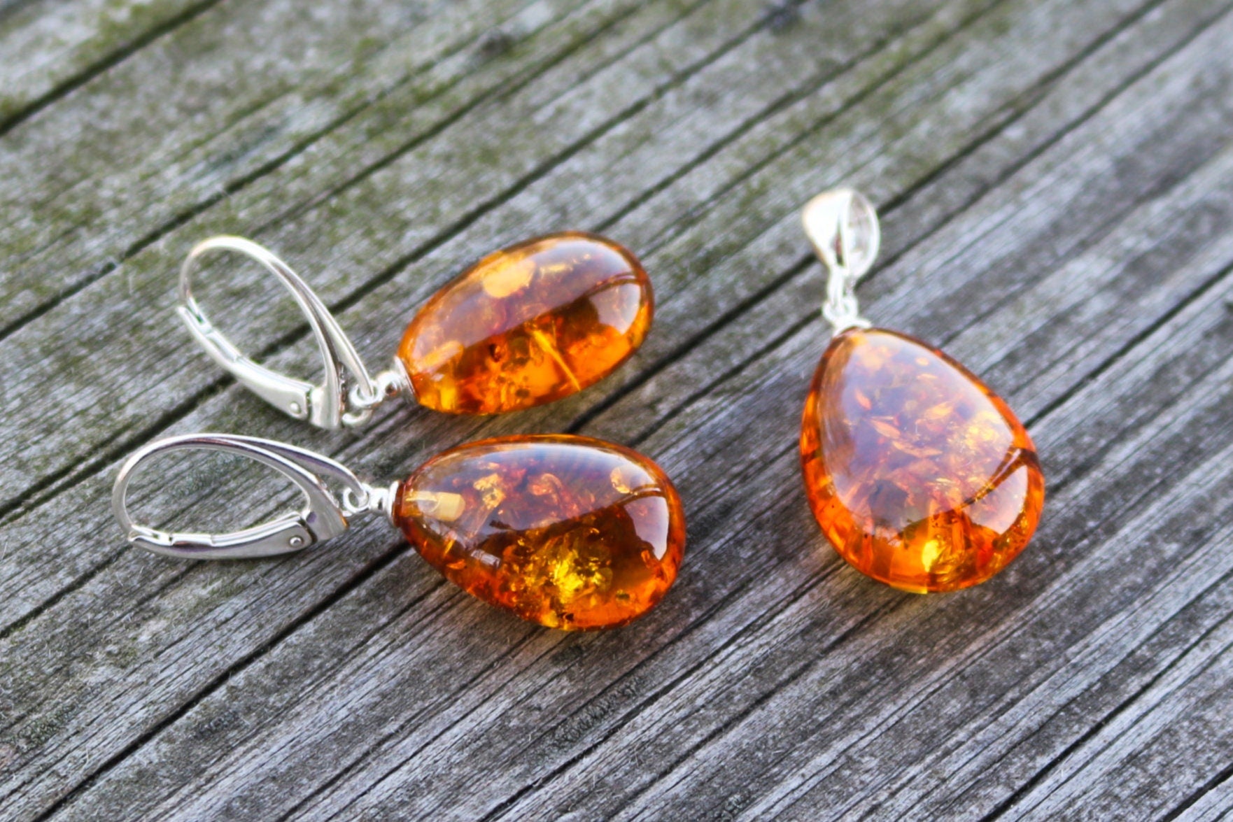 Baltic Amber Jewelry Set Honey Drop Earrings and Pendant Sparkling 7.2 gram