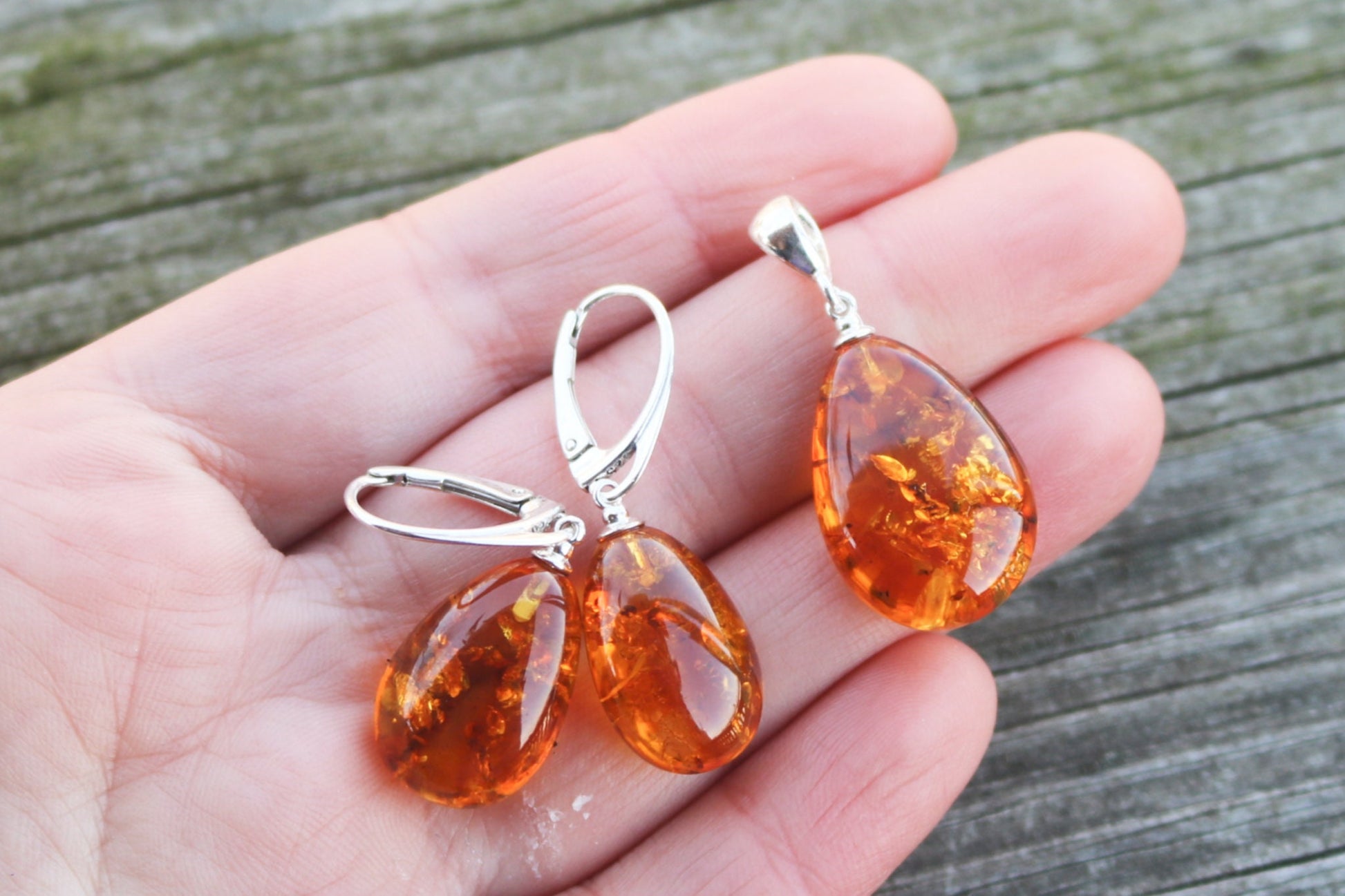 Baltic Amber hand carved sparkling honey earrings and a pendant.