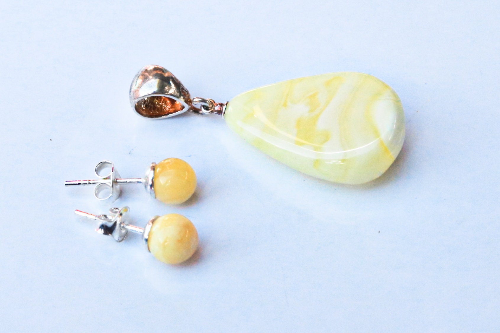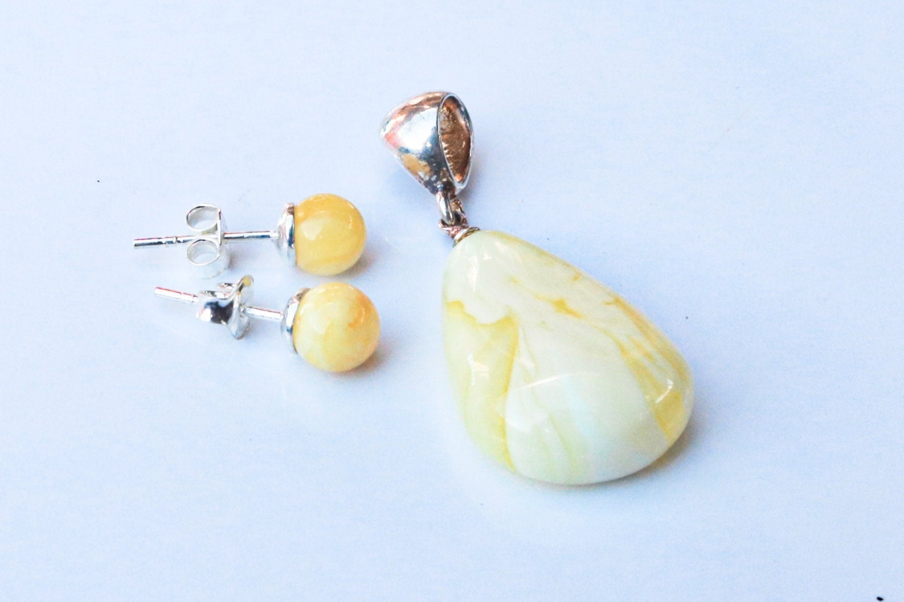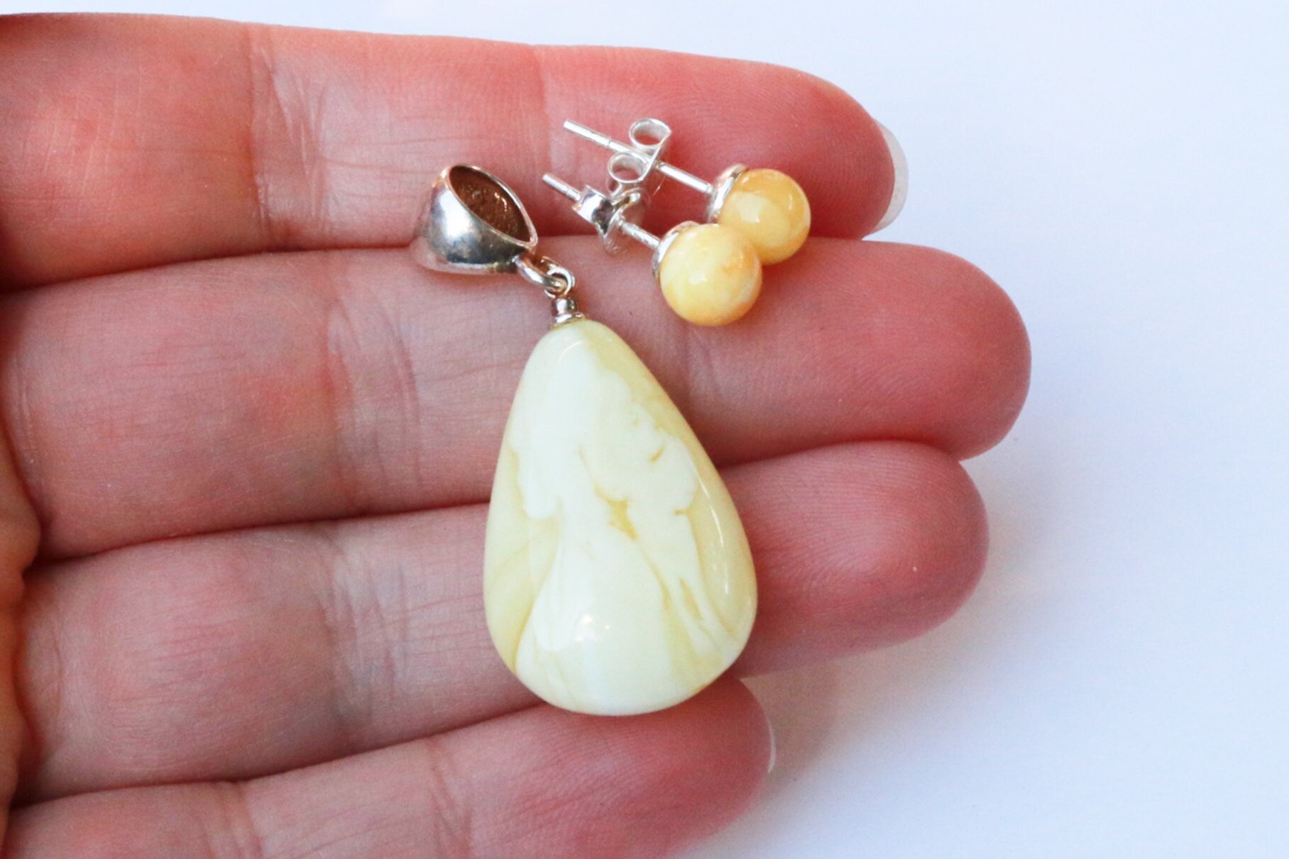 Baltic Amber Jewelry Set White Earrings and Pendant Milky Natural Butterscotch 4 gram 925 Silver