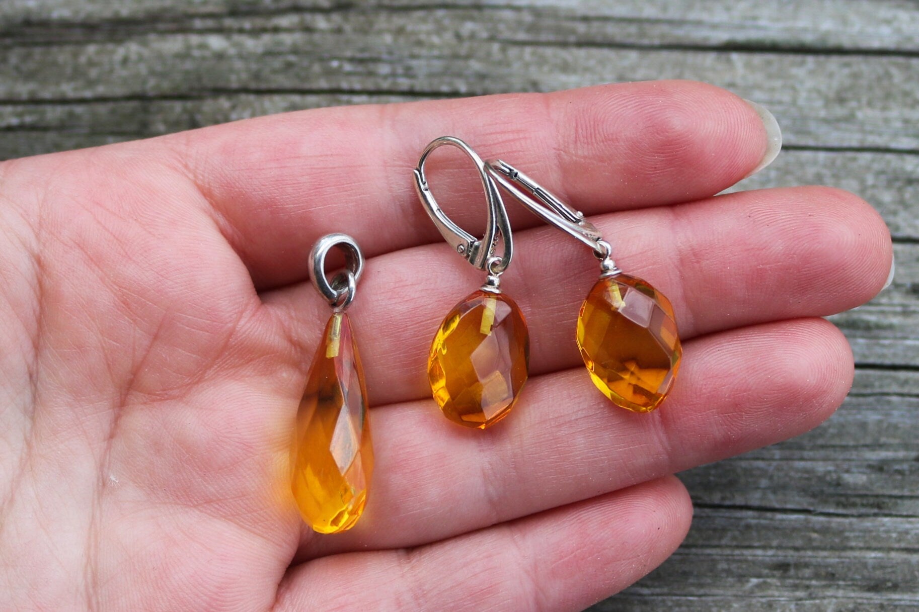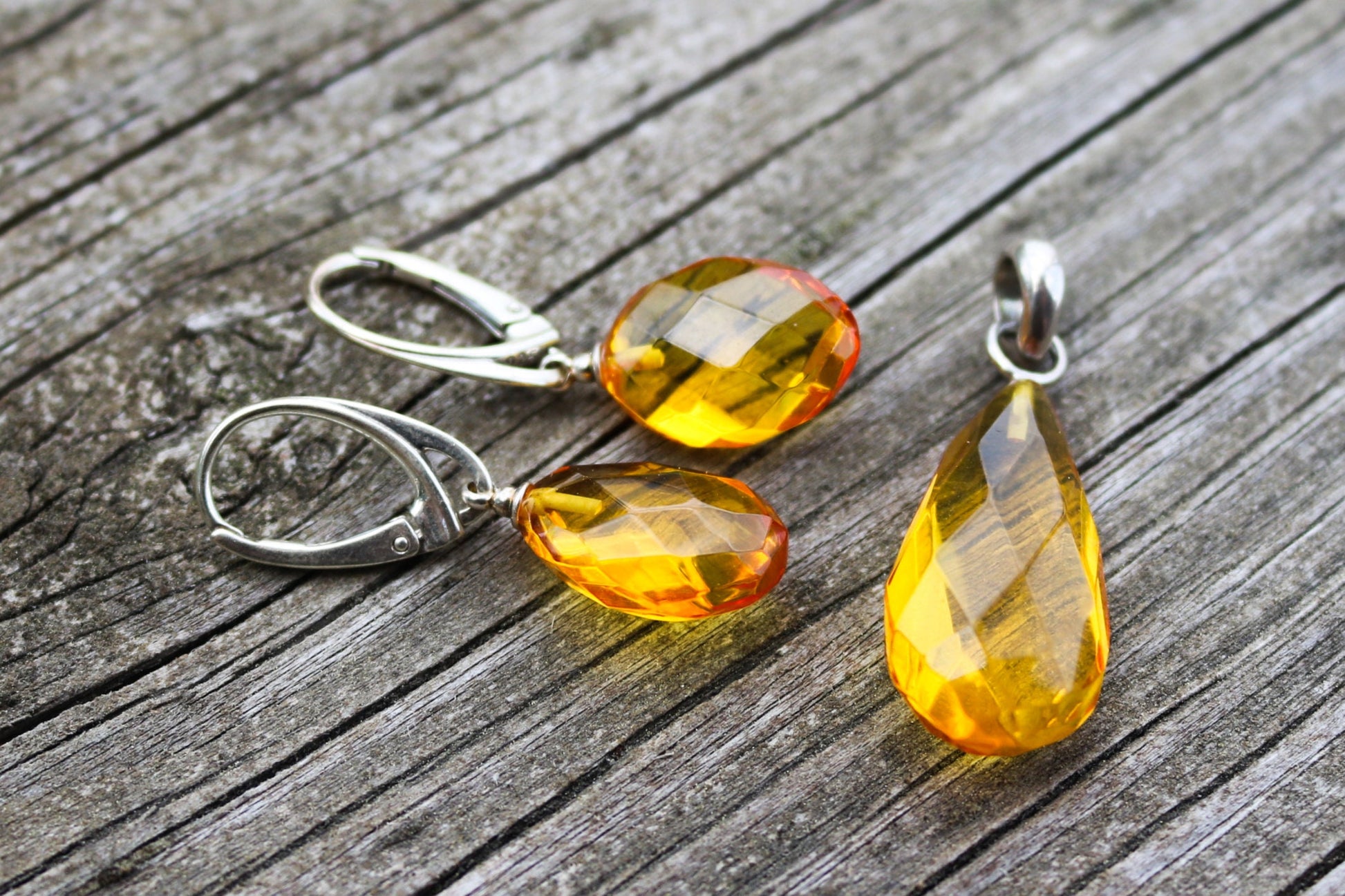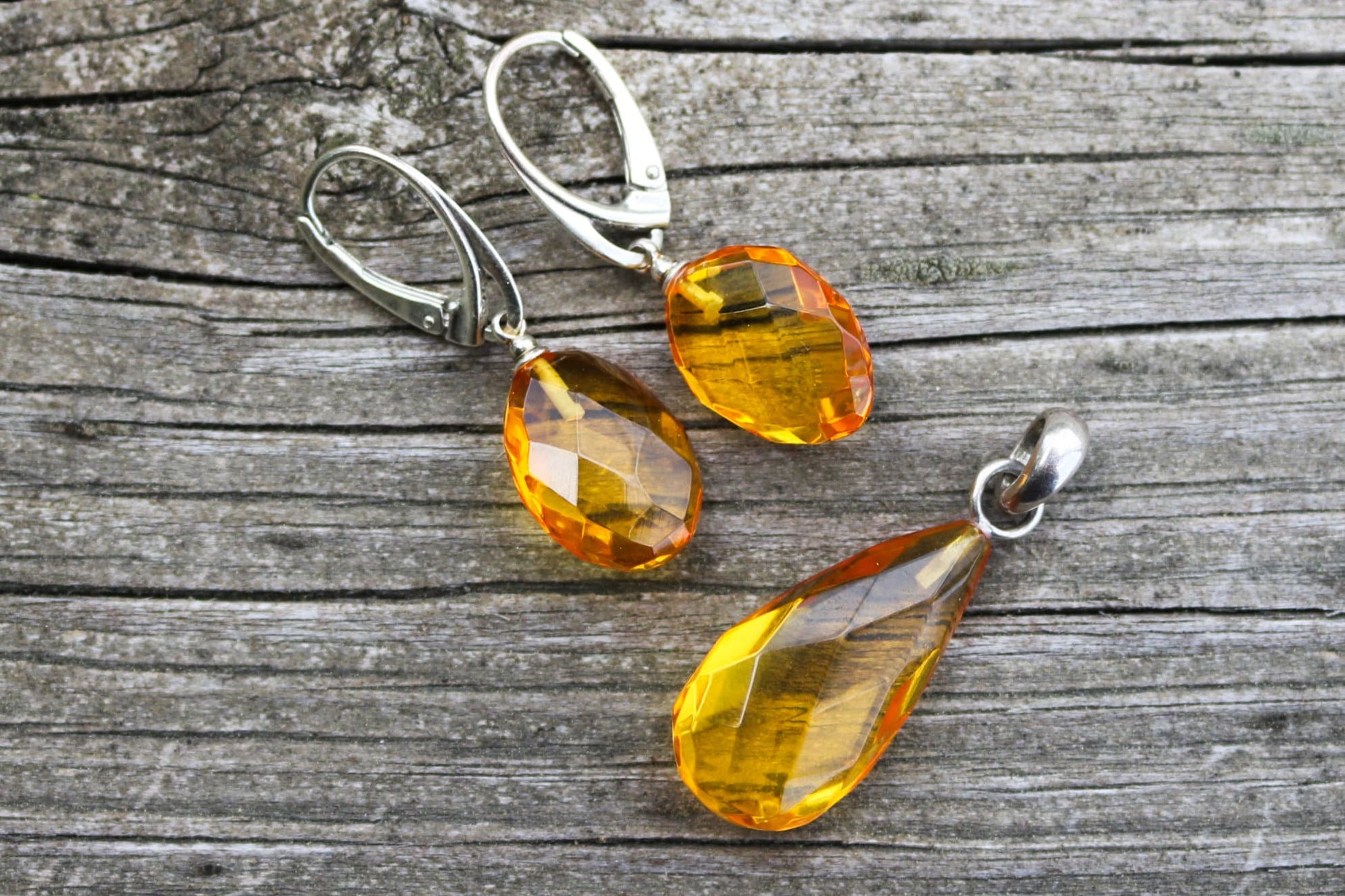 Gorgeous Baltic Amber hand carved and faceted earrings and a matching transparent yellow (lemon) color drop pendant. Set in 925 sterling silver.
