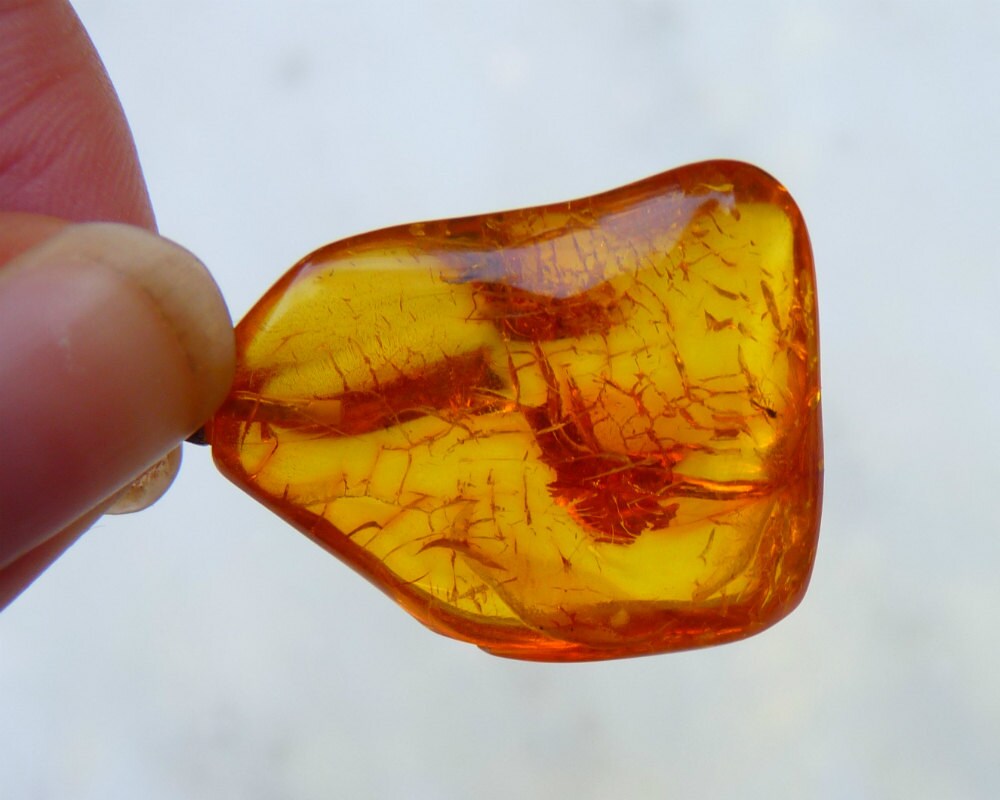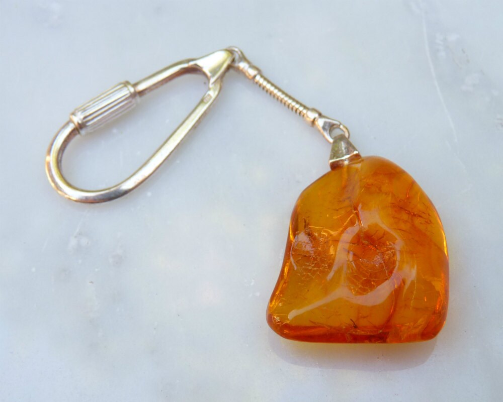 Baltic amber keychain with a few small fossil insects. Polished natural honey amber. Set in 925 sterling silver.