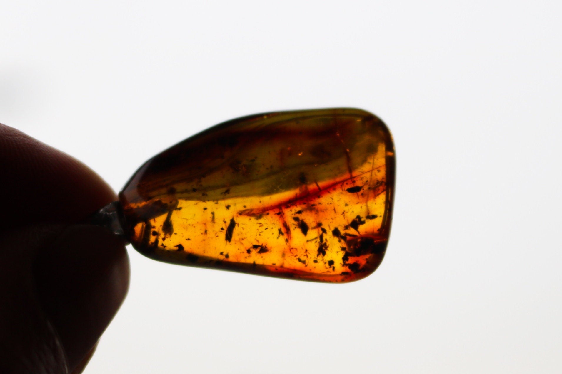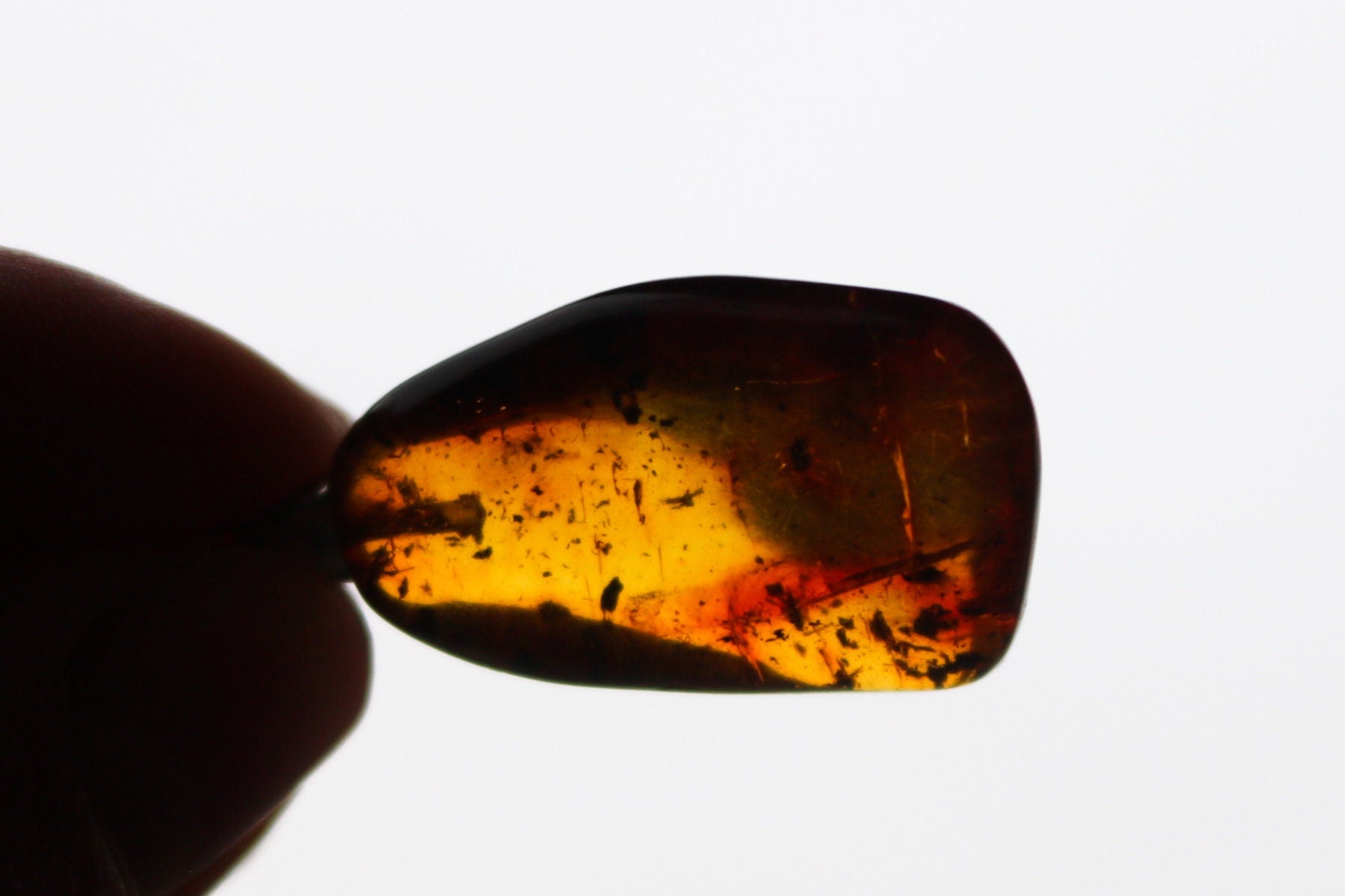 The amber stone measures 1.1 x 0.74 x 042 inch (2.8 x 1.9 x 1.1 cm)