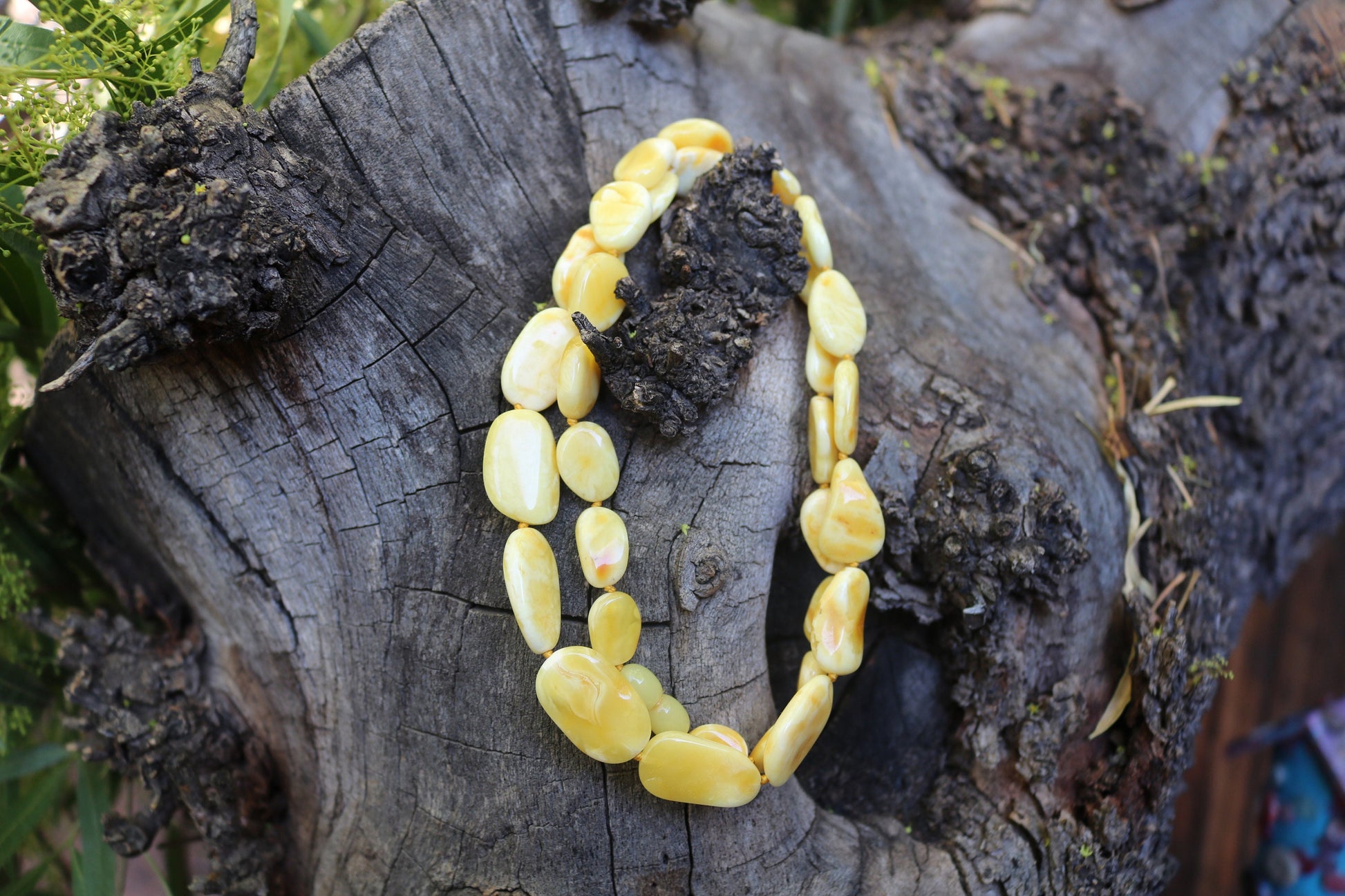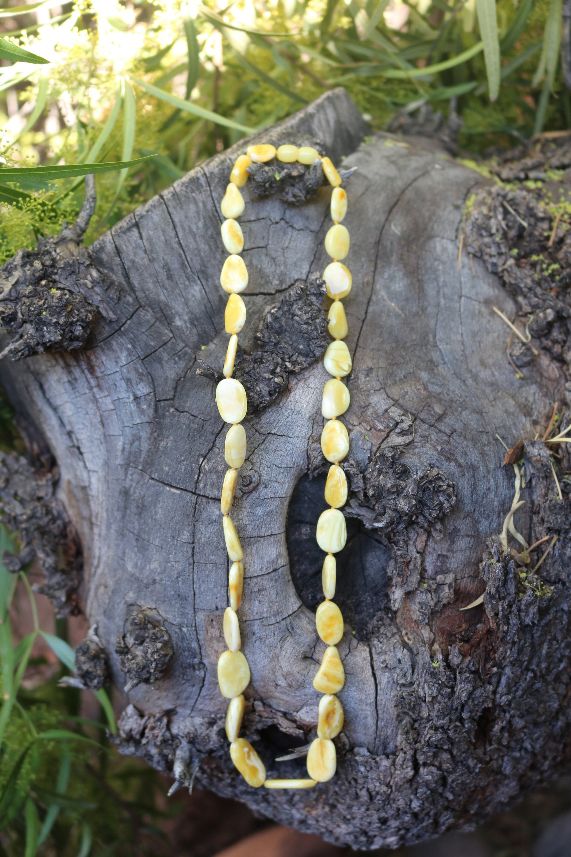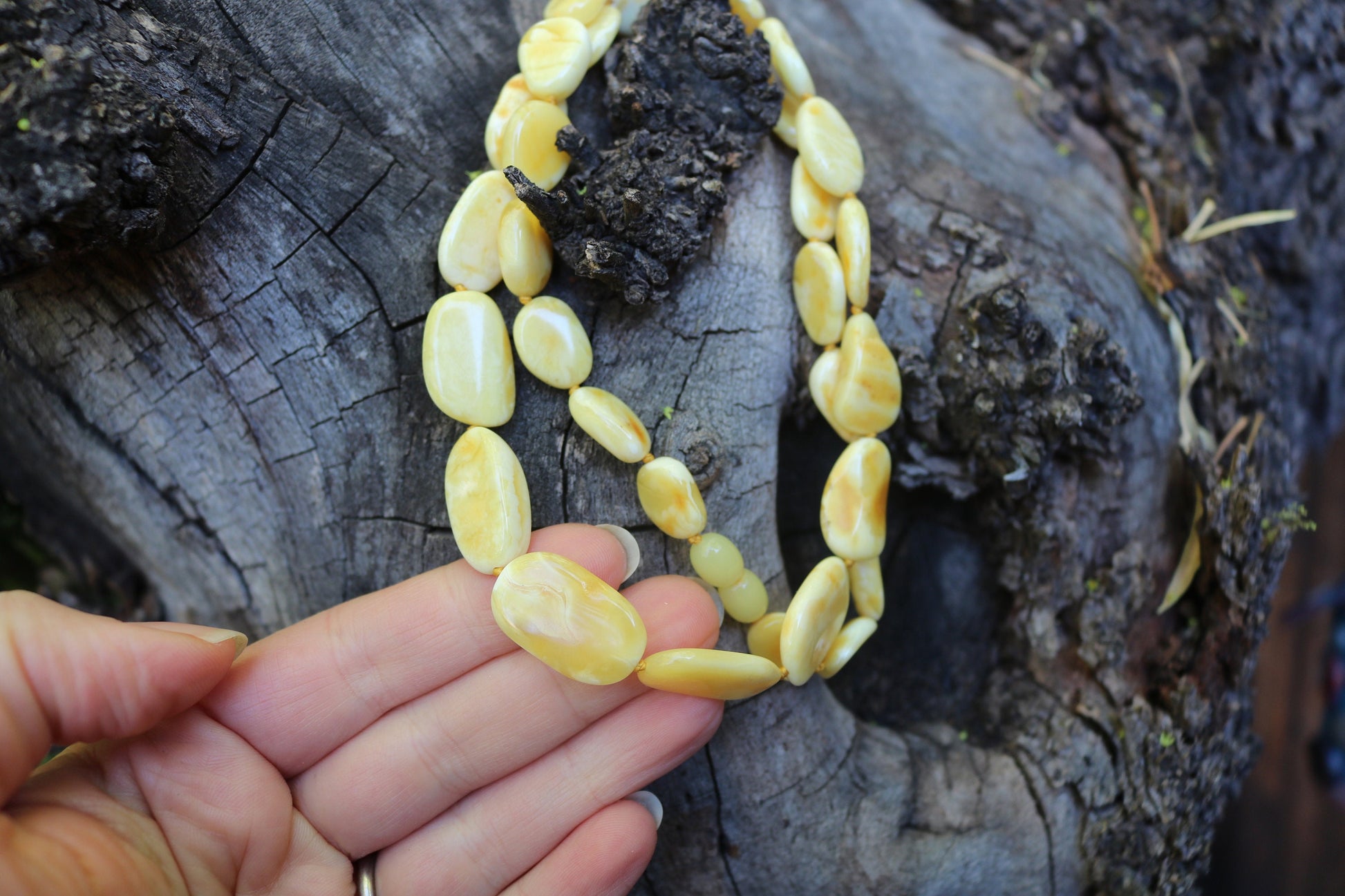 Baltic Amber necklace made out of natural untreated polished beads in butterscotch color with milky swirls. The beads measure between 0.55 inch (1.3 cm) and 0.89 inch (2.3 cm).