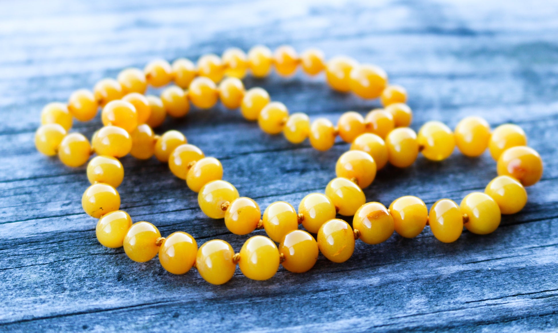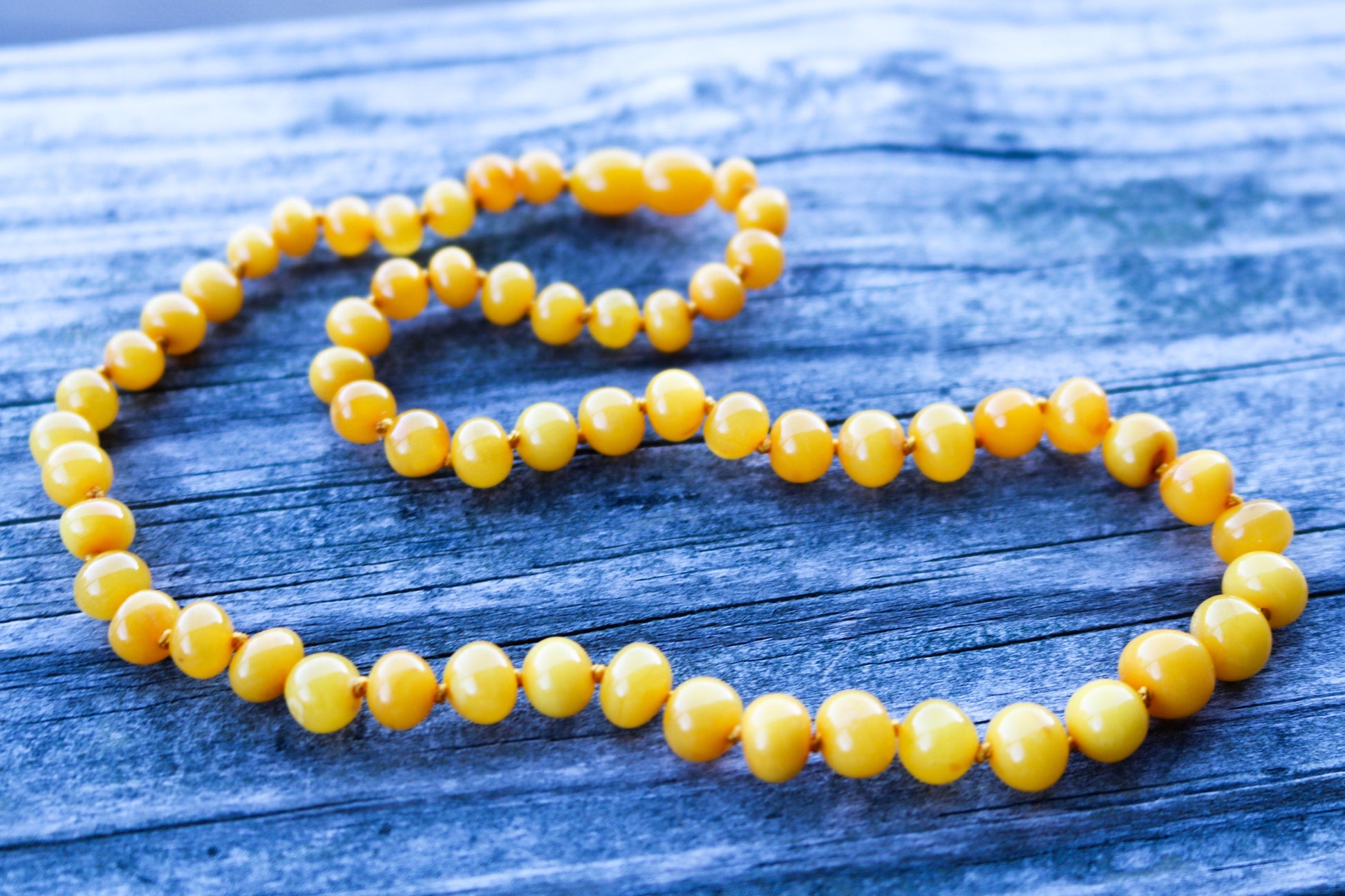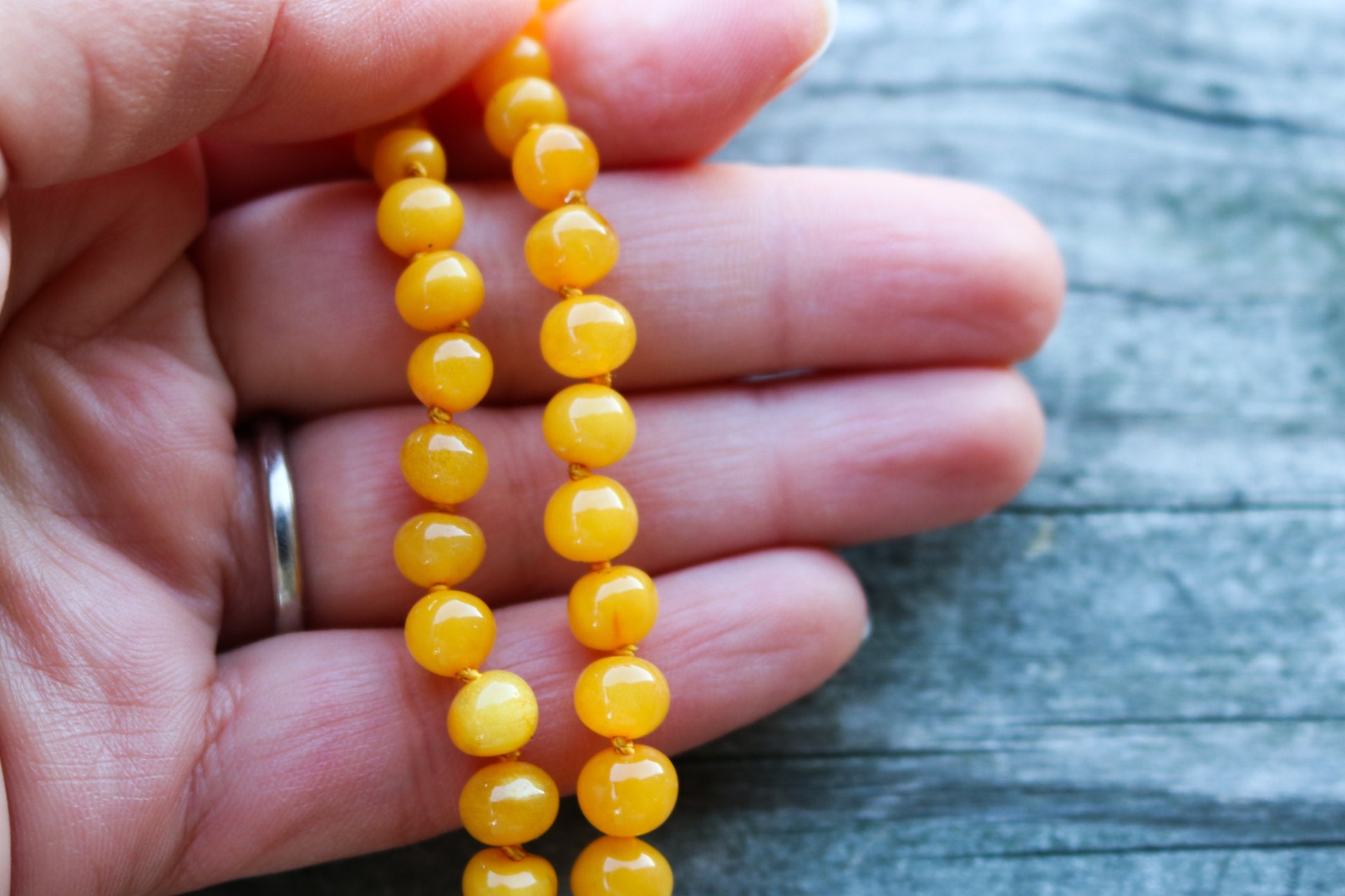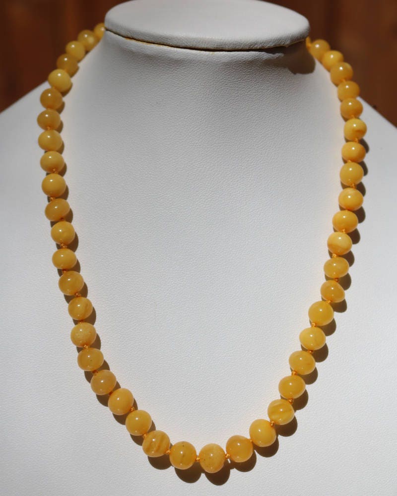 Baltic Amber necklace made out of antique butterscotch (yolk) color beads beads in rounded baroque shape. The beads measure between 0.23 and 0.34 inch in diameter (0.58 and 0.9 cm).
