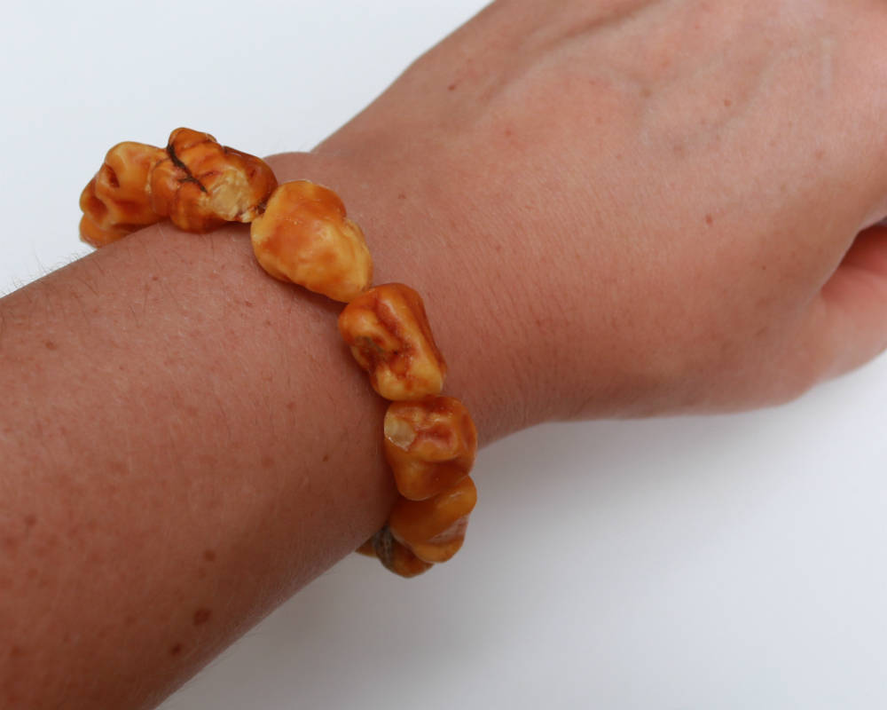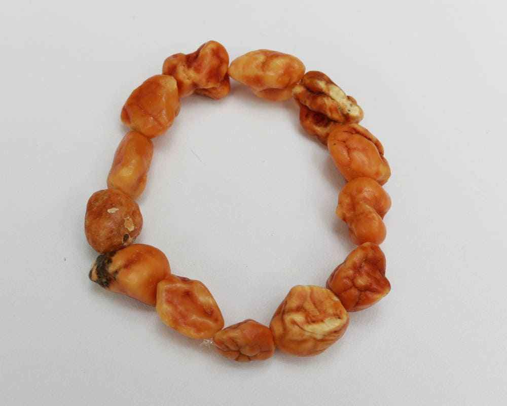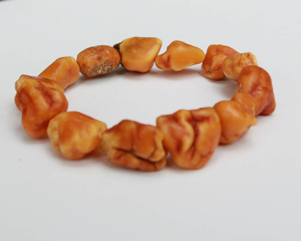 Baltic Amber bracelet made out of raw nodules in opaque caramel color. Irregular slightly rounded shape.