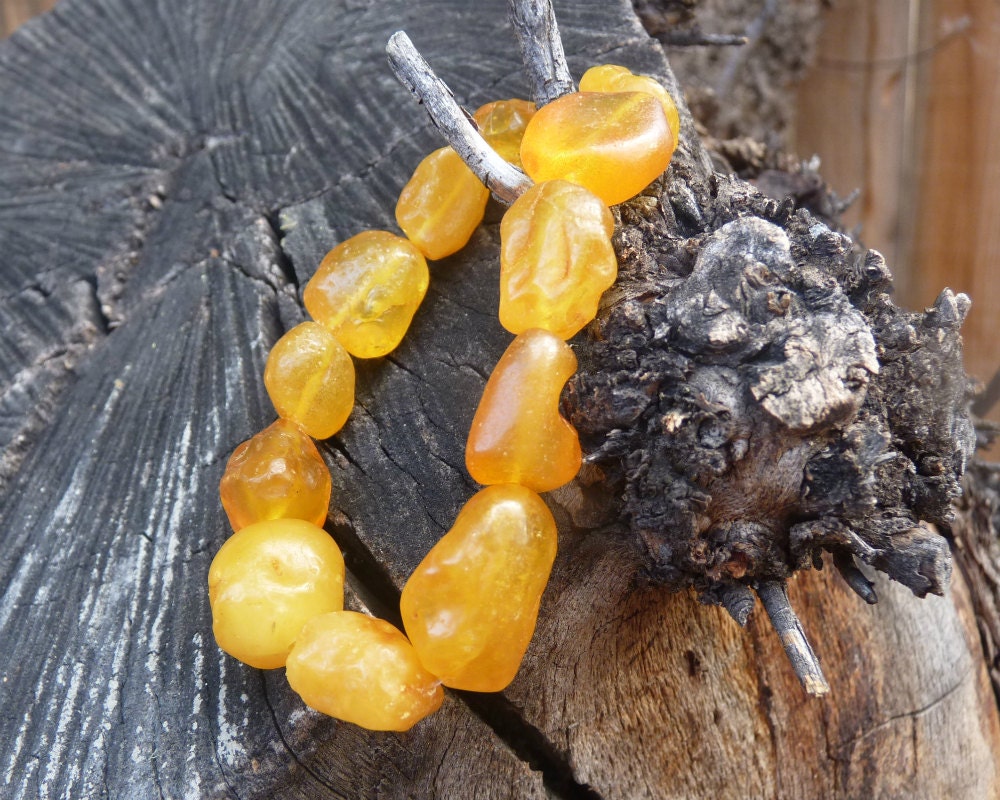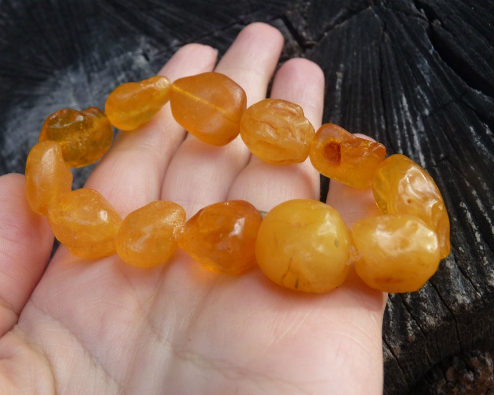 When being mined, the drops have greyish crust which is removed my cleaning and slight polishing. They then get smoother and more pleasant and comfortable to wear on skin. The color varies from bright honey to caramel and yolk. After cleaning and polishing the transparent drops get shiny look while opaque drops remind of candies. The surface is smooth, but irregular. The shape sometimes remind of the one of a walnut.
