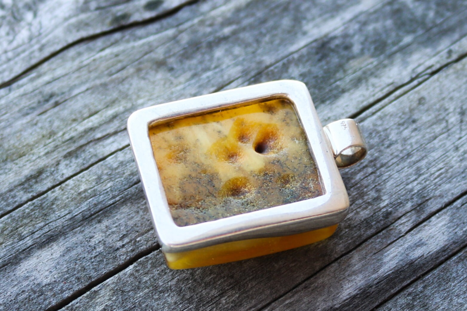 Baltic amber pendant in cloudy butterscotch color, hand carved and set in 925 sterling silver.