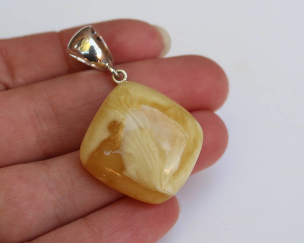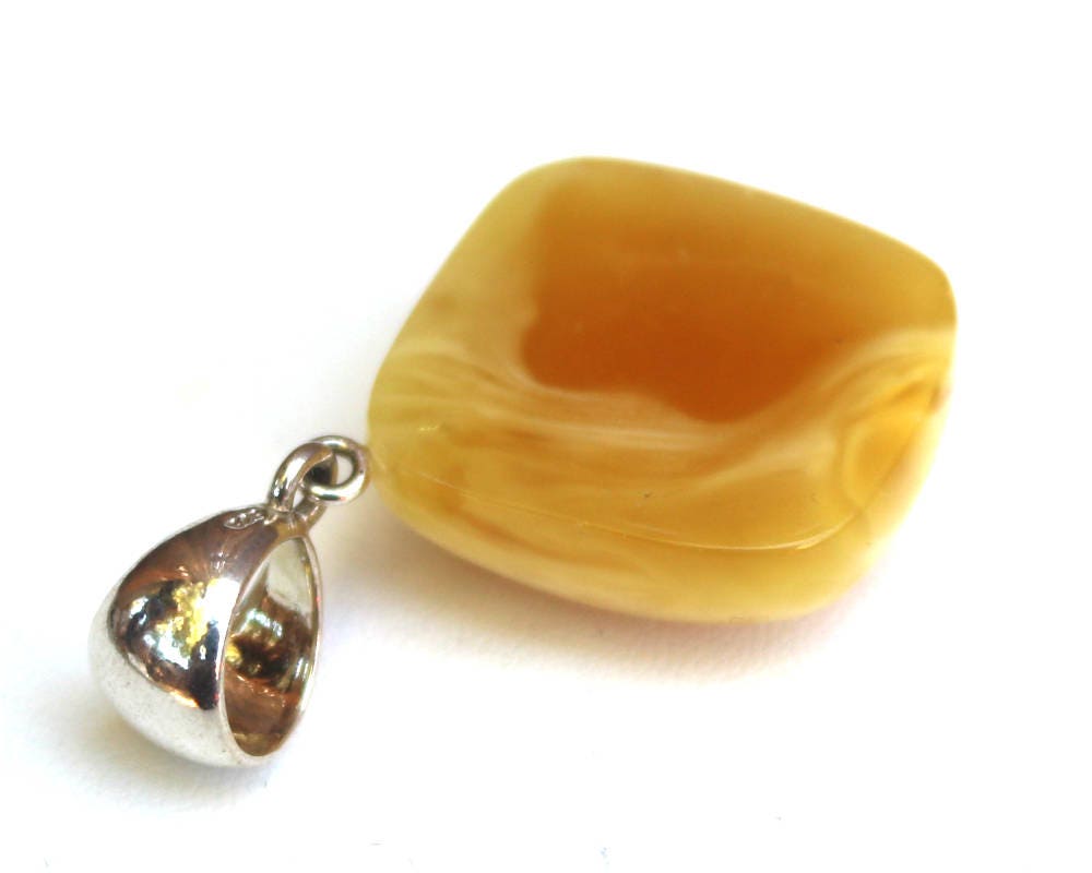 Baltic amber pendant in natural untreated butterscotch color with milky swirls. Set in 925 sterling silver.